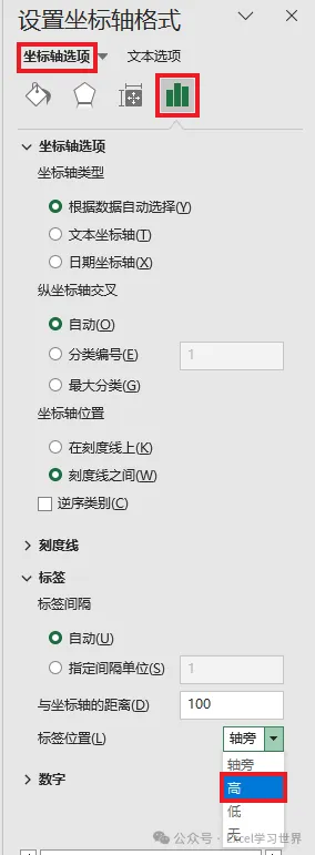 5. 在“设置坐标轴格式”区域选择“坐标轴选项”–>“坐标轴选项”–> 点开“标签”区域,将默认的“轴旁”选项修改为“高”