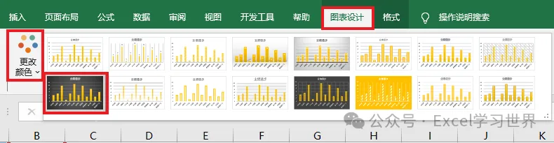6. 选中图表 –> 通过工具栏的“更改颜色”和“图表设计”修改图表样式