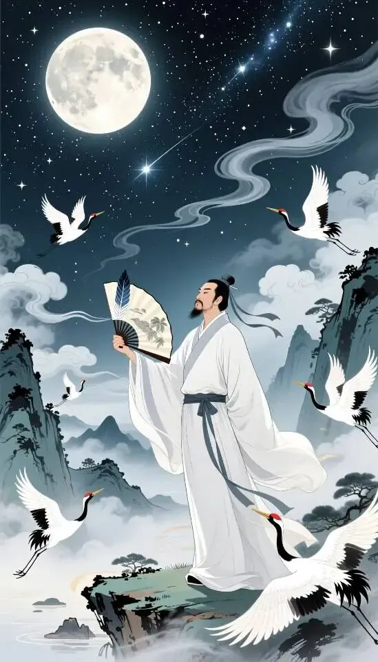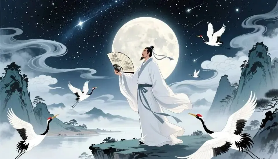 古代诗人李白,身穿飘逸白袍,手持羽扇,站在月光下的山水之间,背后是浩瀚星空和流动的云雾,周围环绕着飞舞的仙鹤和飘渺的仙气,画面充满诗意与仙境般的氛围,水墨风格与现代数字艺术融合,细腻的笔触与梦幻的色彩交织。