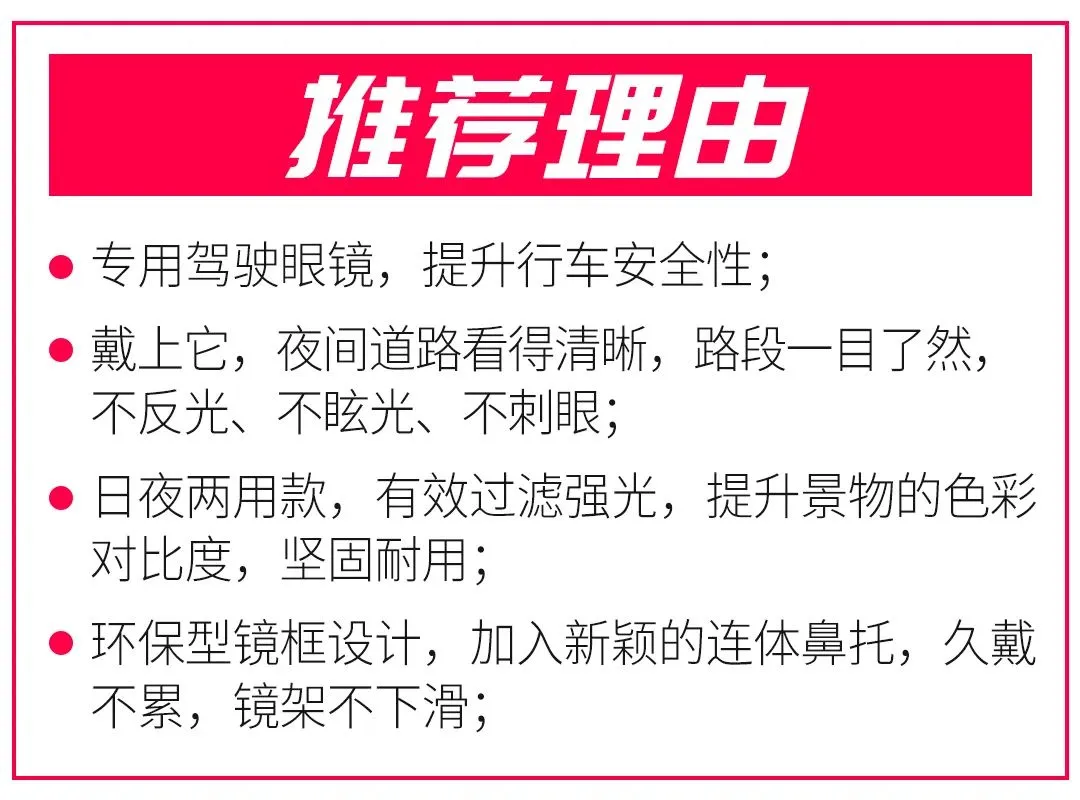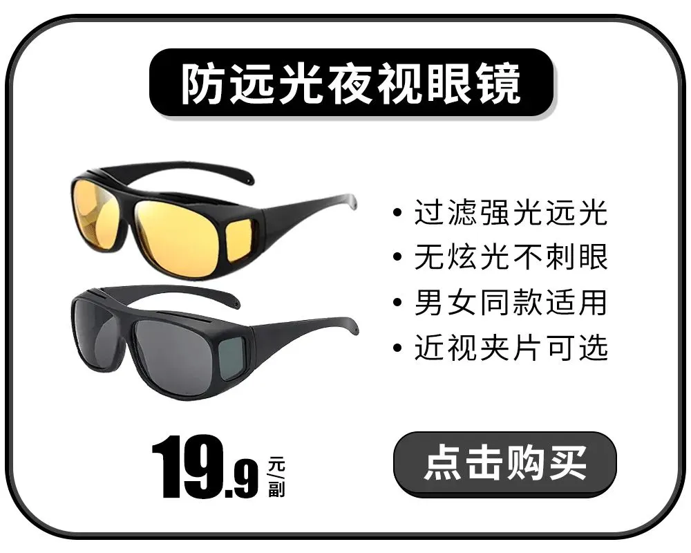 老司机夜行神器,戴在眼睛上的“大灯”! 每年有不计其数的人死于车祸 可能只是一瞬间的眨眼,就导致了悲剧的发生! 据权威部门统计 夜间行车中30-40%车祸 源于滥用远光灯 是眼睛和夜间驾驶安全第一杀手 开车不易,事故谁也不想发生! 氙气灯在别人车上,安全要自己掌握 如果你改变不了别人的用灯习惯 那就改变自己驾车的视野吧 小编推荐这款火爆全网的夜视镜 黑科技纳米增亮原理,夜晚开车更清晰! 安全驾驶不分昼夜 强烈阳光下可提高视野清晰度 雨天,雾天,雪天,视野更清晰 ↓点击下方卡片,立即入手 夜视│专用驾驶眼镜 带上它,夜晚视野变清晰 路段一目了然,不反光、不眩光、不刺眼 晚上也像白天开车一样,完美极了! 夜间的道路看得清晰 可以继续像白天一样做老司机 无论是变道,还是看路牌都毫无压力 哪怕是高速还是国道都从容应对 佩戴上去后,遇到没有路灯的道路 凭借车灯和眼镜的配合 能看清周围事物,避免悲剧发生 值得注意的是,不仅适合开小汽车使用 骑摩托,或是自行车都能佩戴 让你整个视野变清晰,提高安全性 除了夜晚行车远光灯照射外 阴天、雨天也是事故发生的高峰期 因为路面太暗看不清来往车辆 撞车、追尾,导致会突然发生紧急事件 现在有了这款专用夜视镜 即便在阴雨天也可以很舒适的开车了 无论是雨天还是阴天 都可以提高视野清晰度 ↓点击下方卡片,立即入手 日用│专用驾驶眼镜 针对烈日炎炎下行车的车友 我们还特别推出一款白天专用的驾驶眼镜 有效防止强光、防紫外线、防止眩光 这款日用驾驶镜可不是普通的墨镜 而是带有“增亮”功能的眼镜 它能有效地过滤强光 并提升景物的色彩对比度 使驾驶者的视线更清晰 这款车主专用驾驶眼镜的镜腿 还特别采用了环保型的“框型”设计造型 整体利落有腔调,就算是长期佩戴下 也不造成耳托难受,不会觉得累 不再是独立鼻托设计 而是采用更加新颖的连体鼻托 柔软舒适,不再受鼻梁高低干扰 并且更贴合鼻面,镜架不下滑 这款驾驶镜抛弃了传统螺丝组装设计 采用特质组合套件的固定模式 能有效的防止螺丝松动以及丢失 并保证镜腿开合畅顺 为何它会有如此强大的效果? 只因在镜片中特别添加了纳米黄色因子 可以光学增亮,增强夜间昏暗 与微光增量效果,使佩戴者看路更清楚 而且镜片能有效的过滤远光灯 柔化光线,增亮路面,保护眼睛,呵护眼球 让行车视线不再劳累 实现无色差视觉体验,消除外来光线干扰 避免花眼、眩目,刺眼等现象 使得在使用过程中视线变得清晰柔顺 并且发明者在设计这款驾驶眼镜时 特意在左右两侧精细的设置了两个小镜 全视角防眩光,为安全保驾护航! 全身都是“宝”的它,在镜片上也做了文章 采用的是特殊的材质而成 质量过硬,就算用锤子猛敲都坏不了 近视的小伙伴们也可以使用 套上专用驾驶眼镜,一路上高度清晰 享受更为安全舒适的驾车体验 独立包装,平时不用的时候放在盒子里 想用的时候直接拿出来使用即可 男女通用 毕竟视野清晰了,开车也就安心多了 安全驾驶,高于一切 为自己、为家人、为朋友,入手这款神器 在各种复杂的环境内平稳地出行 白天消除紫外线和强光,让眼睛舒适自在 晚上无惧远光灯,视线更加清晰明亮 适合阴雨天、雪天,烈日等多种复杂环境 小编翻看了一下某宝,大部分的驾驶眼镜 在价格上都是非常的昂贵,甚至过百 而这款,仅需19.9元 ↓点击下方卡片,立即入手 以上内容包含广告