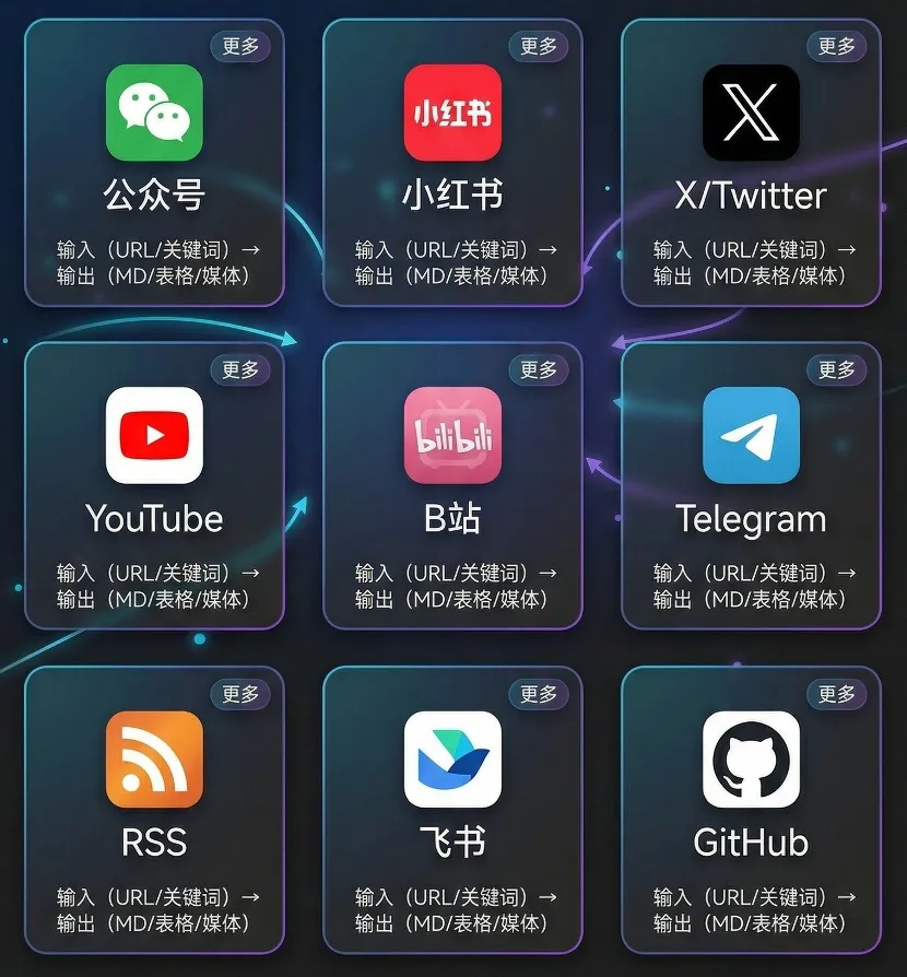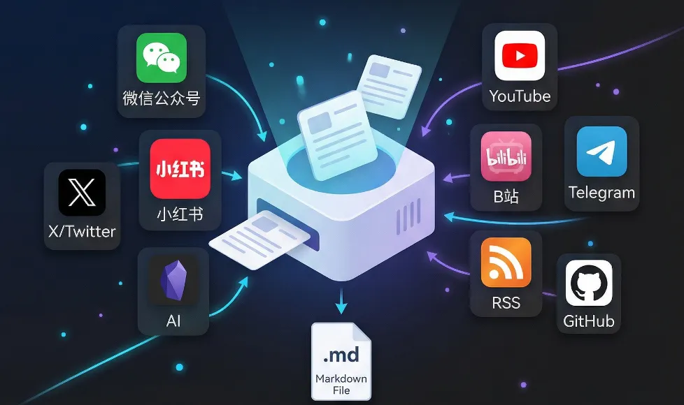 给它一个URL(公众号文章、小红书笔记、YouTube视频、B站、RSS……随便扔),它就自动抓取、转录、结构化,输出干净的Markdown文件,直接丢进Obsidian就行!