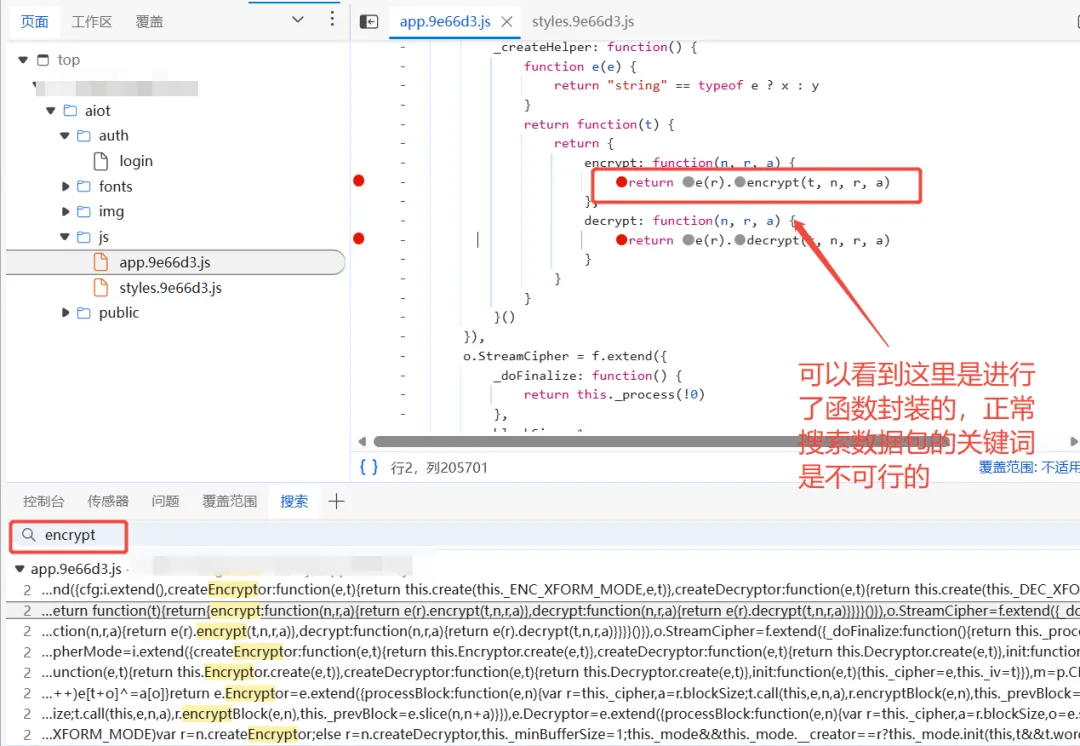 第二个:“直接搜索常见关键词”。在正常加密过的网站,一般这些参数名其实是进行了混淆或者封装的,这时我们搜索数据包中的关键词是不可行的,这里我们就可以直接搜索平时遇到的关键词,这里我推荐几个,“encrypt” 和 “decrypt” 。如图,经常会遇到encrypt和decrypt函数一起的,这种格式一般就直接是加密函数和解密函数了,如果有多个就都打上,一般不会太多,然后在加密前修改参数就行。