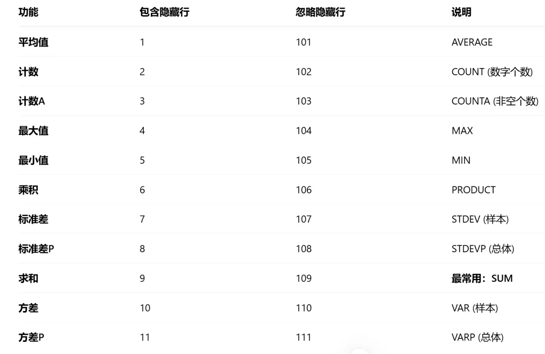 当你不使用筛选,而是直接右键“隐藏”了某些行时,使用 101-111 系列的参数,可以让统计结果只针对可见行。