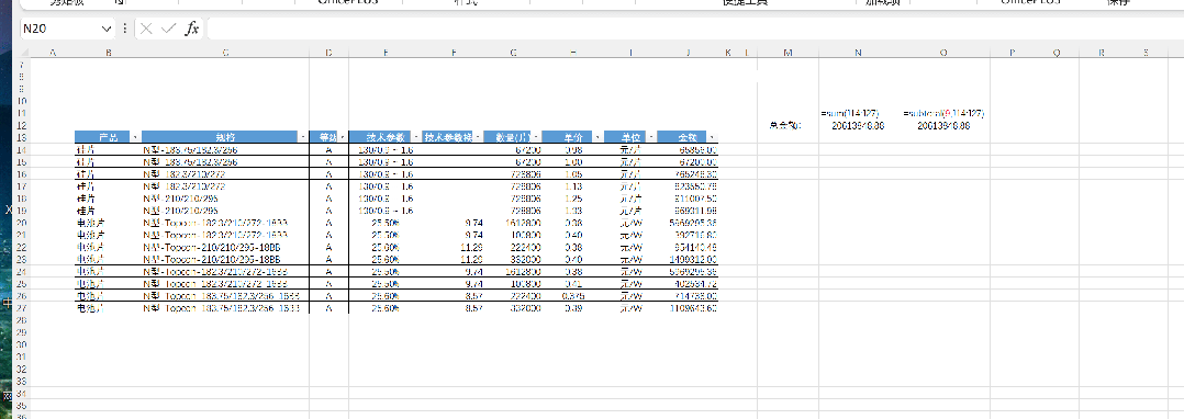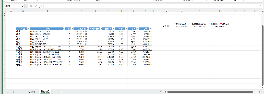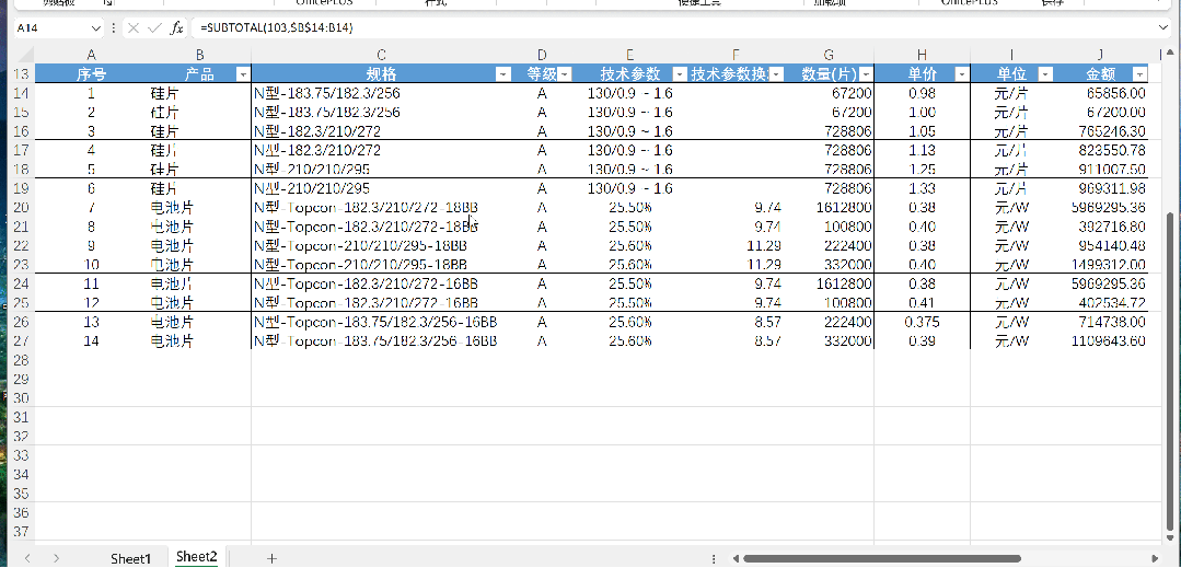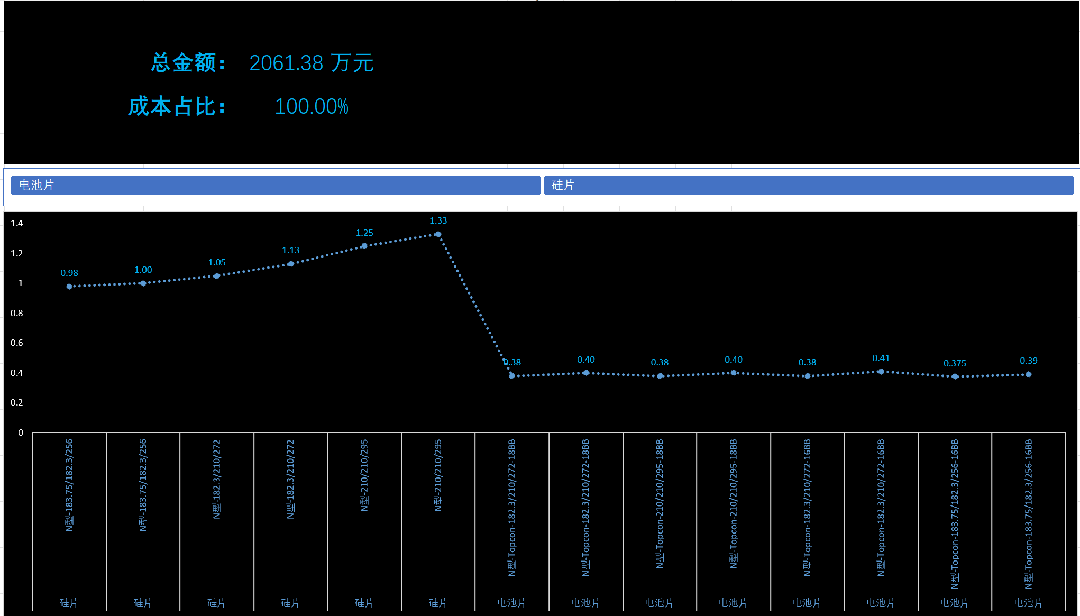 *按产品 硅片、电池片 分类筛选时,自动计算筛选项求和(核心参数使用了9数值,参考核心参数表)