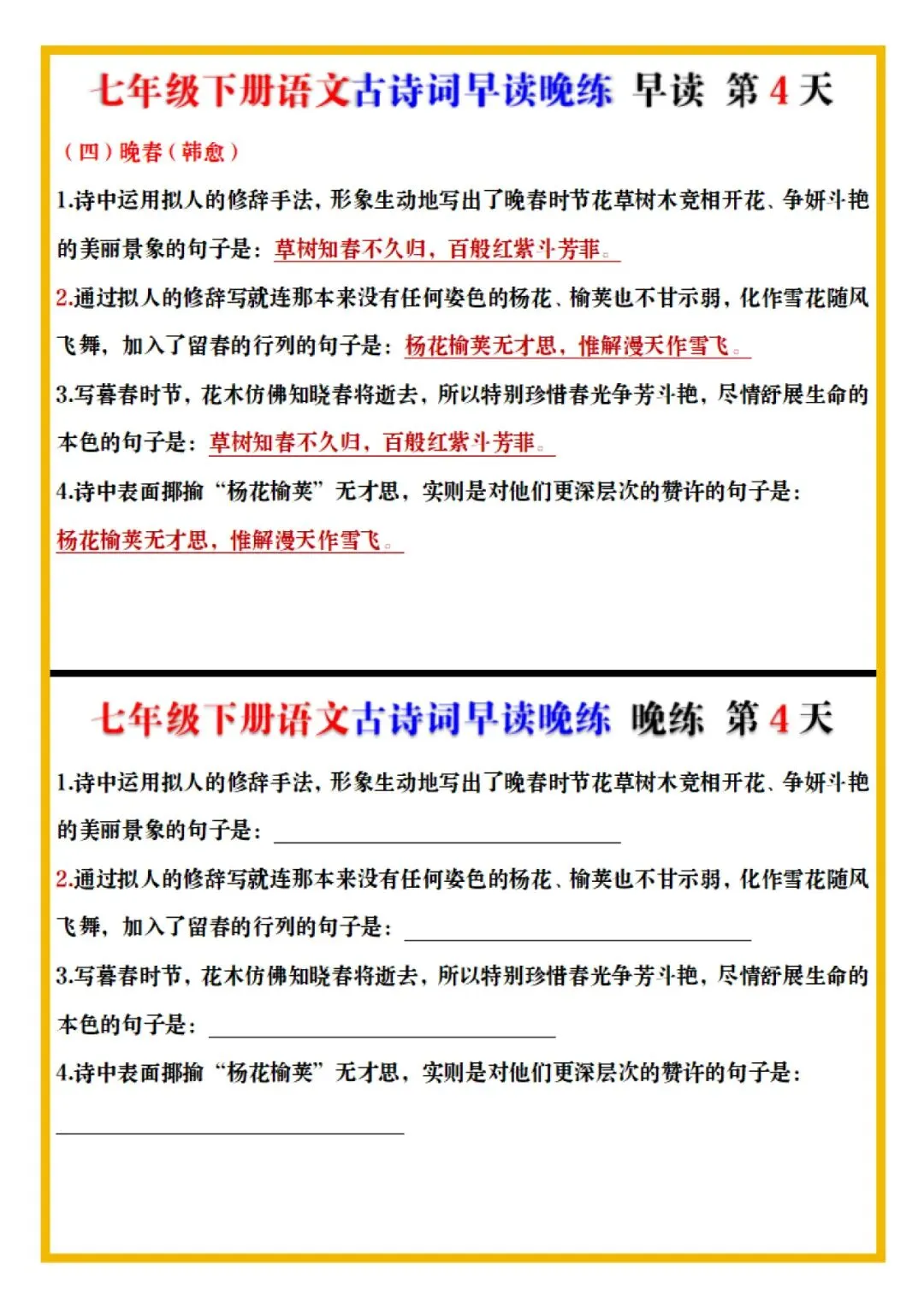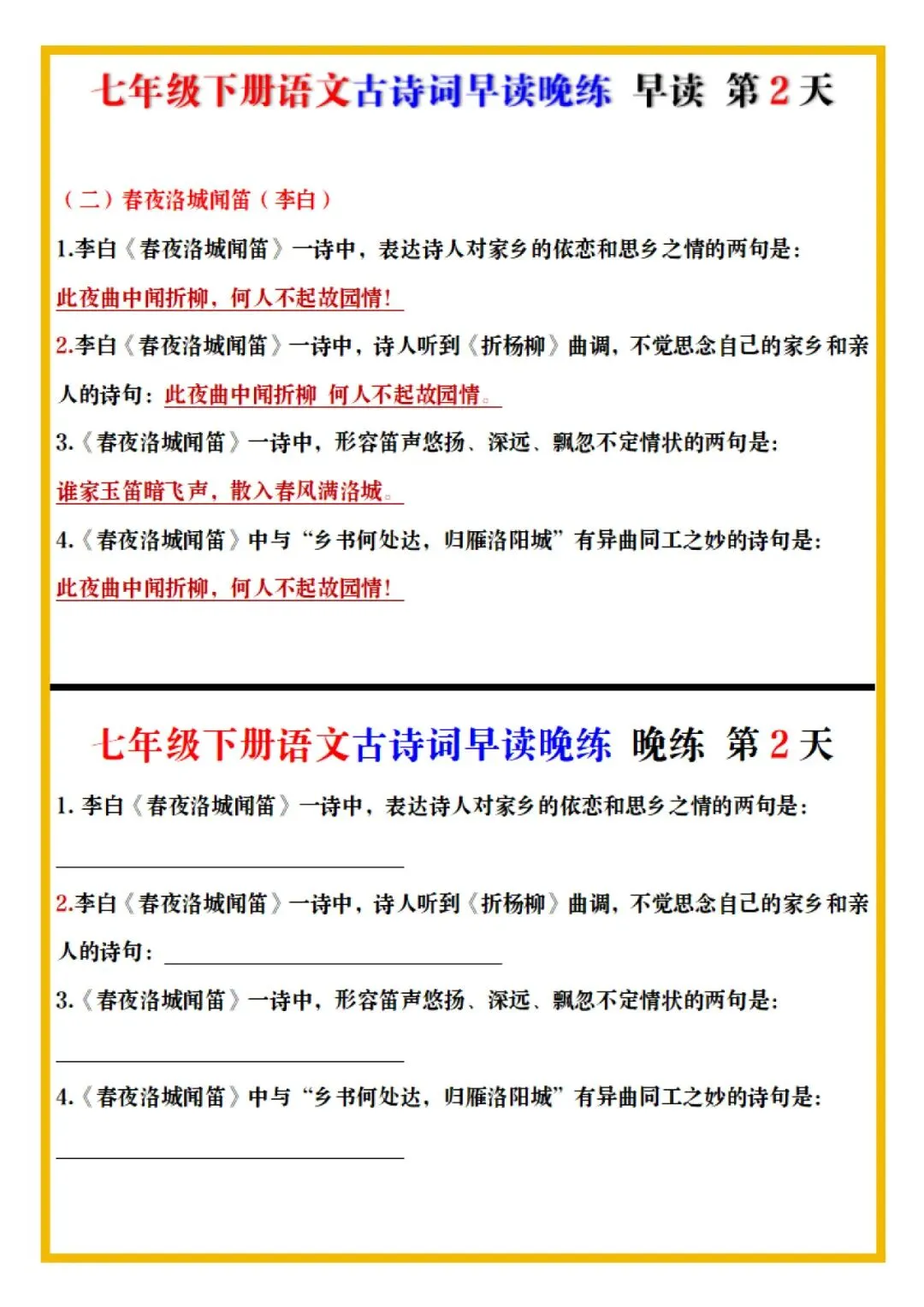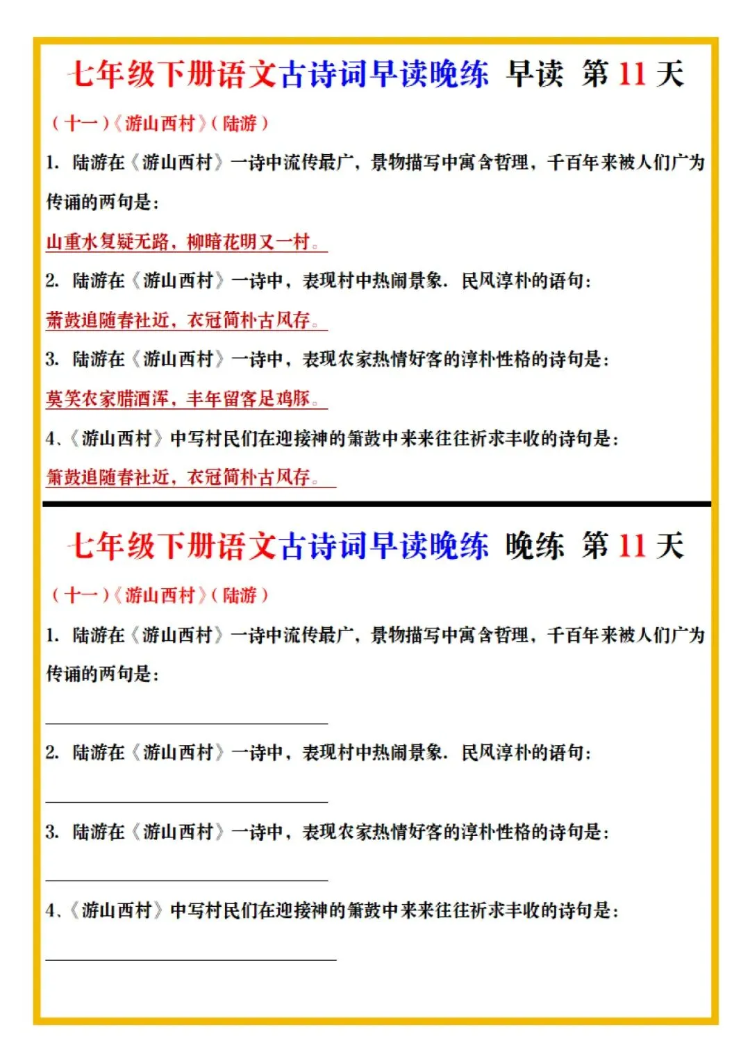七年级下册语文古诗词预习早背晚练全册电子版可打印