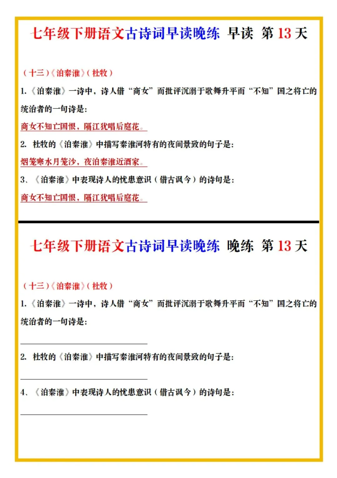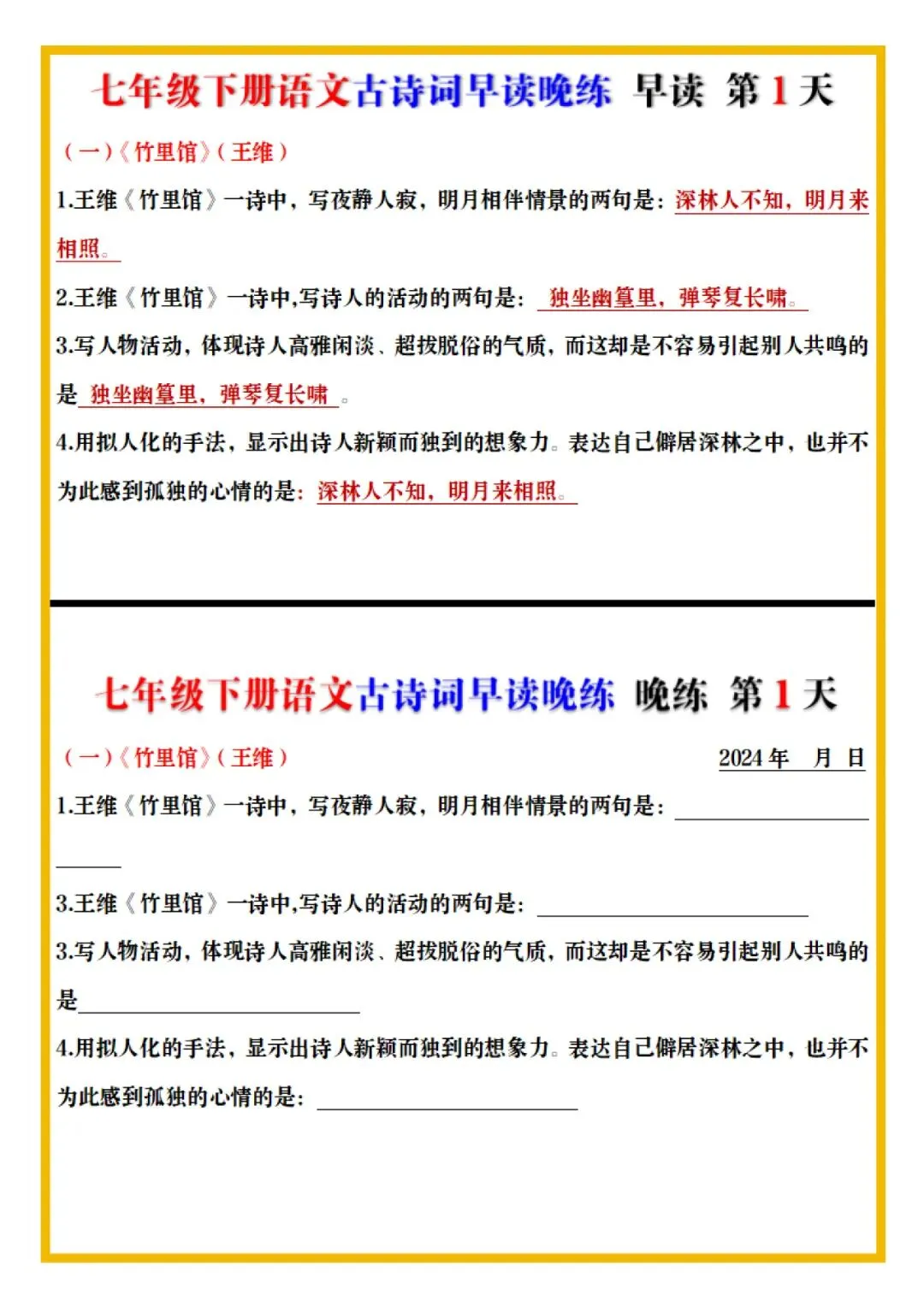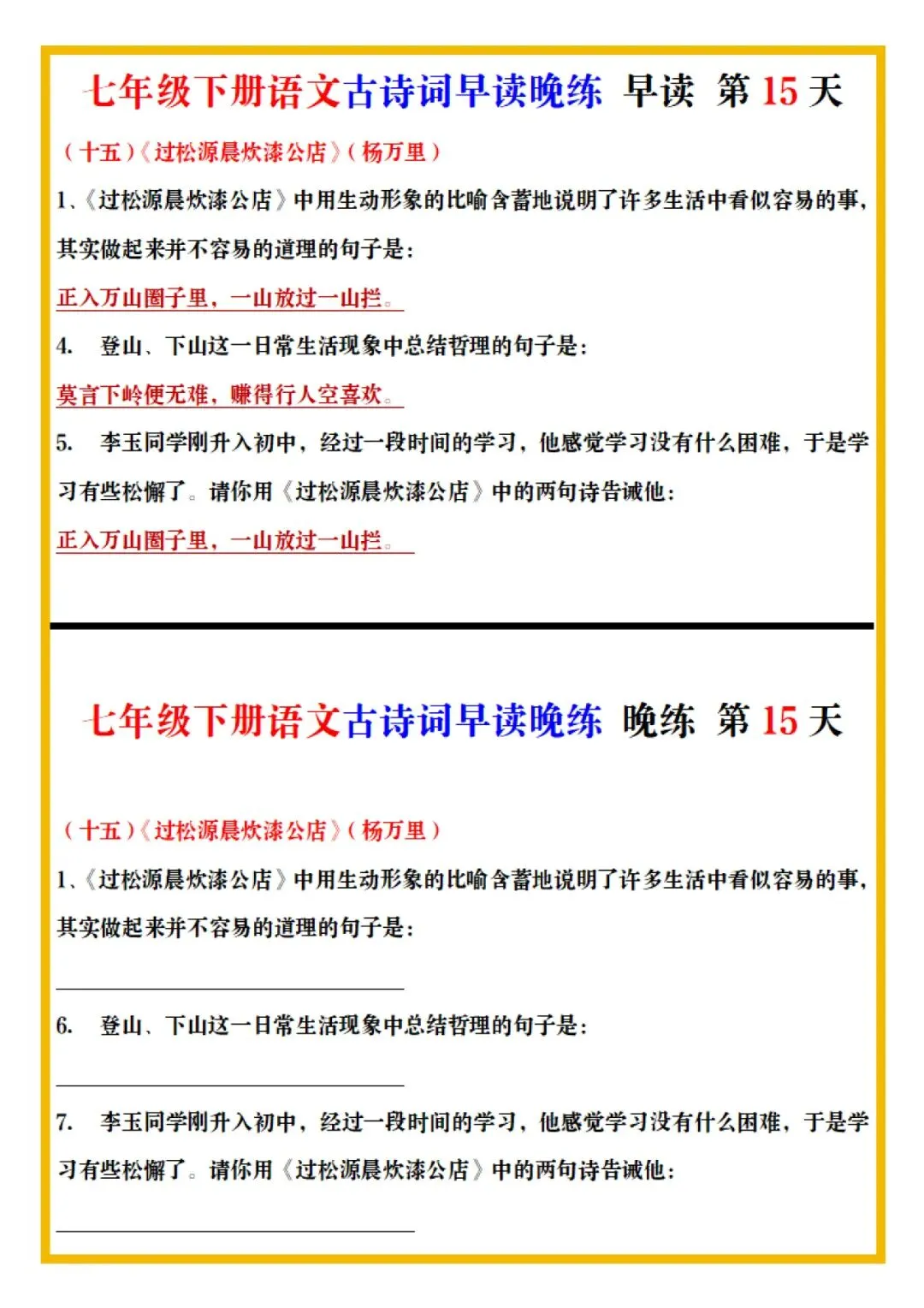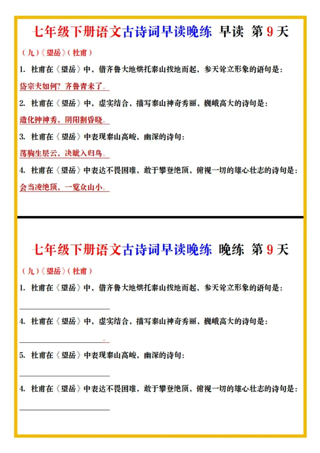 七年级下册语文古诗词预习早背晚练全册电子版可打印