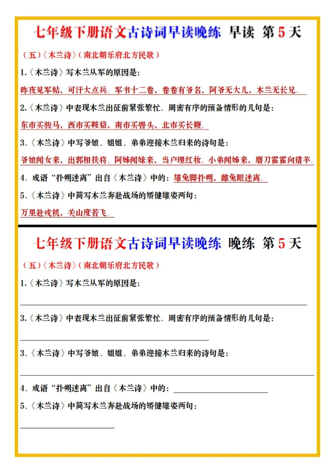今日老师为大家整理了:七年级下册语文古诗词预习早背晚练全册电子版可打印