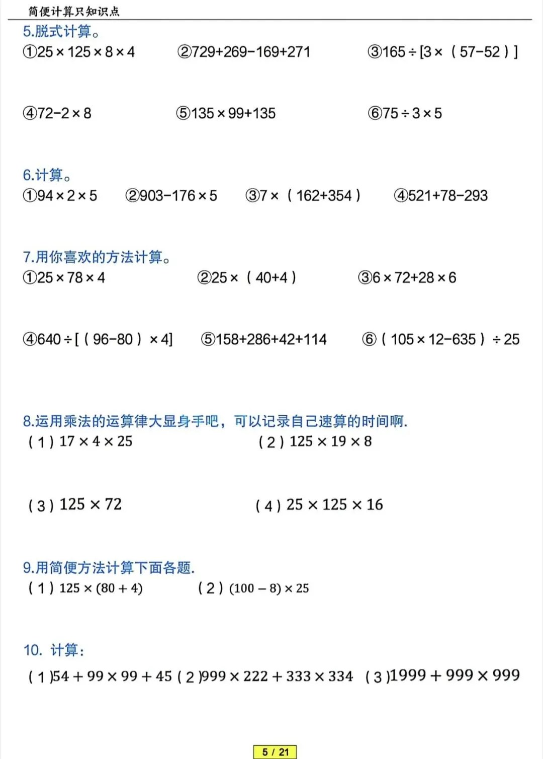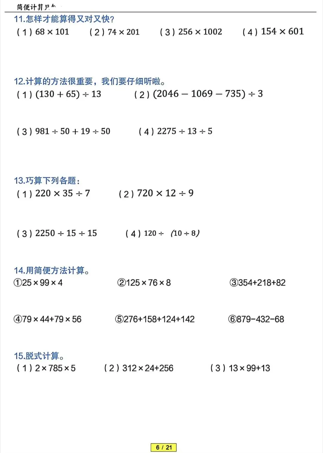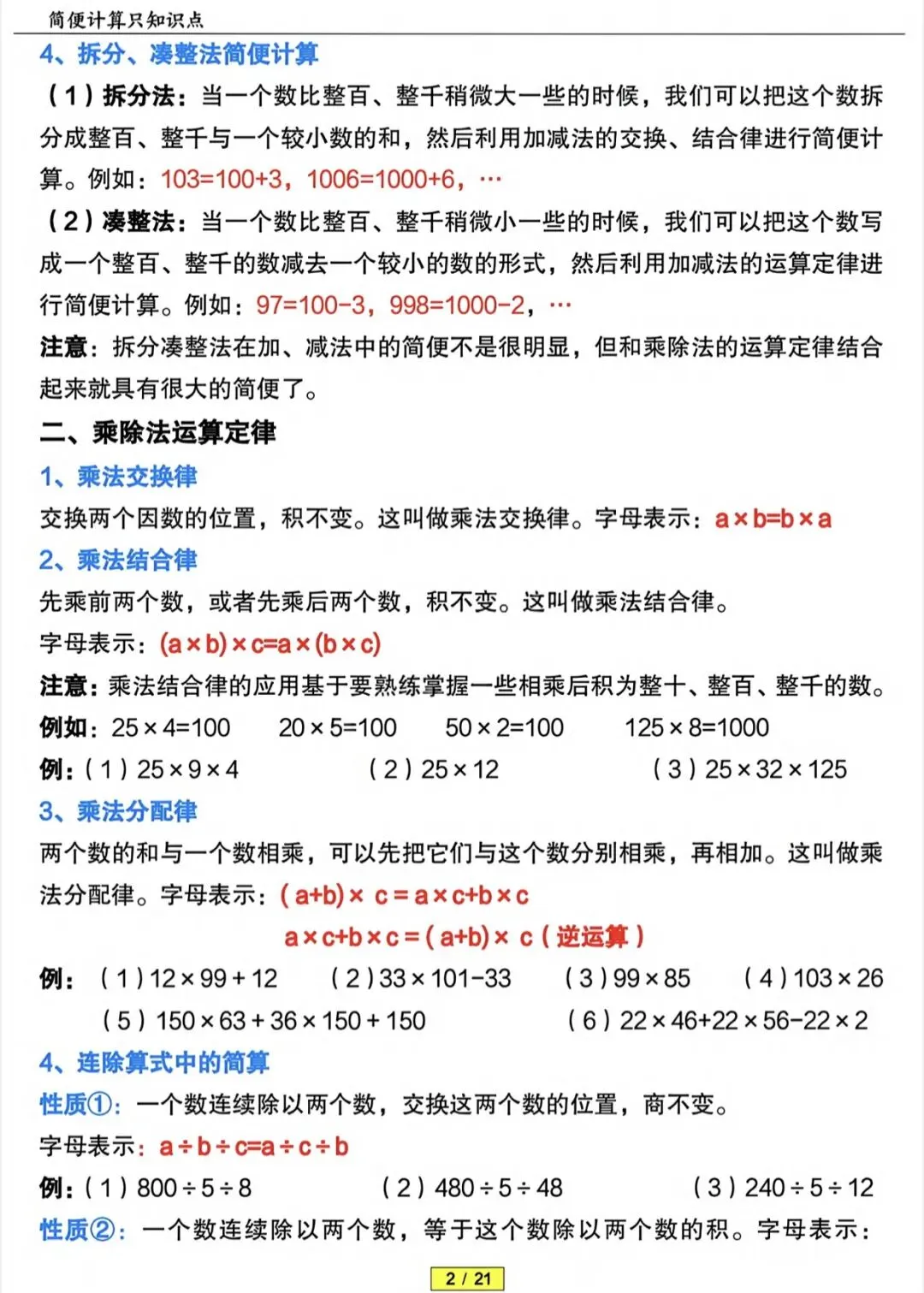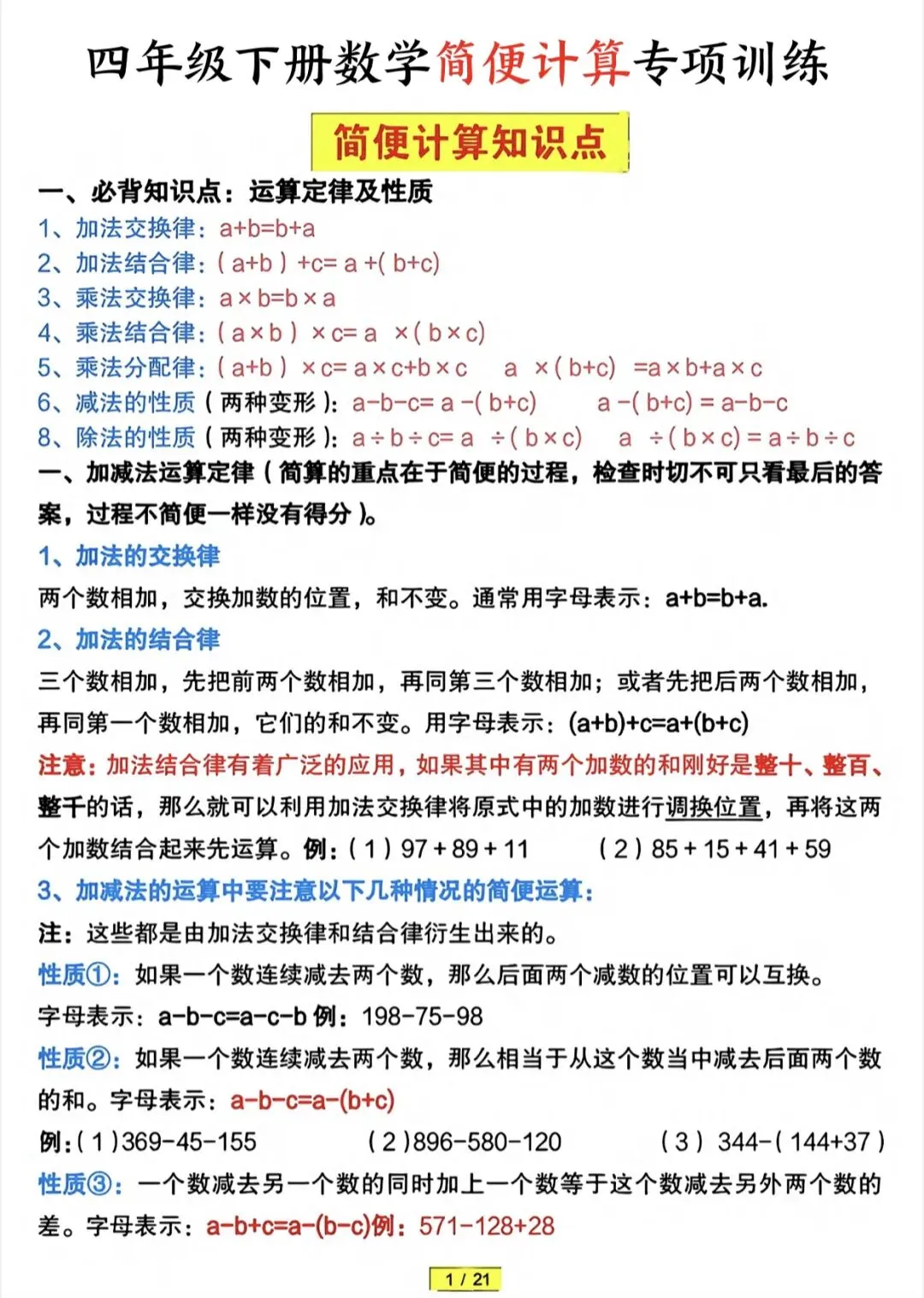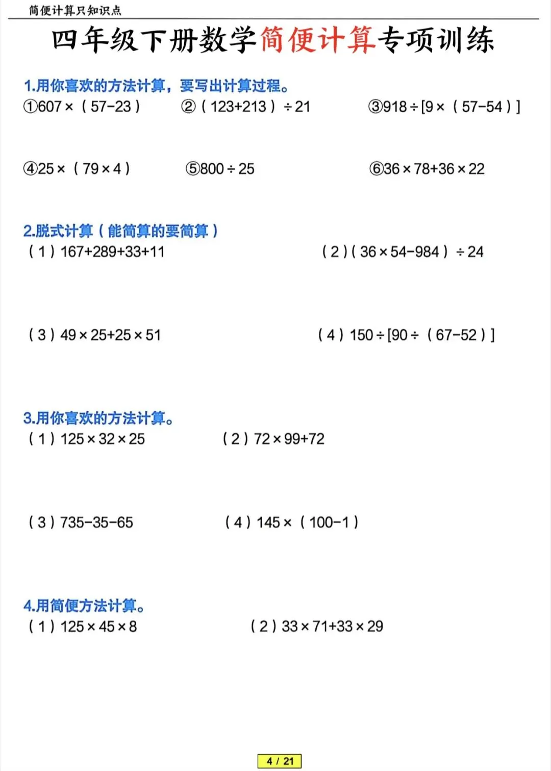 四年级下数学简便计算专项训练(含答案)|可打印 以下为部分截图,具体看完整PDF文件 (温馨提示:文末有电子版领取方式) 领取完整电子版: ①:点点右下角的“赞”和“在看” ②:关注公众号点击资料领取按钮