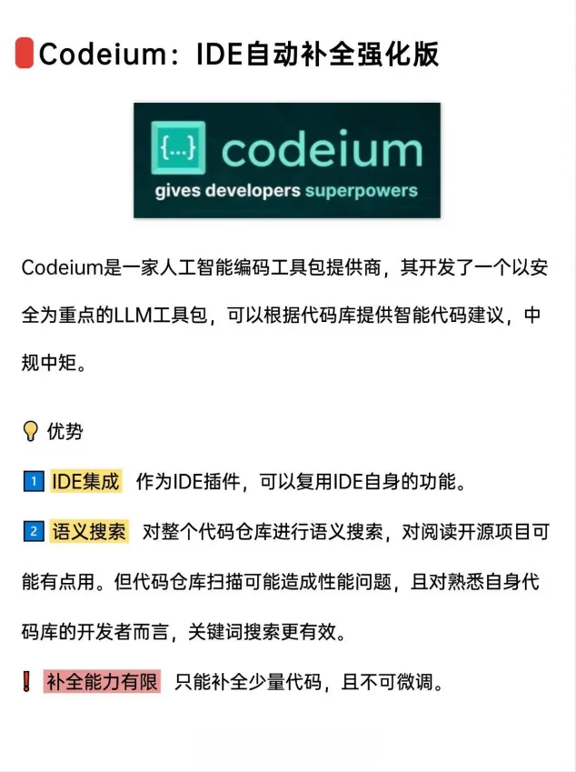 一款以安全为重点的LLM工具包,作为IDE插件提供智能代码建议。其优势在于IDE集成和语义搜索功能,方便代码库的检索。 然而,其代码补全.能力相对有限,且不支持微调。