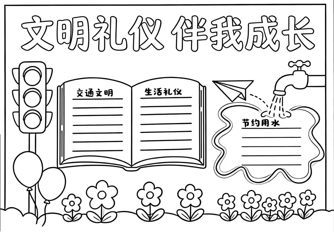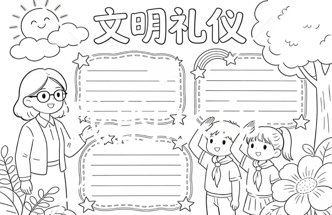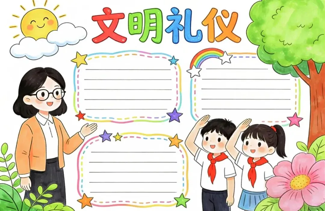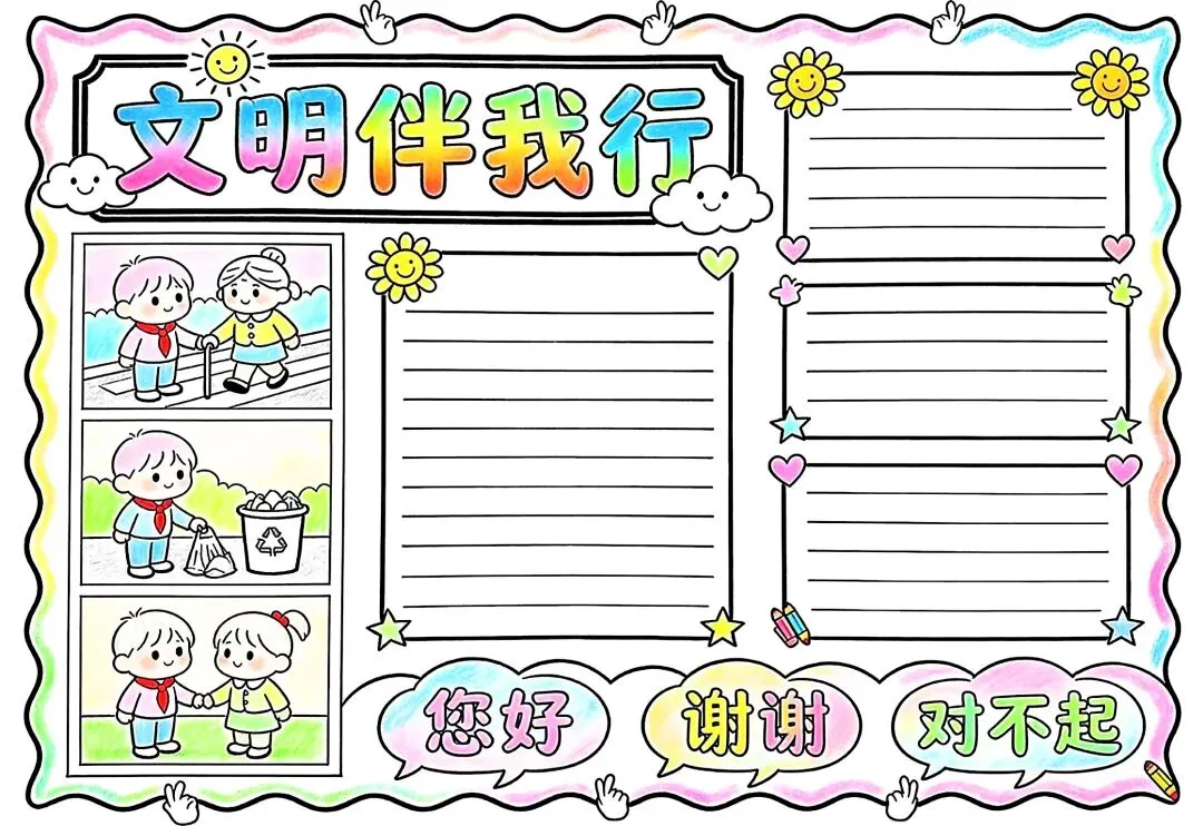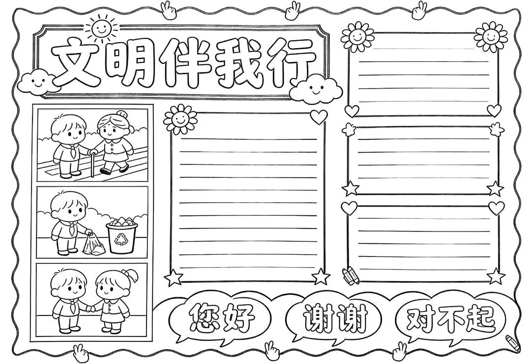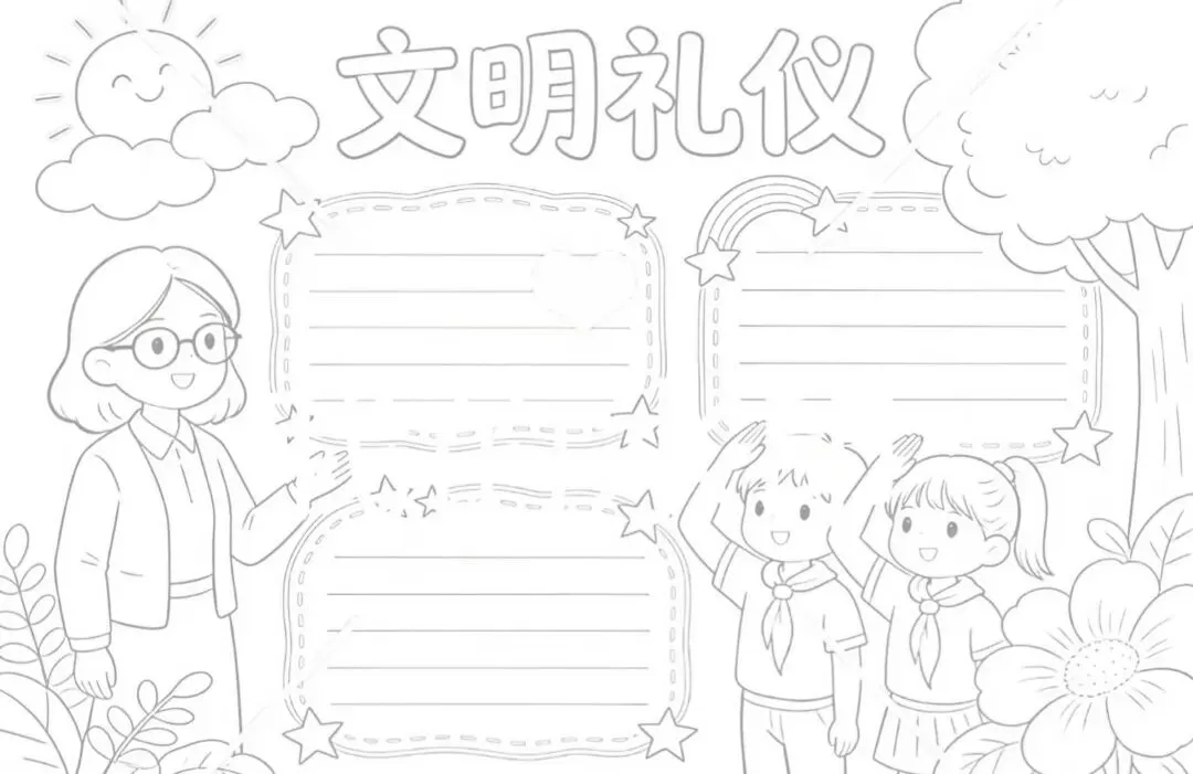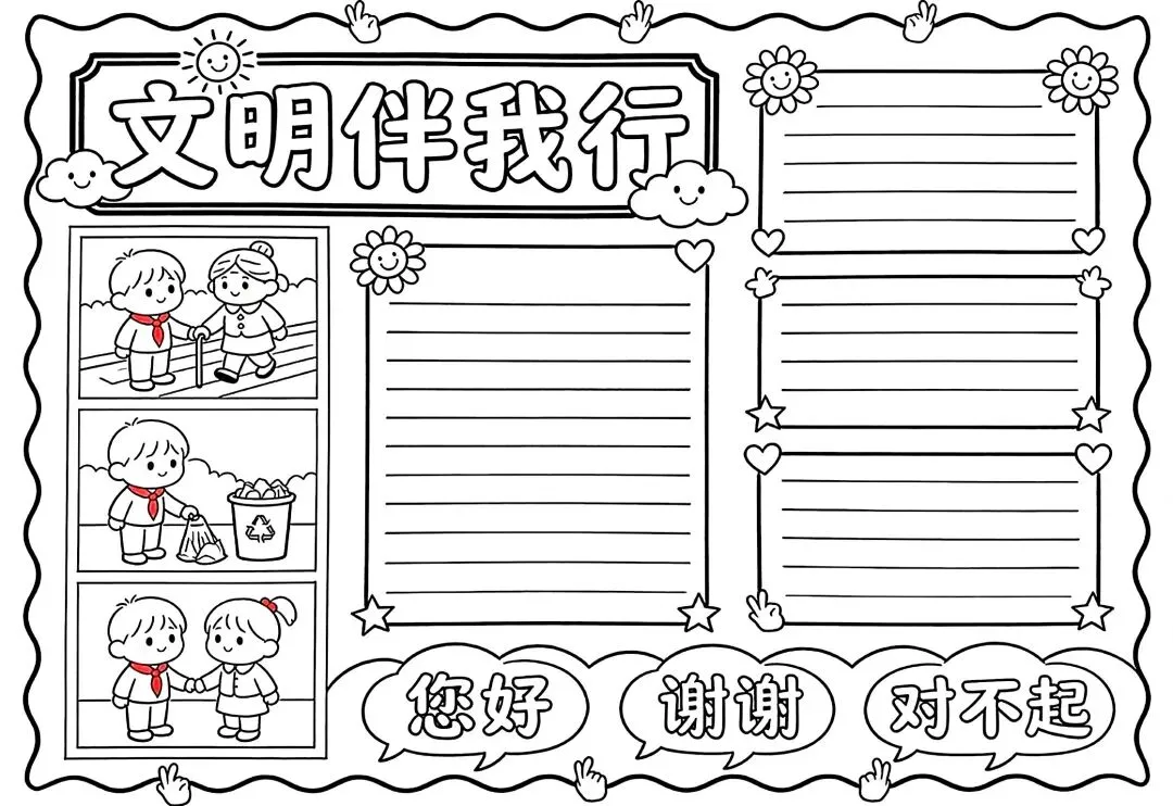 文明礼仪是中小学生日常德育学习的重要模块,很多学校都会布置相关的手抄报作业,今天给大家分享的是适配中小学作业要求的卡通风「文明礼仪伴我行」主题手抄报,符合中文手抄报的排版和书写要求,完成难度不高。先给大家梳理下老师对手抄报作业的常见要求,做的时候对照着来就不容易出问题:✅ 主题明确:所有内容、装饰元素都要紧扣文明礼仪主题,不要加和主题无关的图案✅ 内容充实:可以覆盖校园礼仪、公共场合礼仪、常用礼貌用语等不同方向的内容,不要大段留白✅ 版面整洁:纸面无明显涂改痕迹,排版疏密得当,不要出现文字、图案堆在一起的情况✅ 书写工整:中文书写要规范,尽量用正楷,辨识度高,不要用太夸张的字体写正文内容✅ 色彩协调:整体配色统一和谐,符合卡通风的活泼感但不要过于杂乱刺眼接下来是需要准备的文具清单,都是日常常用的文具,不用特意买新材料:🔹 纸张:A3 或 A4 白色卡纸,硬度够不容易皱,学校没有特殊要求的话选 A4 就够用🔹 打稿工具:HB 铅笔、4B 橡皮,HB 铅笔打稿痕迹轻,4B 橡皮擦得干净不留黑印🔹 辅助工具:15cm 直尺,用来画板块分割线、边框以及写正文前打辅助线🔹 描线书写工具:0.5mm 黑色针管勾线笔(写正文内容)、1mm 黑色粗头勾线笔(描图案和大标题轮廓)