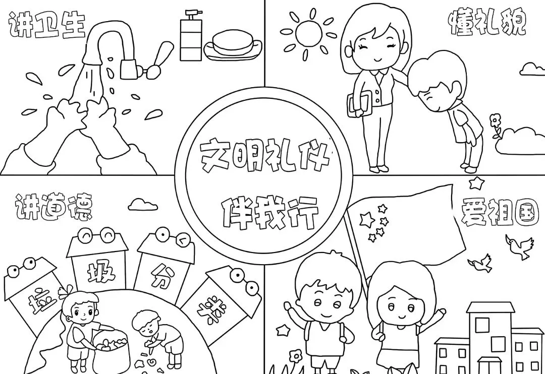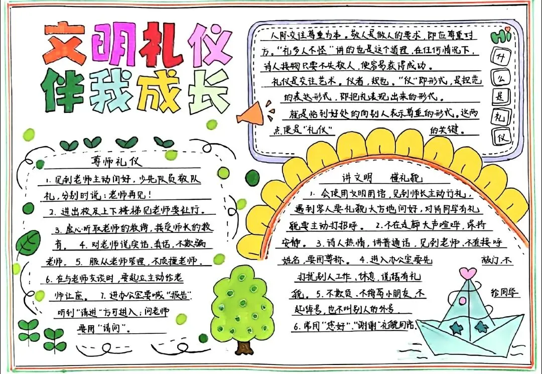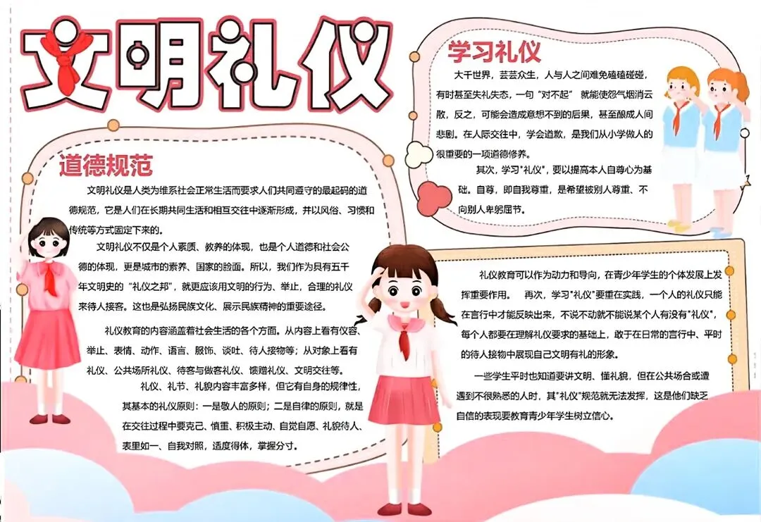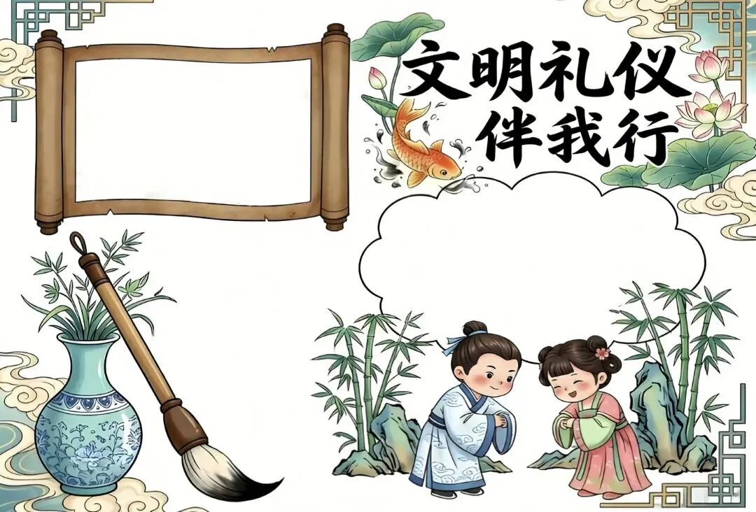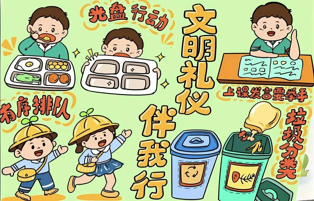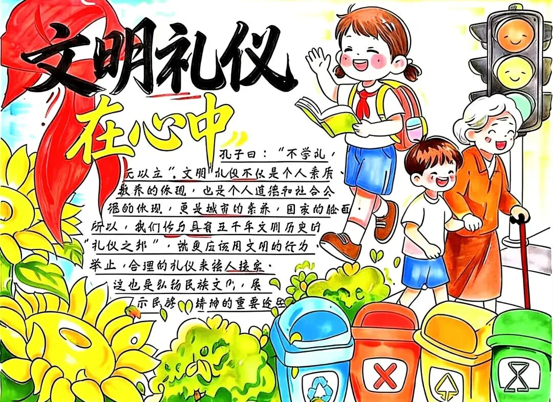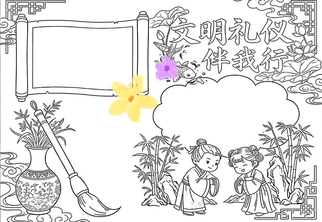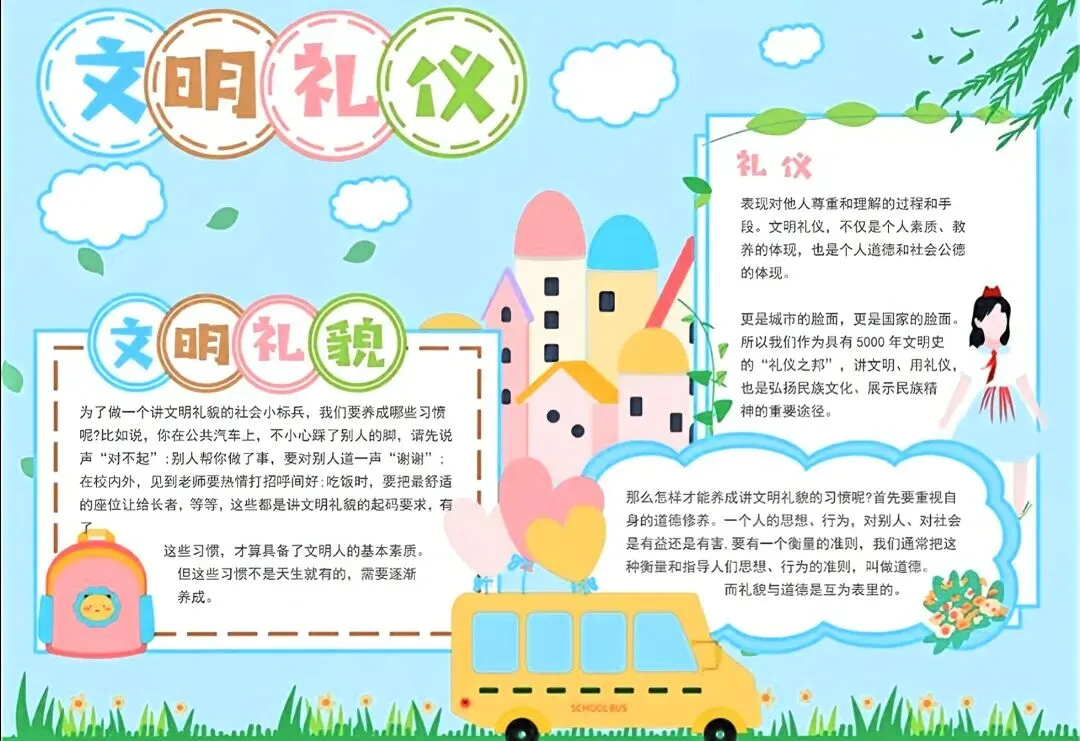 文明礼仪是中小学生日常德育学习的重要模块,很多学校都会布置相关的手抄报作业,今天给大家分享的是适配中小学作业要求的卡通风「文明礼仪伴我行」主题手抄报,符合中文手抄报的排版和书写要求,完成难度不高。先给大家梳理下老师对手抄报作业的常见要求,做的时候对照着来就不容易出问题:✅ 主题明确:所有内容、装饰元素都要紧扣文明礼仪主题,不要加和主题无关的图案✅ 内容充实:可以覆盖校园礼仪、公共场合礼仪、常用礼貌用语等不同方向的内容,不要大段留白✅ 版面整洁:纸面无明显涂改痕迹,排版疏密得当,不要出现文字、图案堆在一起的情况✅ 书写工整:中文书写要规范,尽量用正楷,辨识度高,不要用太夸张的字体写正文内容✅ 色彩协调:整体配色统一和谐,符合卡通风的活泼感但不要过于杂乱刺眼接下来是需要准备的文具清单,都是日常常用的文具,不用特意买新材料:🔹 纸张:A3 或 A4 白色卡纸,硬度够不容易皱,学校没有特殊要求的话选 A4 就够用🔹 打稿工具:HB 铅笔、4B 橡皮,HB 铅笔打稿痕迹轻,4B 橡皮擦得干净不留黑印🔹 辅助工具:15cm 直尺,用来画板块分割线、边框以及写正文前打辅助线🔹 描线书写工具:0.5mm 黑色针管勾线笔(写正文内容)、1mm 黑色粗头勾线笔(描图案和大标题轮廓)