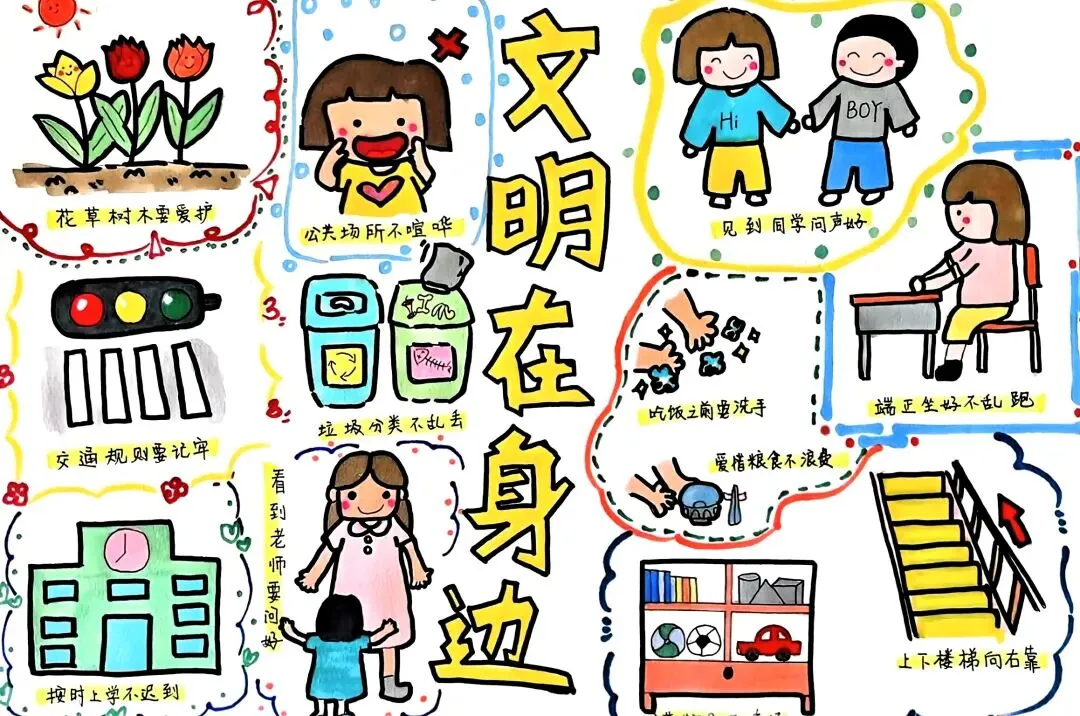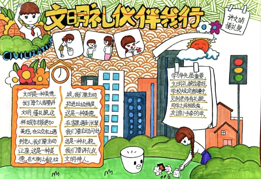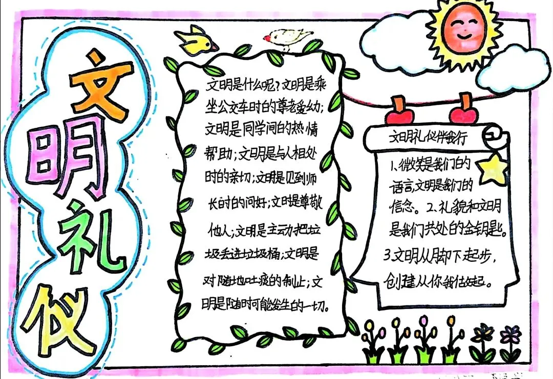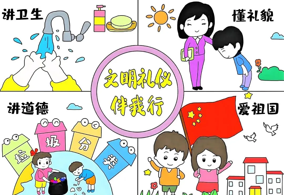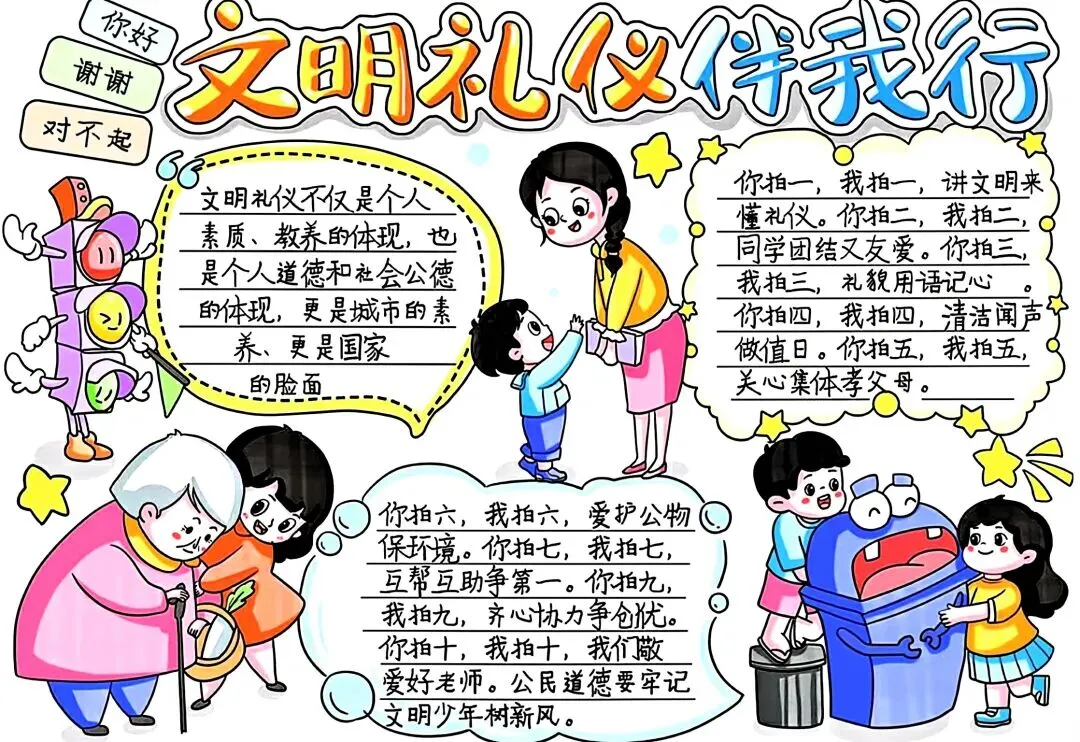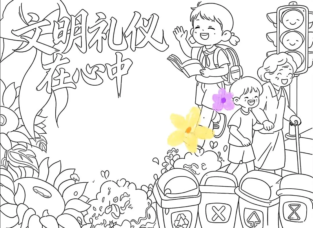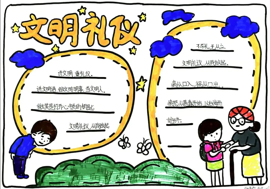 文明礼仪是中小学生日常德育学习的重要模块,很多学校都会布置相关的手抄报作业,今天给大家分享的是适配中小学作业要求的卡通风「文明礼仪伴我行」主题手抄报,符合中文手抄报的排版和书写要求,完成难度不高。先给大家梳理下老师对手抄报作业的常见要求,做的时候对照着来就不容易出问题:✅ 主题明确:所有内容、装饰元素都要紧扣文明礼仪主题,不要加和主题无关的图案✅ 内容充实:可以覆盖校园礼仪、公共场合礼仪、常用礼貌用语等不同方向的内容,不要大段留白✅ 版面整洁:纸面无明显涂改痕迹,排版疏密得当,不要出现文字、图案堆在一起的情况✅ 书写工整:中文书写要规范,尽量用正楷,辨识度高,不要用太夸张的字体写正文内容✅ 色彩协调:整体配色统一和谐,符合卡通风的活泼感但不要过于杂乱刺眼接下来是需要准备的文具清单,都是日常常用的文具,不用特意买新材料:🔹 纸张:A3 或 A4 白色卡纸,硬度够不容易皱,学校没有特殊要求的话选 A4 就够用🔹 打稿工具:HB 铅笔、4B 橡皮,HB 铅笔打稿痕迹轻,4B 橡皮擦得干净不留黑印🔹 辅助工具:15cm 直尺,用来画板块分割线、边框以及写正文前打辅助线🔹 描线书写工具:0.5mm 黑色针管勾线笔(写正文内容)、1mm 黑色粗头勾线笔(描图案和大标题轮廓)