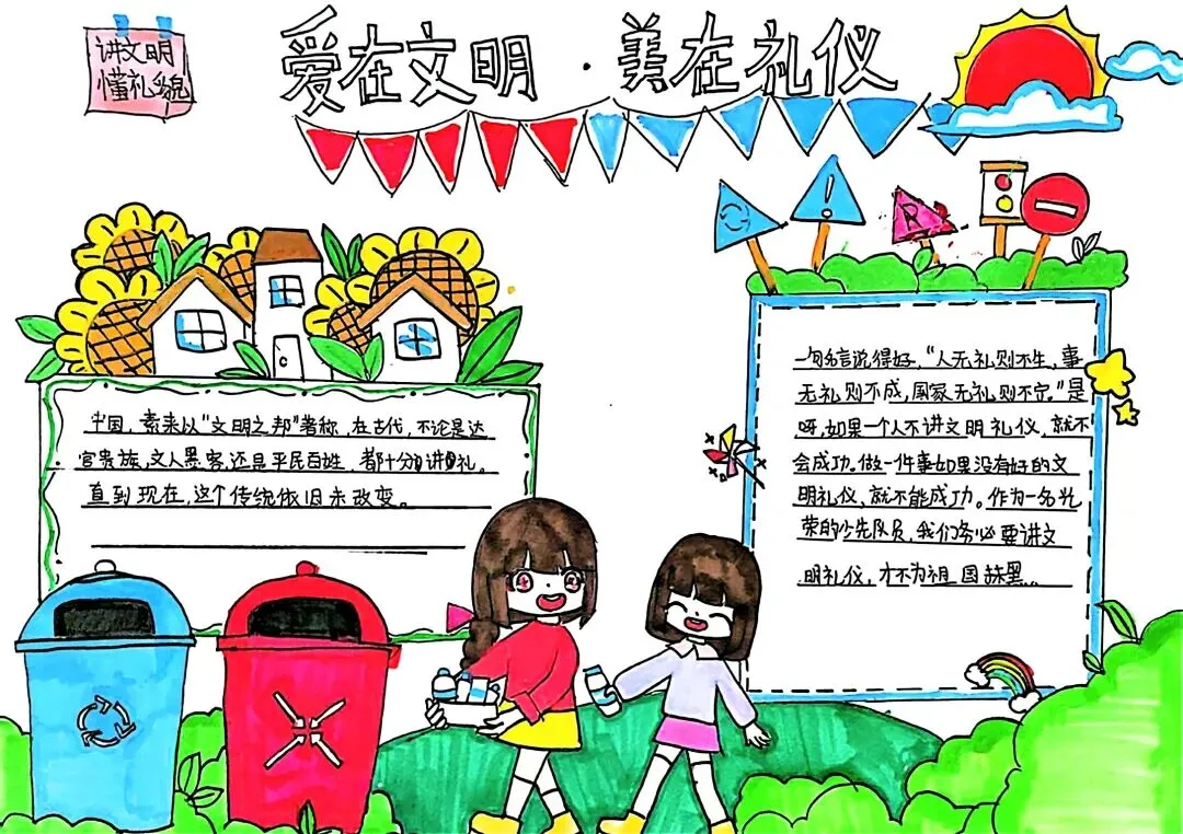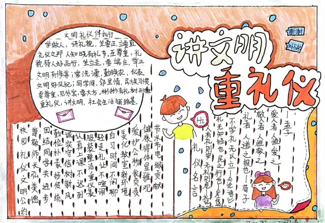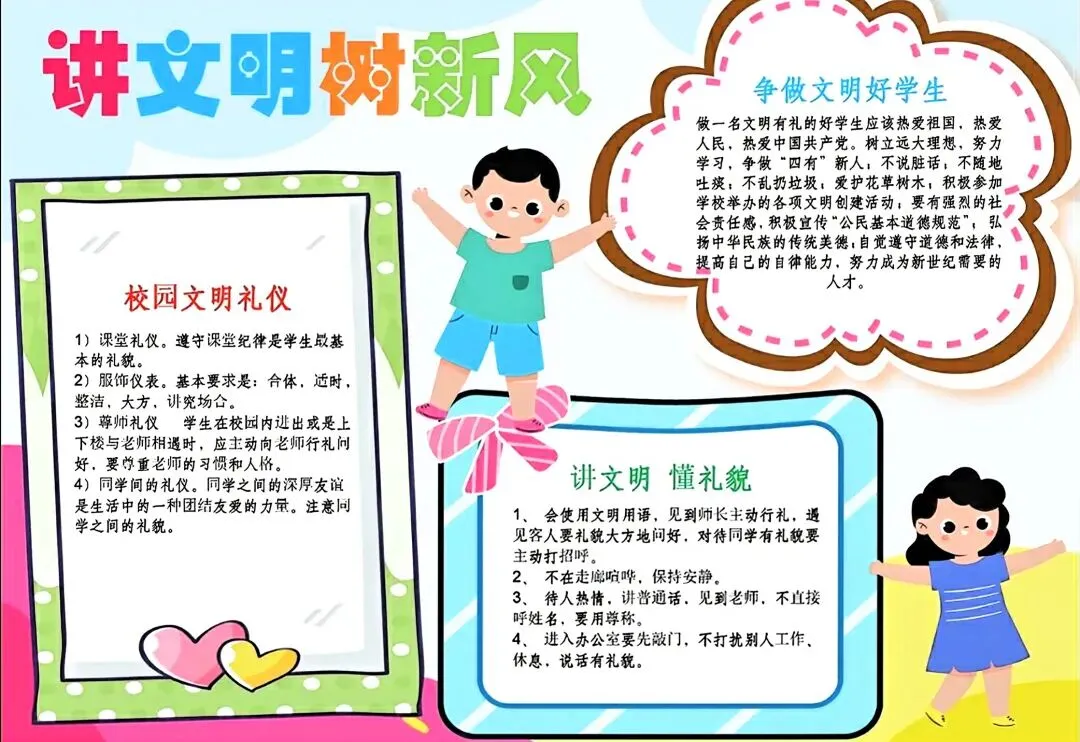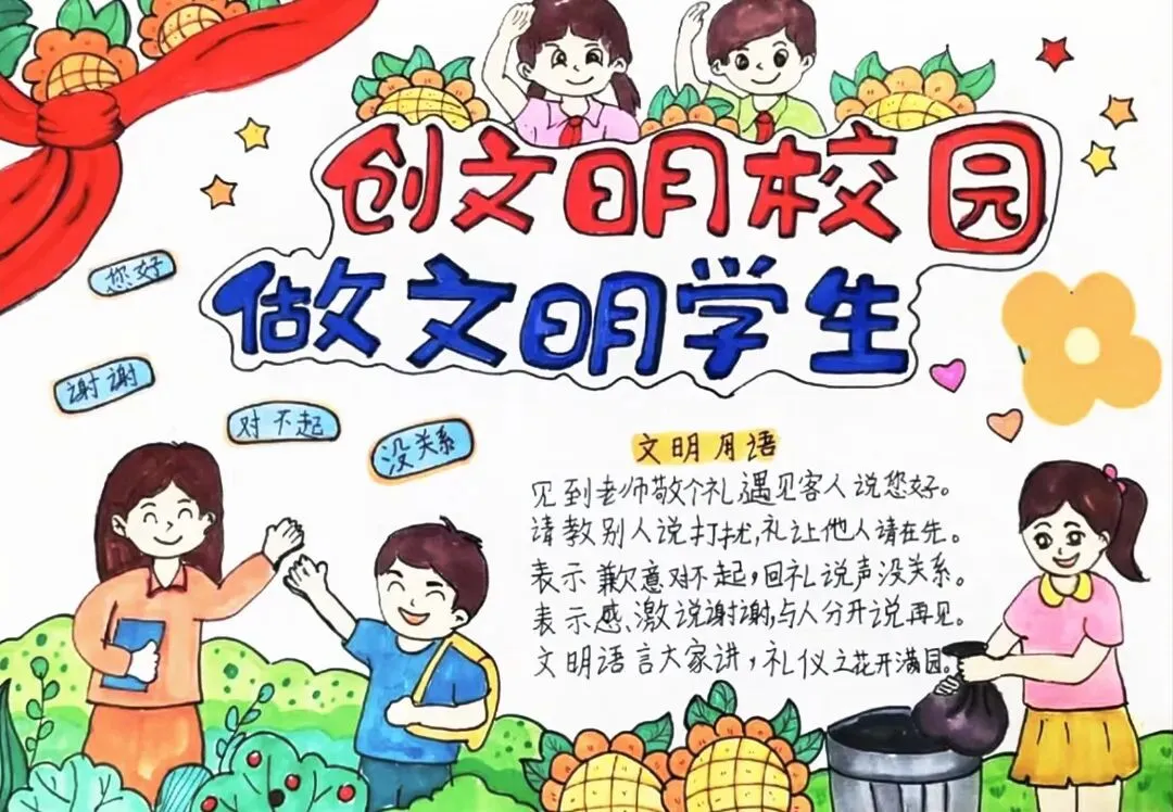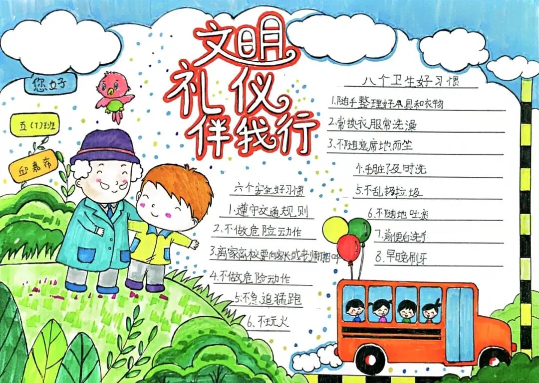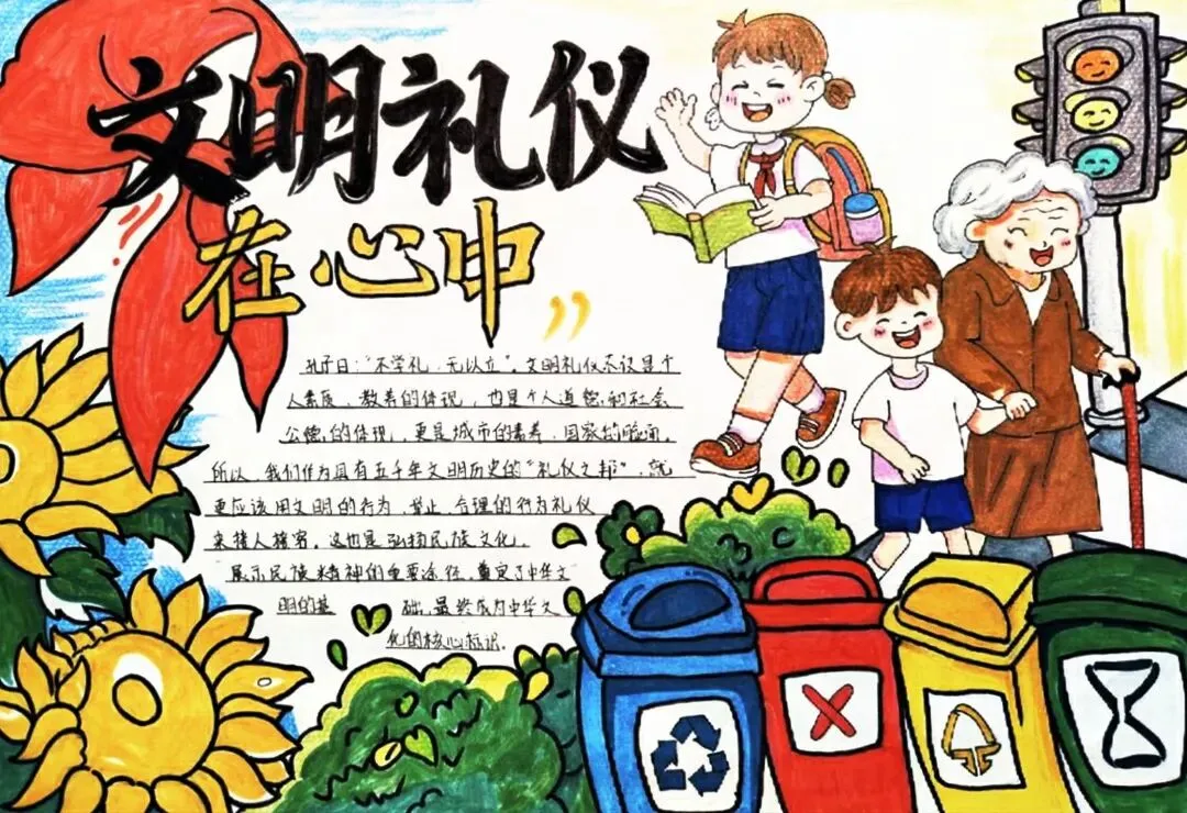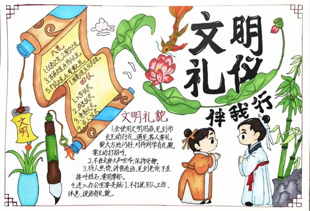 文明礼仪是中小学生日常德育学习的重要模块,很多学校都会布置相关的手抄报作业,今天给大家分享的是适配中小学作业要求的卡通风「文明礼仪伴我行」主题手抄报,符合中文手抄报的排版和书写要求,完成难度不高。先给大家梳理下老师对手抄报作业的常见要求,做的时候对照着来就不容易出问题:✅ 主题明确:所有内容、装饰元素都要紧扣文明礼仪主题,不要加和主题无关的图案✅ 内容充实:可以覆盖校园礼仪、公共场合礼仪、常用礼貌用语等不同方向的内容,不要大段留白✅ 版面整洁:纸面无明显涂改痕迹,排版疏密得当,不要出现文字、图案堆在一起的情况✅ 书写工整:中文书写要规范,尽量用正楷,辨识度高,不要用太夸张的字体写正文内容✅ 色彩协调:整体配色统一和谐,符合卡通风的活泼感但不要过于杂乱刺眼接下来是需要准备的文具清单,都是日常常用的文具,不用特意买新材料:🔹 纸张:A3 或 A4 白色卡纸,硬度够不容易皱,学校没有特殊要求的话选 A4 就够用🔹 打稿工具:HB 铅笔、4B 橡皮,HB 铅笔打稿痕迹轻,4B 橡皮擦得干净不留黑印🔹 辅助工具:15cm 直尺,用来画板块分割线、边框以及写正文前打辅助线🔹 描线书写工具:0.5mm 黑色针管勾线笔(写正文内容)、1mm 黑色粗头勾线笔(描图案和大标题轮廓)