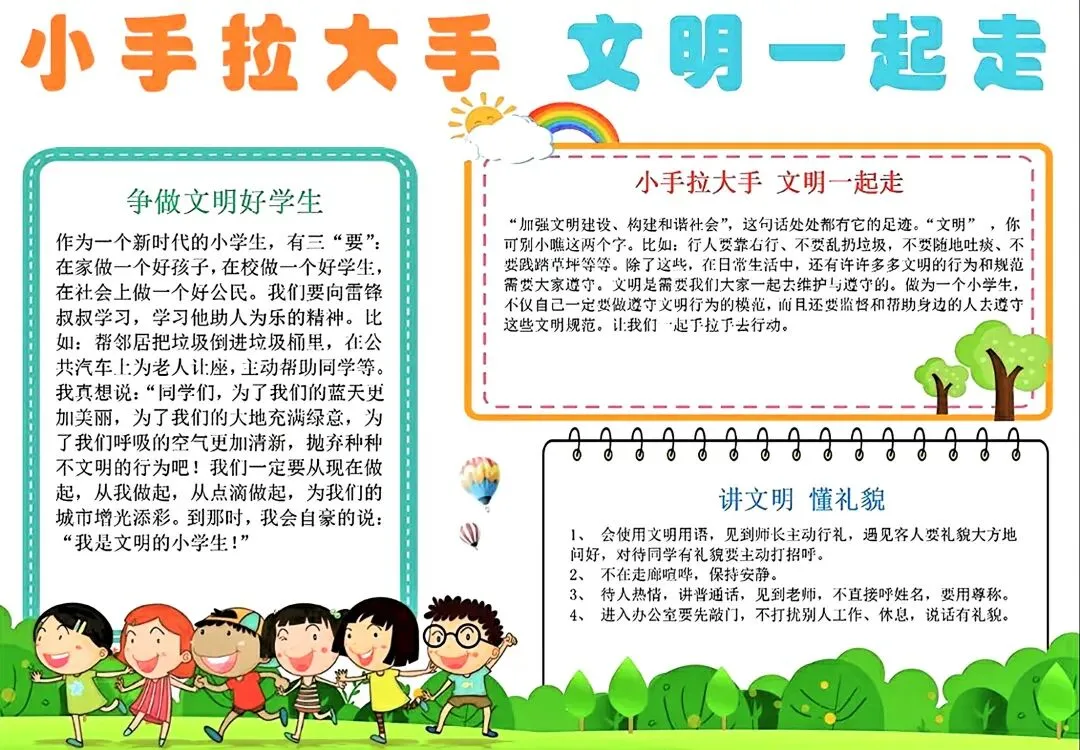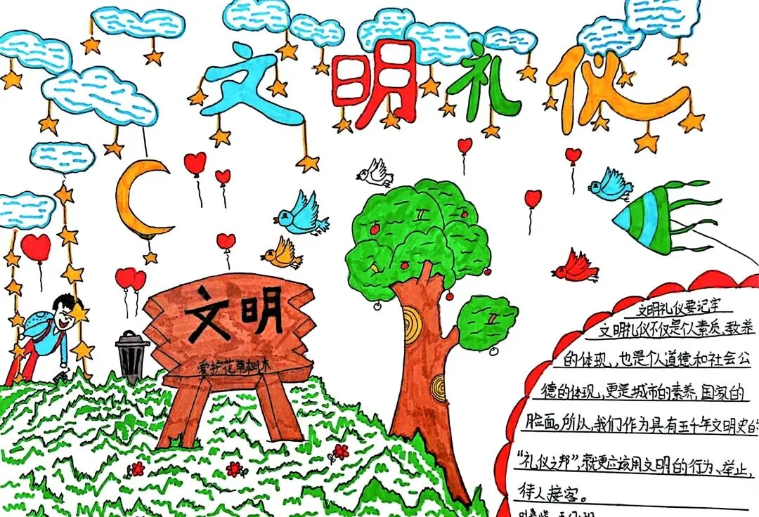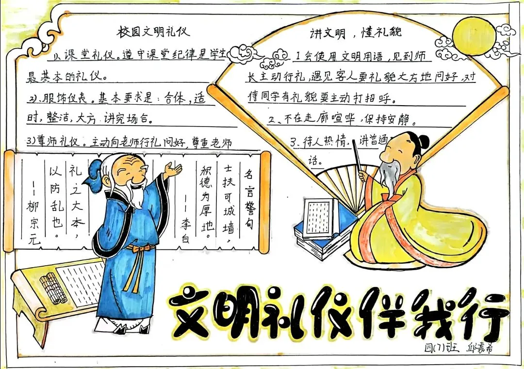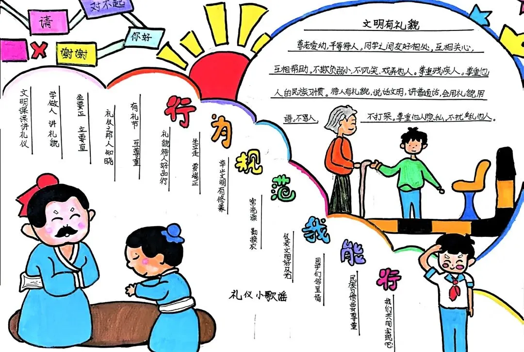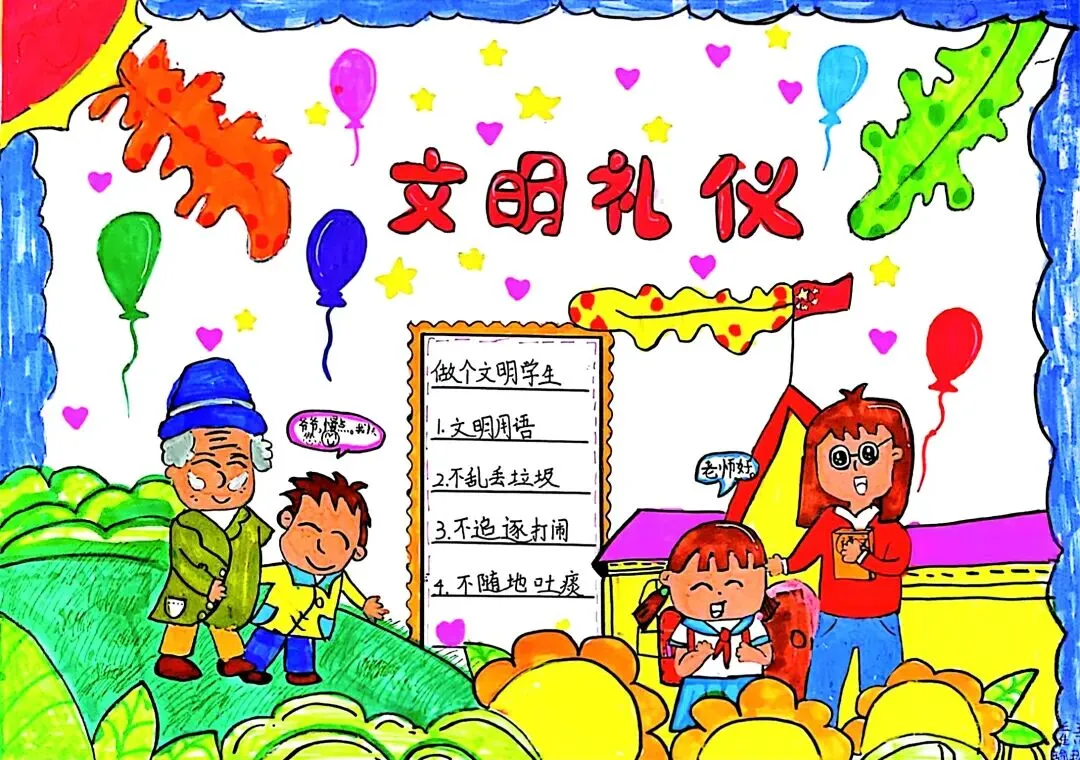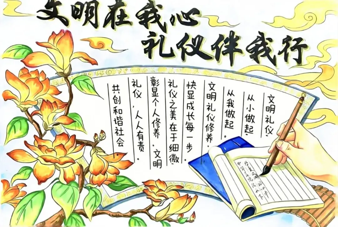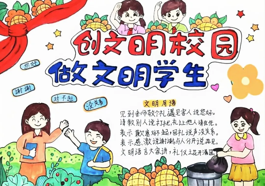 文明礼仪是中小学生日常德育学习的重要模块,很多学校都会布置相关的手抄报作业,今天给大家分享的是适配中小学作业要求的卡通风「文明礼仪伴我行」主题手抄报,符合中文手抄报的排版和书写要求,完成难度不高。先给大家梳理下老师对手抄报作业的常见要求,做的时候对照着来就不容易出问题:✅ 主题明确:所有内容、装饰元素都要紧扣文明礼仪主题,不要加和主题无关的图案✅ 内容充实:可以覆盖校园礼仪、公共场合礼仪、常用礼貌用语等不同方向的内容,不要大段留白✅ 版面整洁:纸面无明显涂改痕迹,排版疏密得当,不要出现文字、图案堆在一起的情况✅ 书写工整:中文书写要规范,尽量用正楷,辨识度高,不要用太夸张的字体写正文内容✅ 色彩协调:整体配色统一和谐,符合卡通风的活泼感但不要过于杂乱刺眼接下来是需要准备的文具清单,都是日常常用的文具,不用特意买新材料:🔹 纸张:A3 或 A4 白色卡纸,硬度够不容易皱,学校没有特殊要求的话选 A4 就够用🔹 打稿工具:HB 铅笔、4B 橡皮,HB 铅笔打稿痕迹轻,4B 橡皮擦得干净不留黑印🔹 辅助工具:15cm 直尺,用来画板块分割线、边框以及写正文前打辅助线🔹 描线书写工具:0.5mm 黑色针管勾线笔(写正文内容)、1mm 黑色粗头勾线笔(描图案和大标题轮廓)