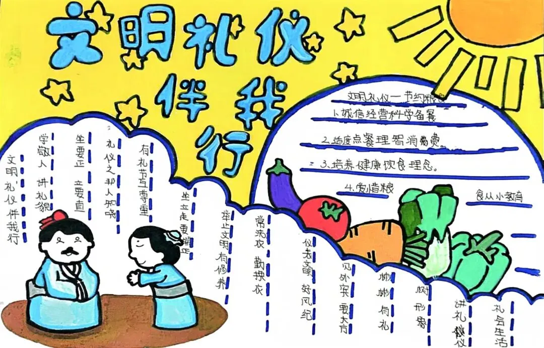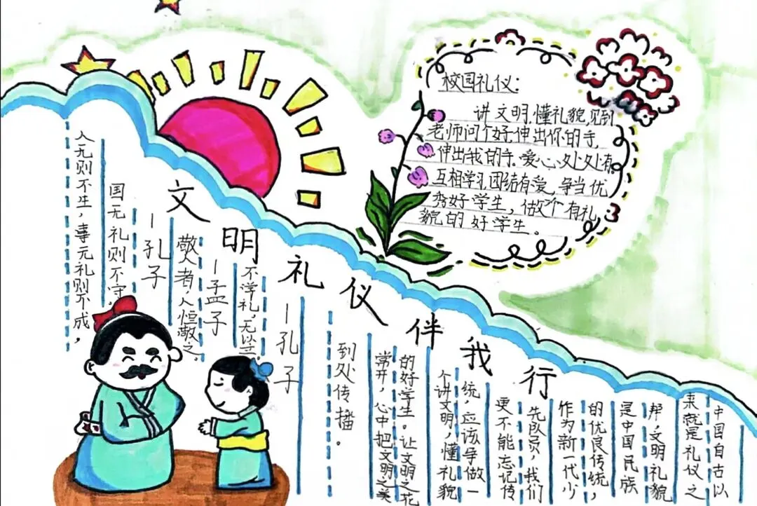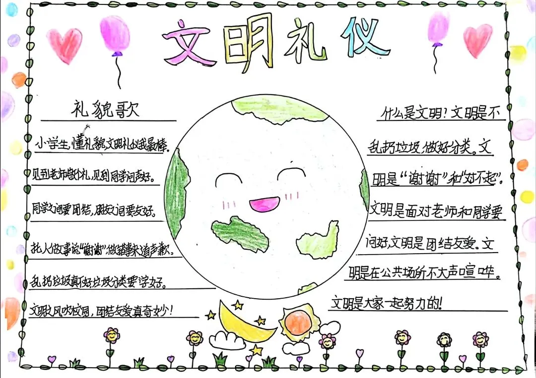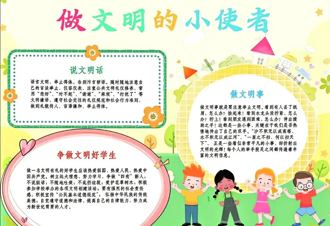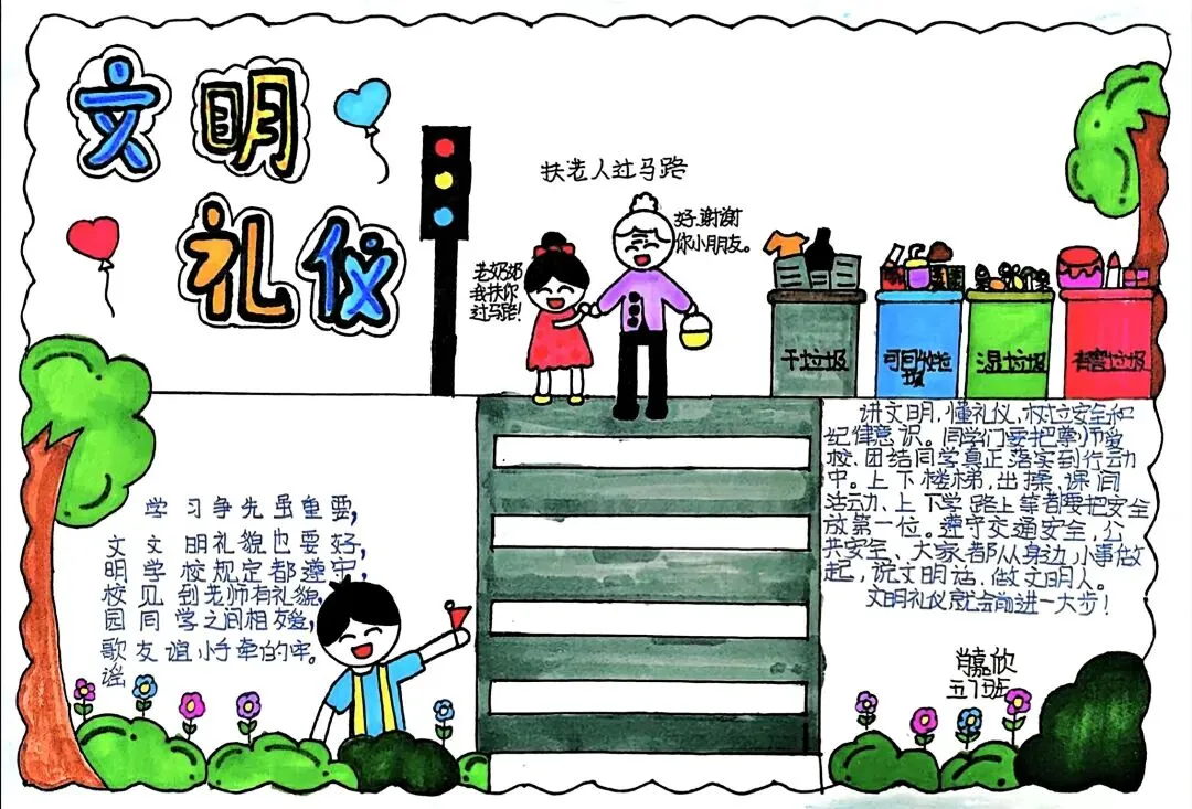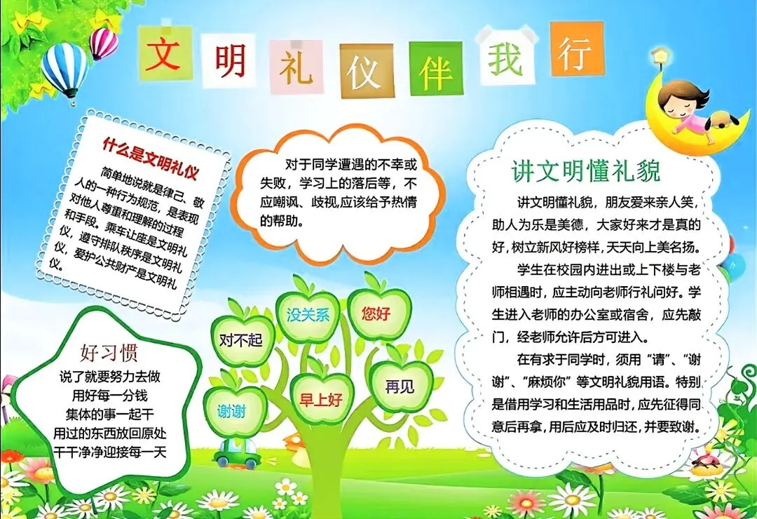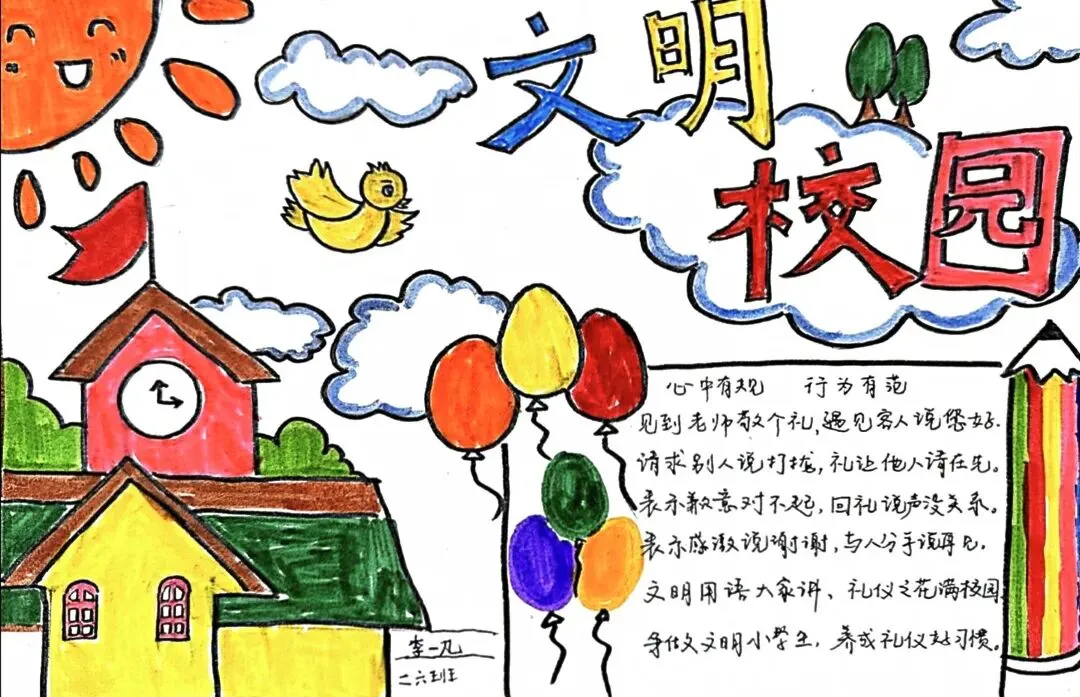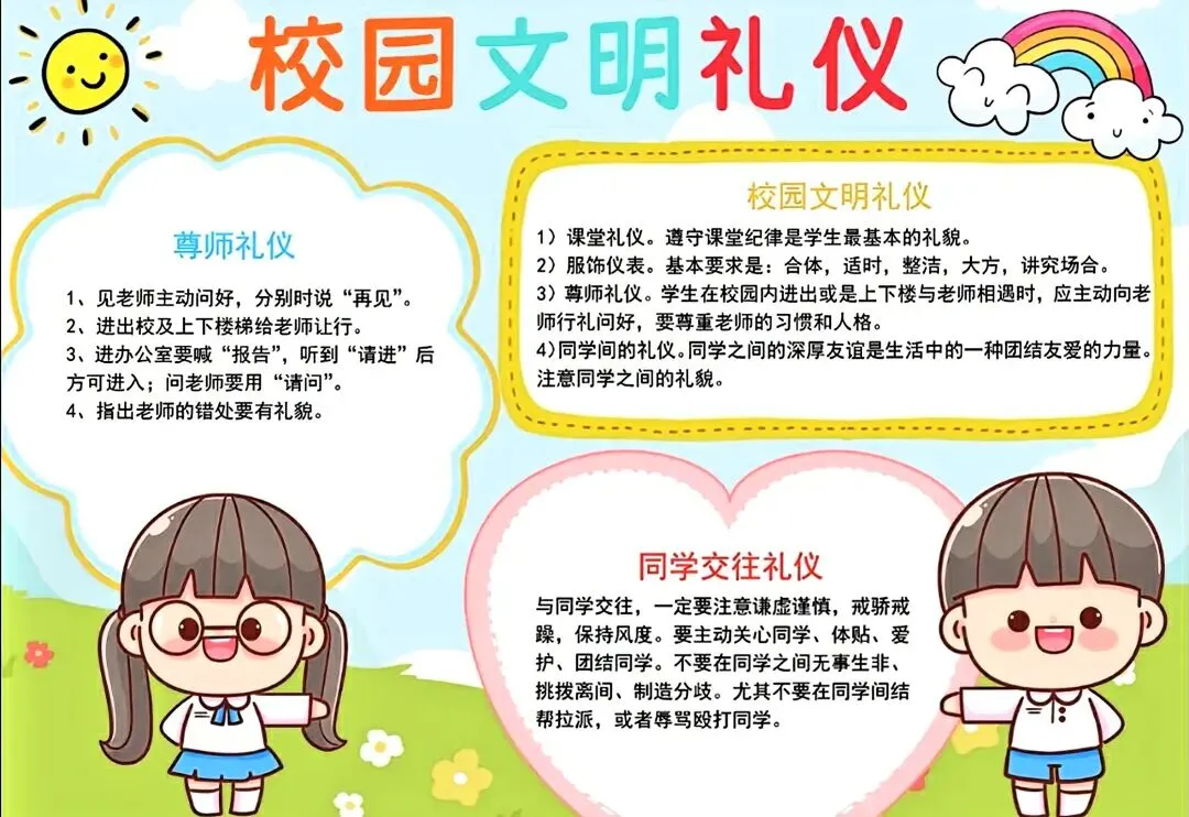 文明礼仪是中小学生日常德育学习的重要模块,很多学校都会布置相关的手抄报作业,今天给大家分享的是适配中小学作业要求的卡通风「文明礼仪伴我行」主题手抄报,符合中文手抄报的排版和书写要求,完成难度不高。先给大家梳理下老师对手抄报作业的常见要求,做的时候对照着来就不容易出问题:✅ 主题明确:所有内容、装饰元素都要紧扣文明礼仪主题,不要加和主题无关的图案✅ 内容充实:可以覆盖校园礼仪、公共场合礼仪、常用礼貌用语等不同方向的内容,不要大段留白✅ 版面整洁:纸面无明显涂改痕迹,排版疏密得当,不要出现文字、图案堆在一起的情况✅ 书写工整:中文书写要规范,尽量用正楷,辨识度高,不要用太夸张的字体写正文内容✅ 色彩协调:整体配色统一和谐,符合卡通风的活泼感但不要过于杂乱刺眼接下来是需要准备的文具清单,都是日常常用的文具,不用特意买新材料:🔹 纸张:A3 或 A4 白色卡纸,硬度够不容易皱,学校没有特殊要求的话选 A4 就够用🔹 打稿工具:HB 铅笔、4B 橡皮,HB 铅笔打稿痕迹轻,4B 橡皮擦得干净不留黑印🔹 辅助工具:15cm 直尺,用来画板块分割线、边框以及写正文前打辅助线🔹 描线书写工具:0.5mm 黑色针管勾线笔(写正文内容)、1mm 黑色粗头勾线笔(描图案和大标题轮廓)