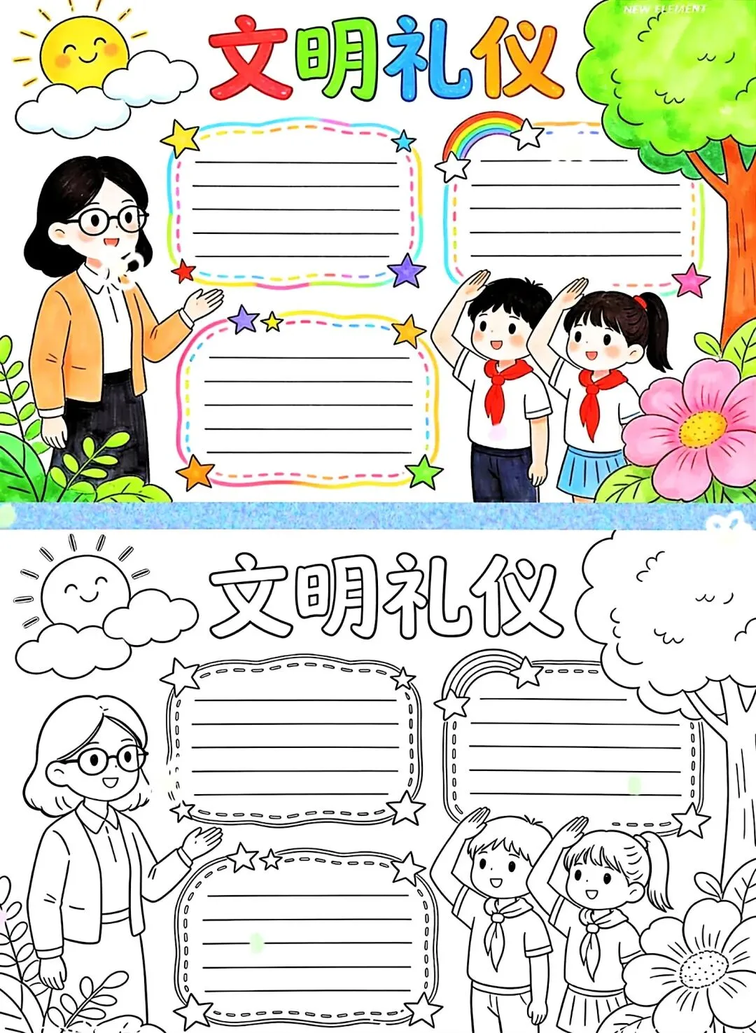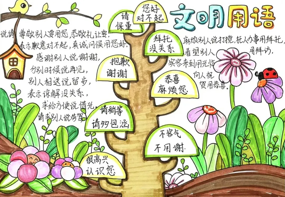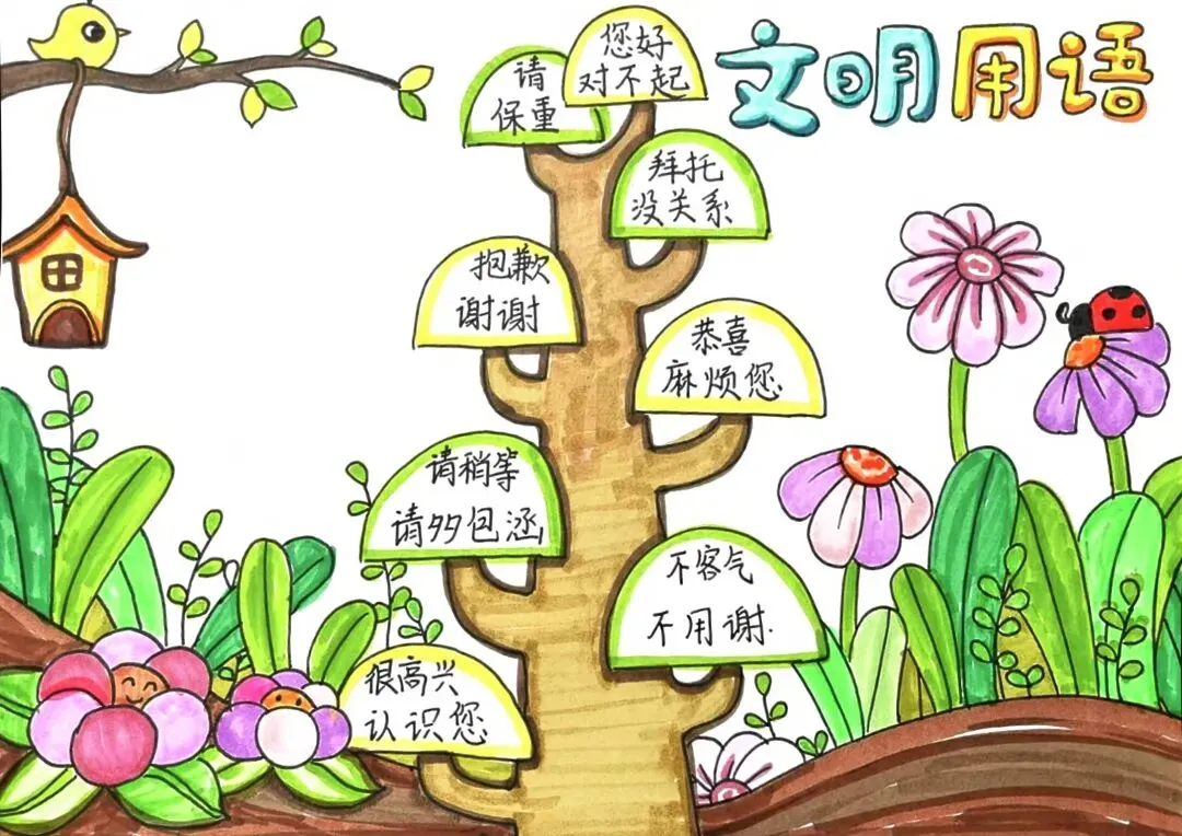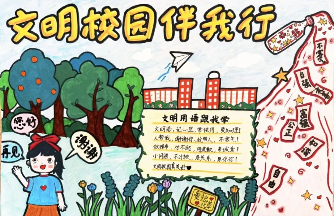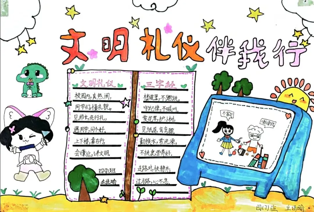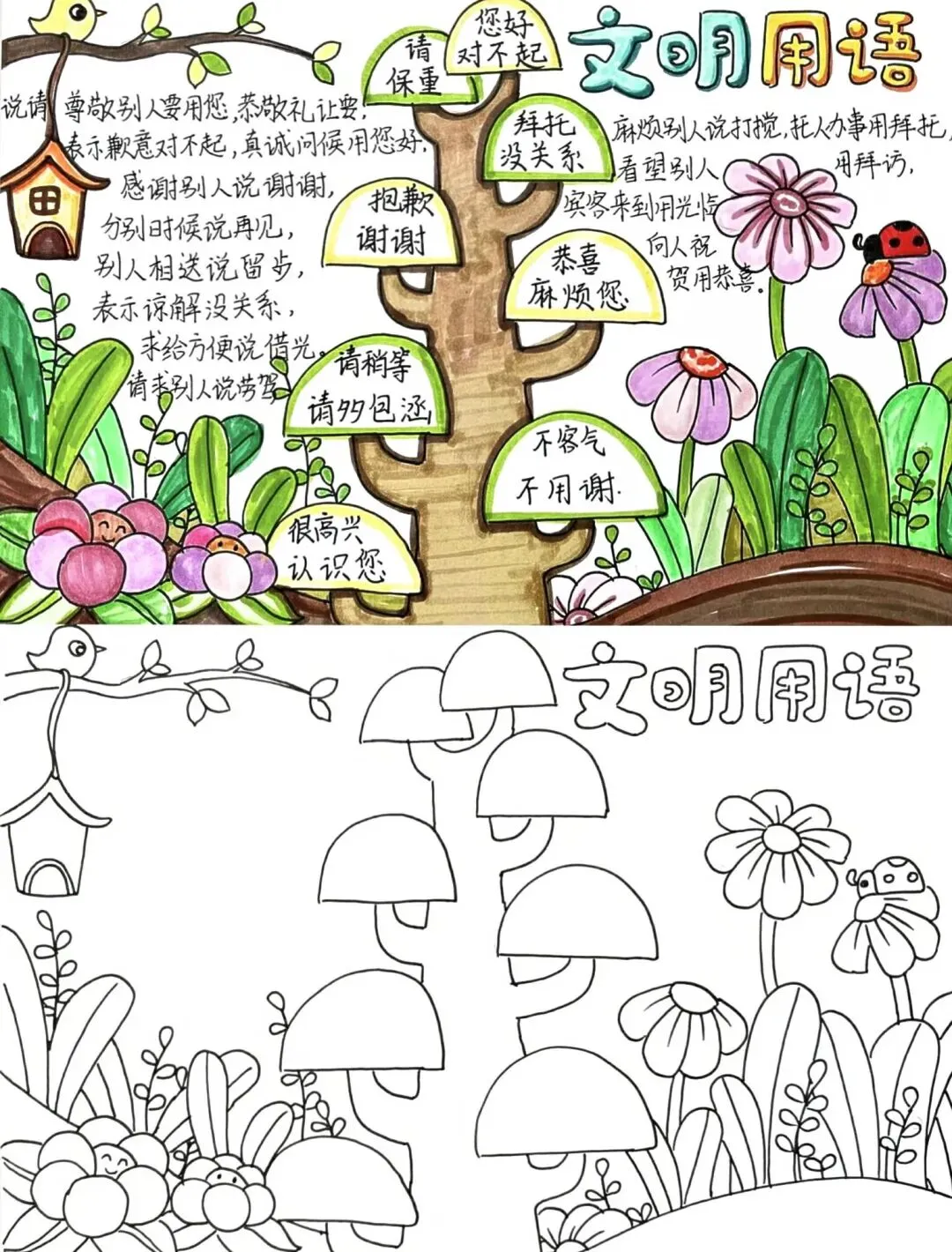 文明礼仪是中小学生日常德育学习的重要模块,很多学校都会布置相关的手抄报作业,今天给大家分享的是适配中小学作业要求的卡通风「文明礼仪伴我行」主题手抄报,符合中文手抄报的排版和书写要求,完成难度不高。先给大家梳理下老师对手抄报作业的常见要求,做的时候对照着来就不容易出问题:✅ 主题明确:所有内容、装饰元素都要紧扣文明礼仪主题,不要加和主题无关的图案✅ 内容充实:可以覆盖校园礼仪、公共场合礼仪、常用礼貌用语等不同方向的内容,不要大段留白✅ 版面整洁:纸面无明显涂改痕迹,排版疏密得当,不要出现文字、图案堆在一起的情况✅ 书写工整:中文书写要规范,尽量用正楷,辨识度高,不要用太夸张的字体写正文内容✅ 色彩协调:整体配色统一和谐,符合卡通风的活泼感但不要过于杂乱刺眼接下来是需要准备的文具清单,都是日常常用的文具,不用特意买新材料:🔹 纸张:A3 或 A4 白色卡纸,硬度够不容易皱,学校没有特殊要求的话选 A4 就够用🔹 打稿工具:HB 铅笔、4B 橡皮,HB 铅笔打稿痕迹轻,4B 橡皮擦得干净不留黑印🔹 辅助工具:15cm 直尺,用来画板块分割线、边框以及写正文前打辅助线🔹 描线书写工具:0.5mm 黑色针管勾线笔(写正文内容)、1mm 黑色粗头勾线笔(描图案和大标题轮廓)