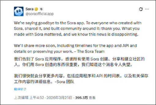 依据官方声明,Sora的消费者端应用、开发者接口以及ChatGPT相关功能将全面关闭。团队于社交平台发布告别信,承诺会公布用户内容保存方案以及具体的停运时间表,在感谢用户创作支持的同时,也承认停运决定“令人失望”,但并未说明具体原因。