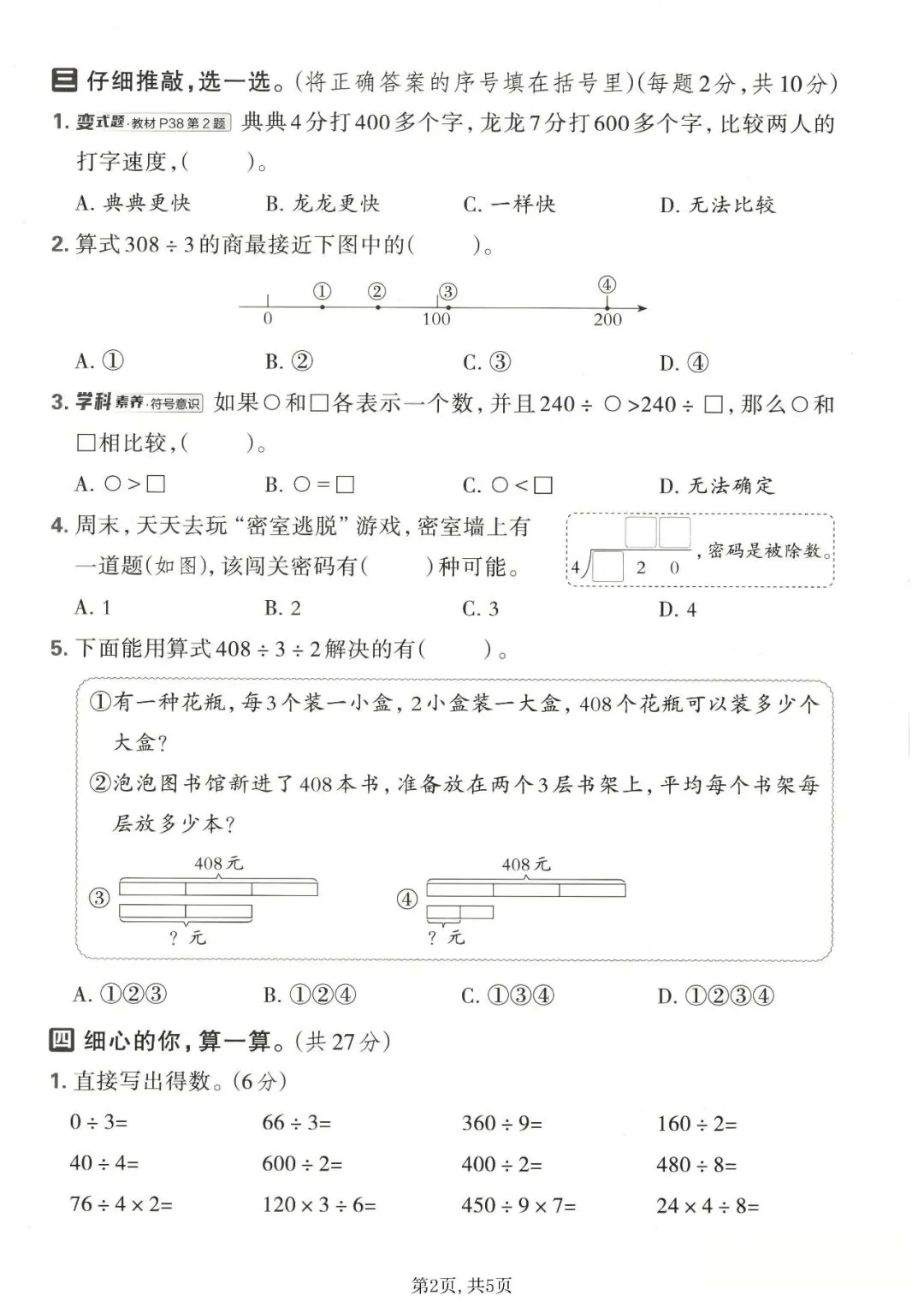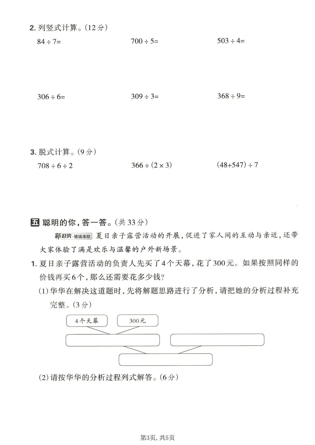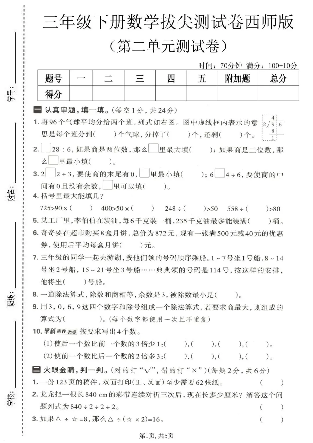 三年级(下)数学第二单元拔尖测试卷《西师版》,高清完整电子版可打印