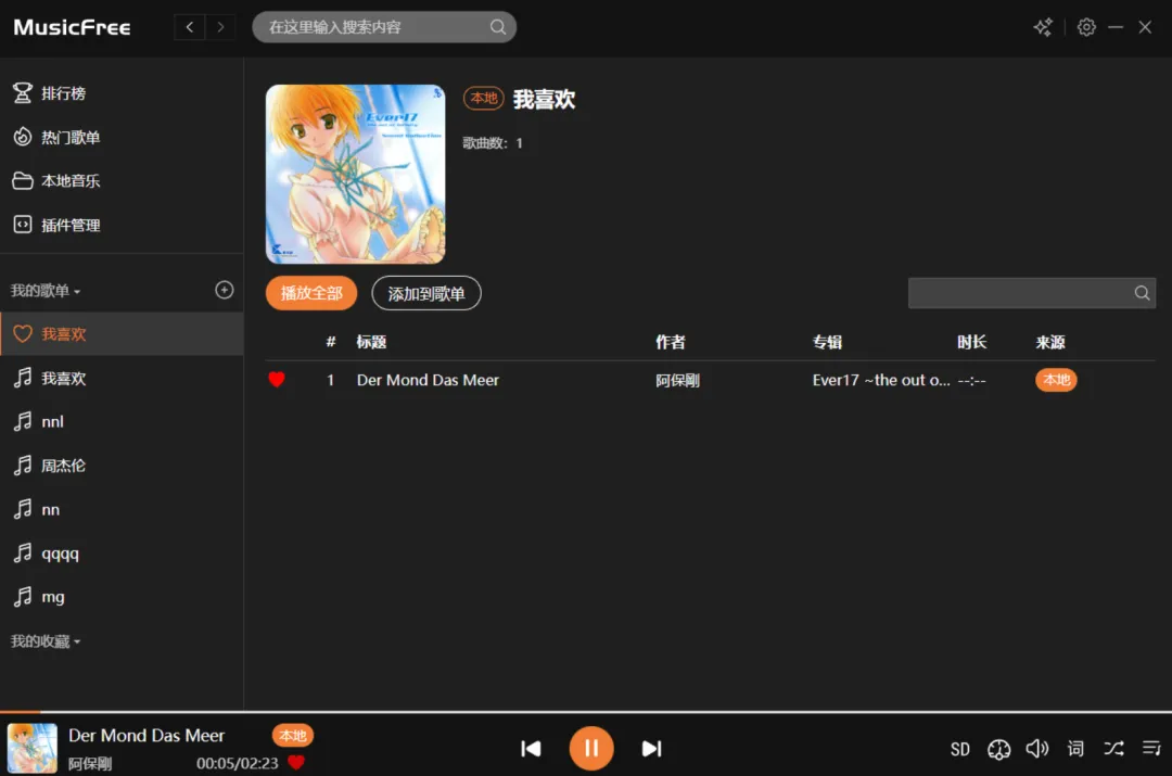 在搜索框输入歌名或歌手,MusicFree 会调用已安装的插件进行搜索,结果来自多个音源,可以对比自己选择音质最好的版本。