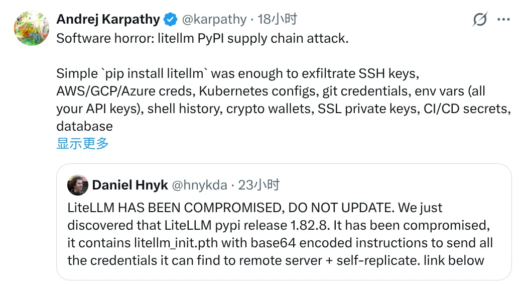 Andrej 用罕见的严肃语气告诉所有开发者:如果你在过去几天安装或更新了litellm,你的所有云凭证可能已经落入他人之手。