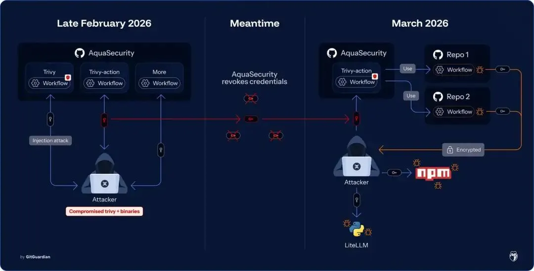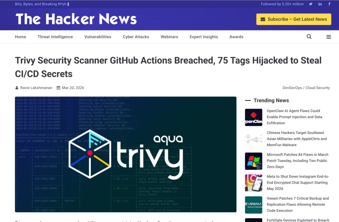 故事要从Trivy说起。Trivy是一款广受欢迎的开源安全扫描工具,被无数开发团队用来检测容器镜像和代码库中的漏洞。然而,正是这个用来保护我们的工具,自己却成为了攻击的突破口。黑客成功入侵了Trivy的某个组件,获得了对下游项目的访问权限。