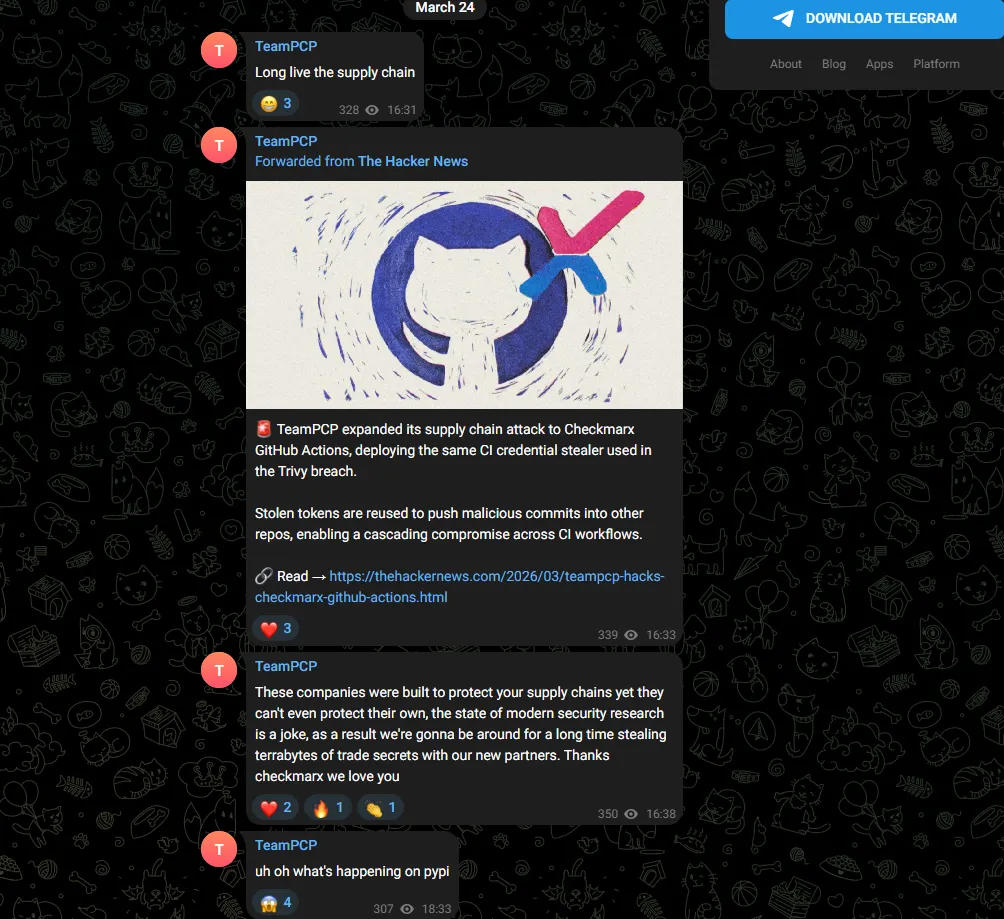 如果说这次攻击本身已经够让人愤怒,那么攻击者的态度更是让人不寒而栗。一个名为TeamPCP的黑客组织在Telegram上公开炫耀他们的攻击成果,毫不掩饰自己的嚣张气焰。