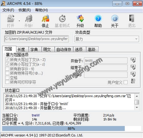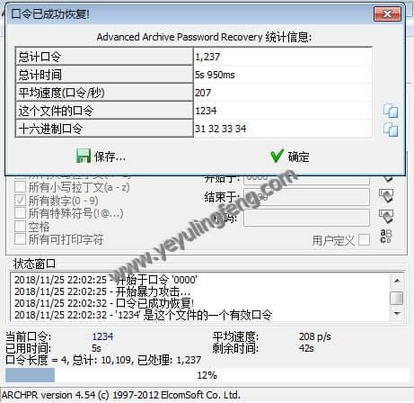 然后一定要记得勾选暴力范围,考虑到时间问题,这里老夜测试的是密码为1234的一个压缩包