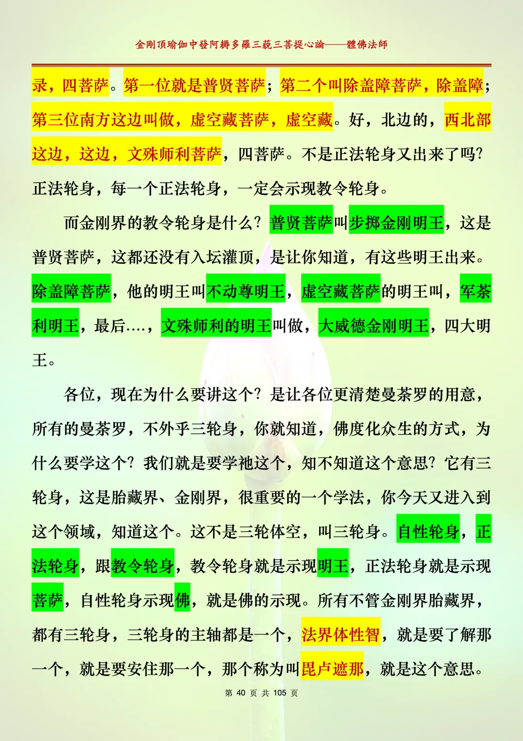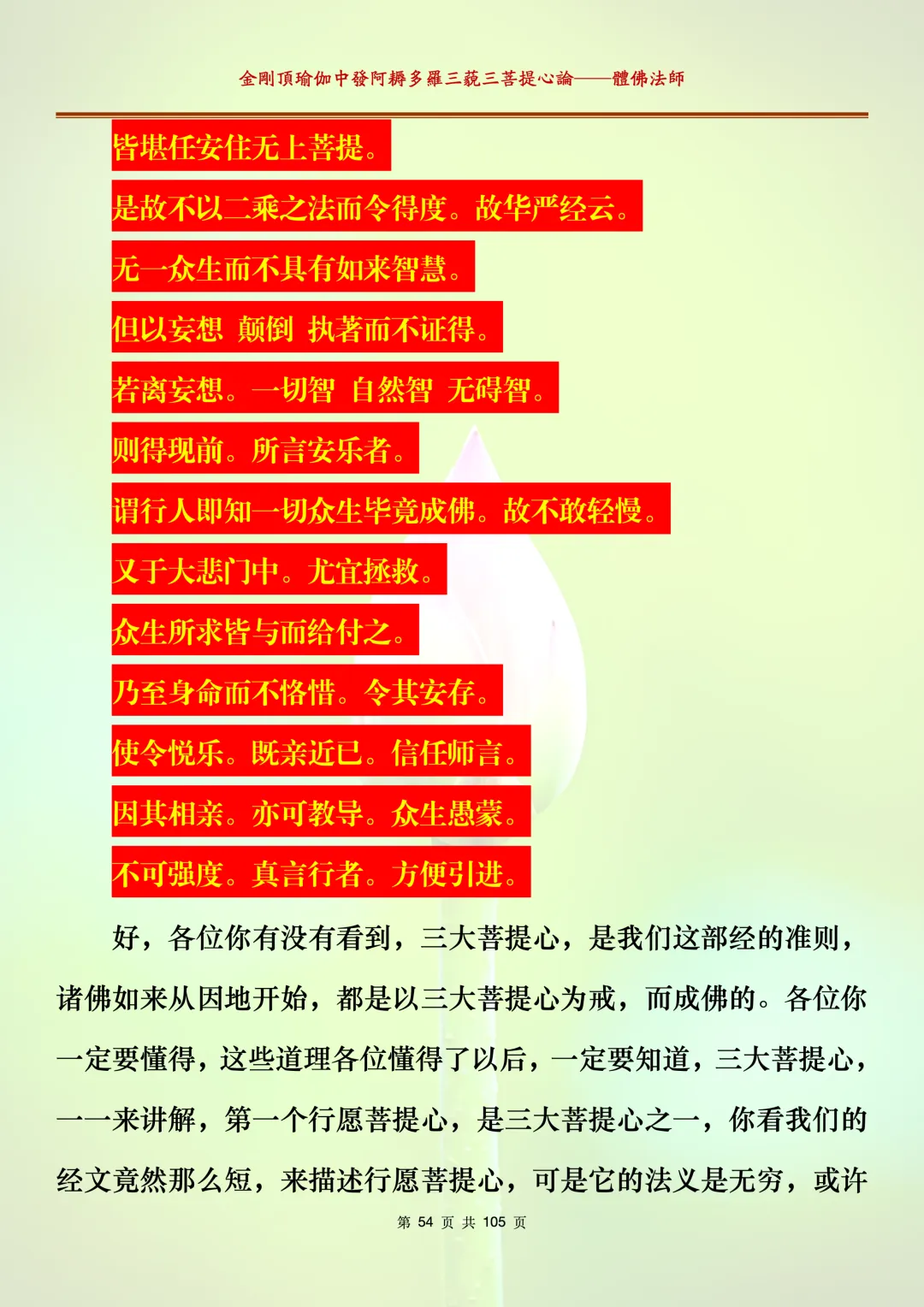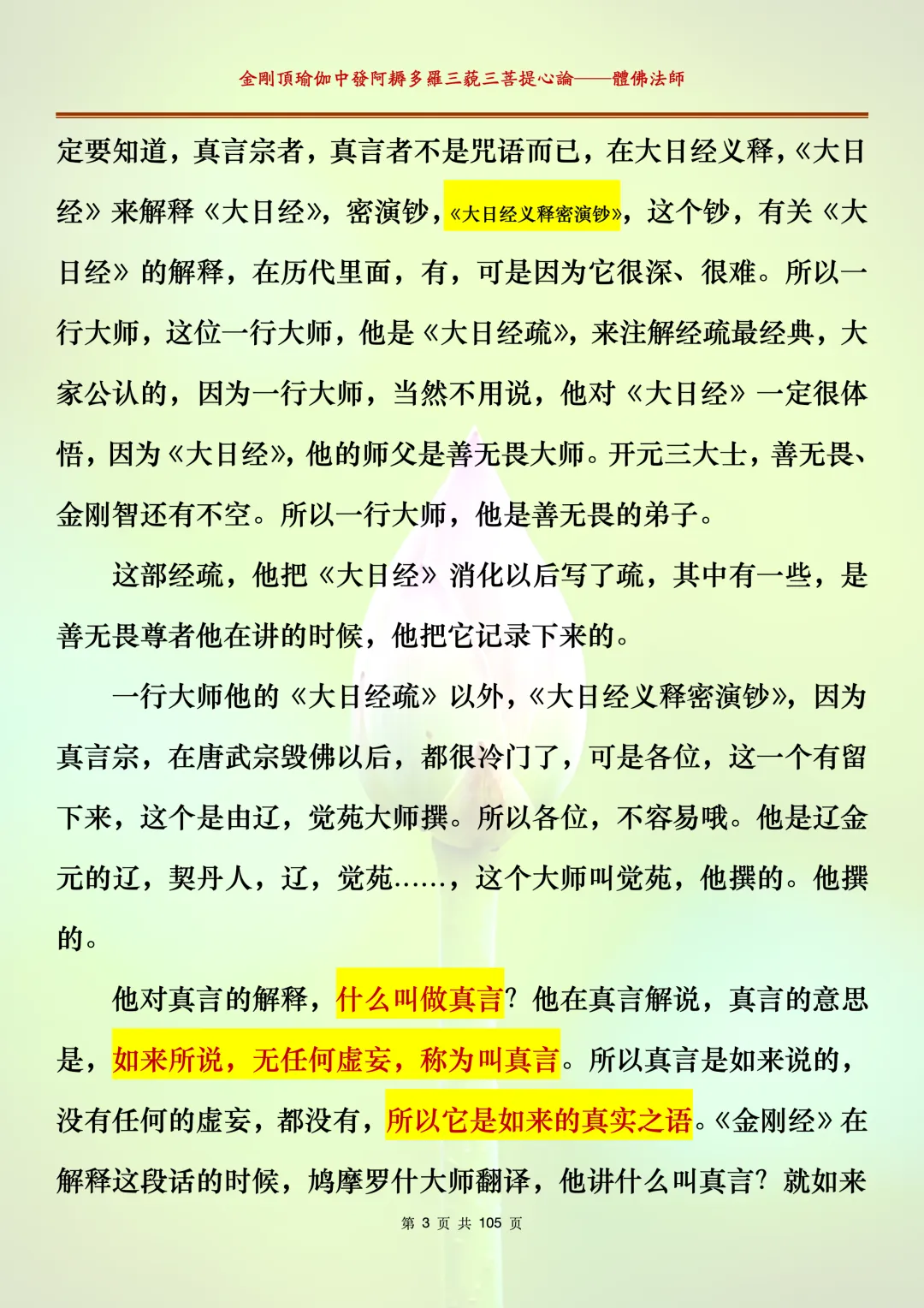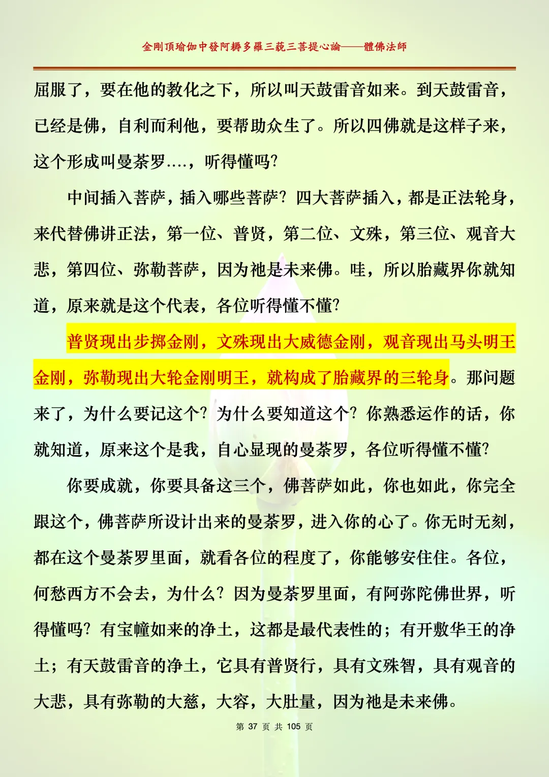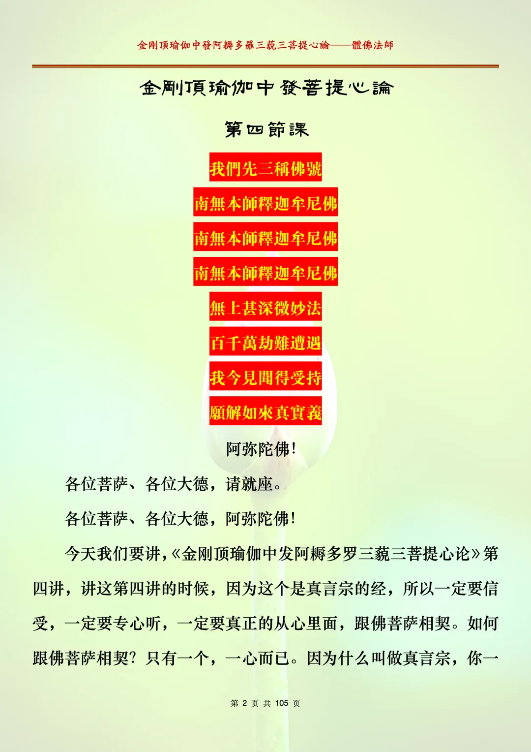体佛法师讲解的《金刚顶瑜伽中发阿耨多罗三藐三菩提心论》讲义,文字文档分享,是严格按照视频所讲,一句一句校对而整理,不出自禅院、不出自任何团队,也非视频转换软件提取的文字,最大限度的避免错字、错句的出现,所有标注颜色的地方,是个人依据法师的视频讲义学习的个人感悟所标注,不代表就非是重点。因为每个人的根基不同,体悟自然不同。每一节课分成二段或者三段,依次分享。