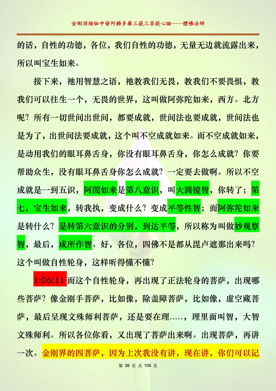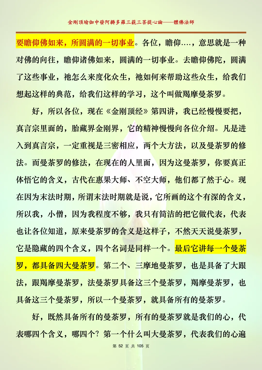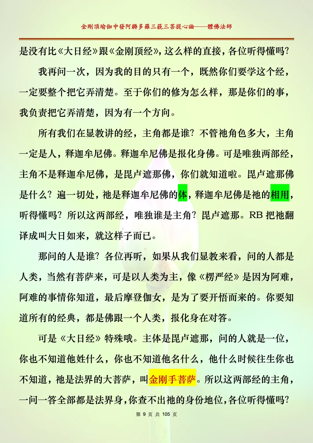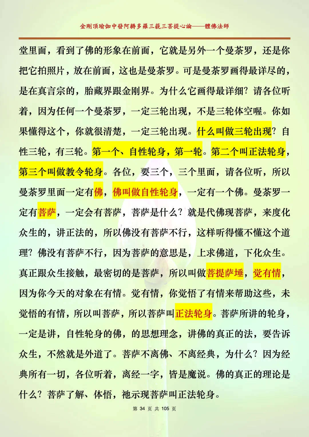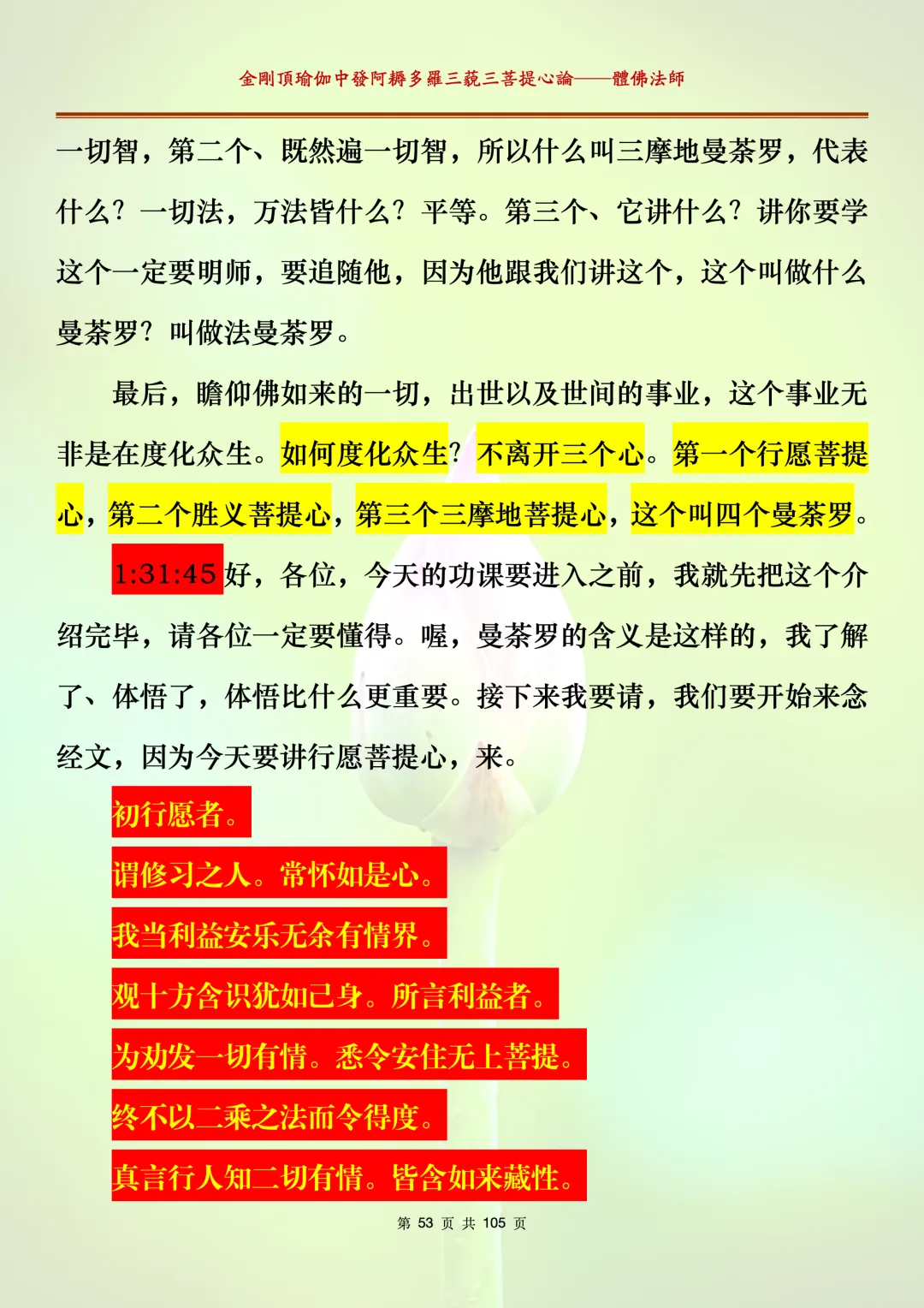 体佛法师讲解的《金刚顶瑜伽中发阿耨多罗三藐三菩提心论》讲义,文字文档分享,是严格按照视频所讲,一句一句校对而整理,不出自禅院、不出自任何团队,也非视频转换软件提取的文字,最大限度的避免错字、错句的出现,所有标注颜色的地方,是个人依据法师的视频讲义学习的个人感悟所标注,不代表就非是重点。因为每个人的根基不同,体悟自然不同。每一节课分成二段或者三段,依次分享。