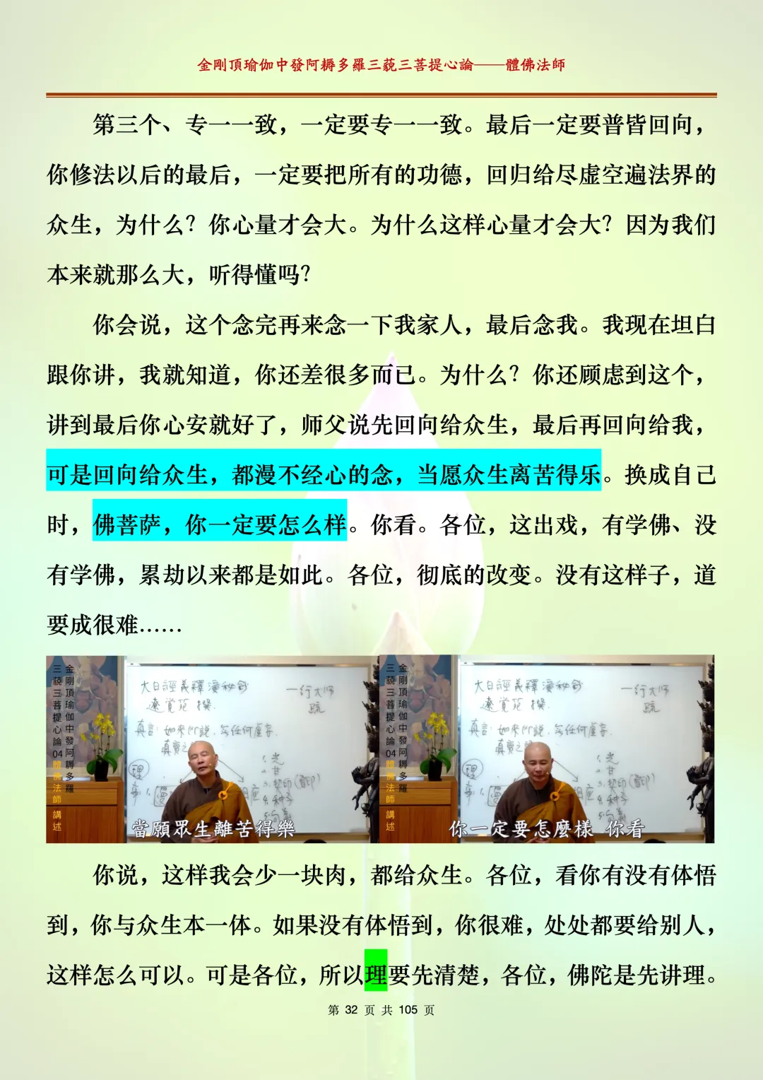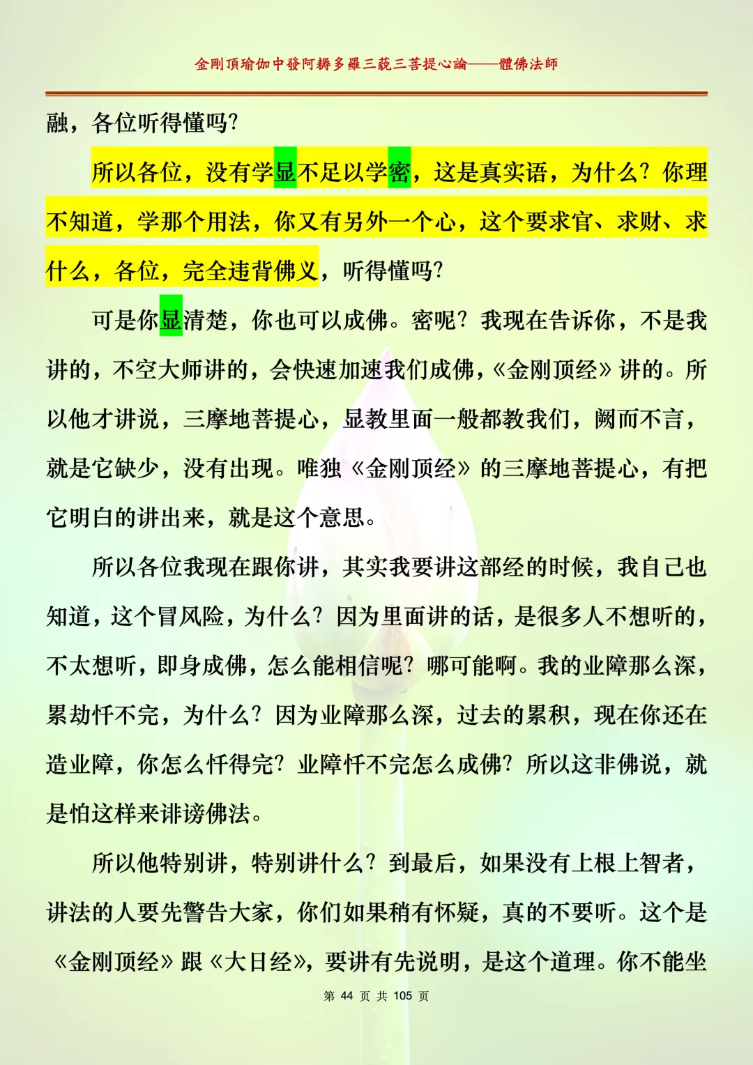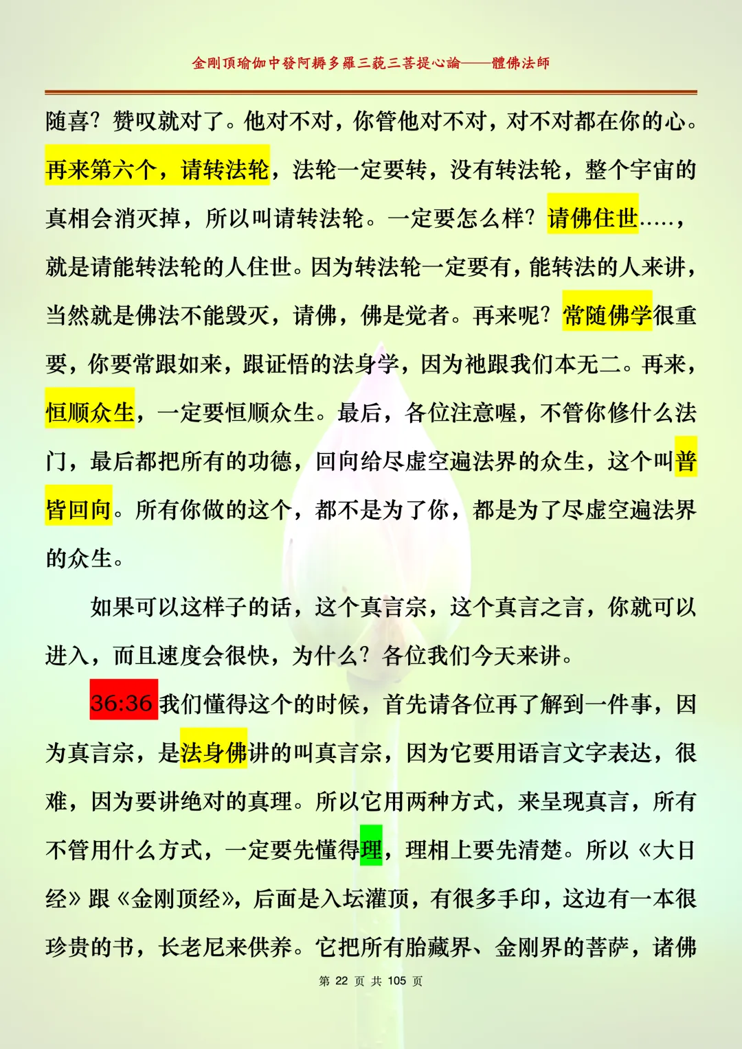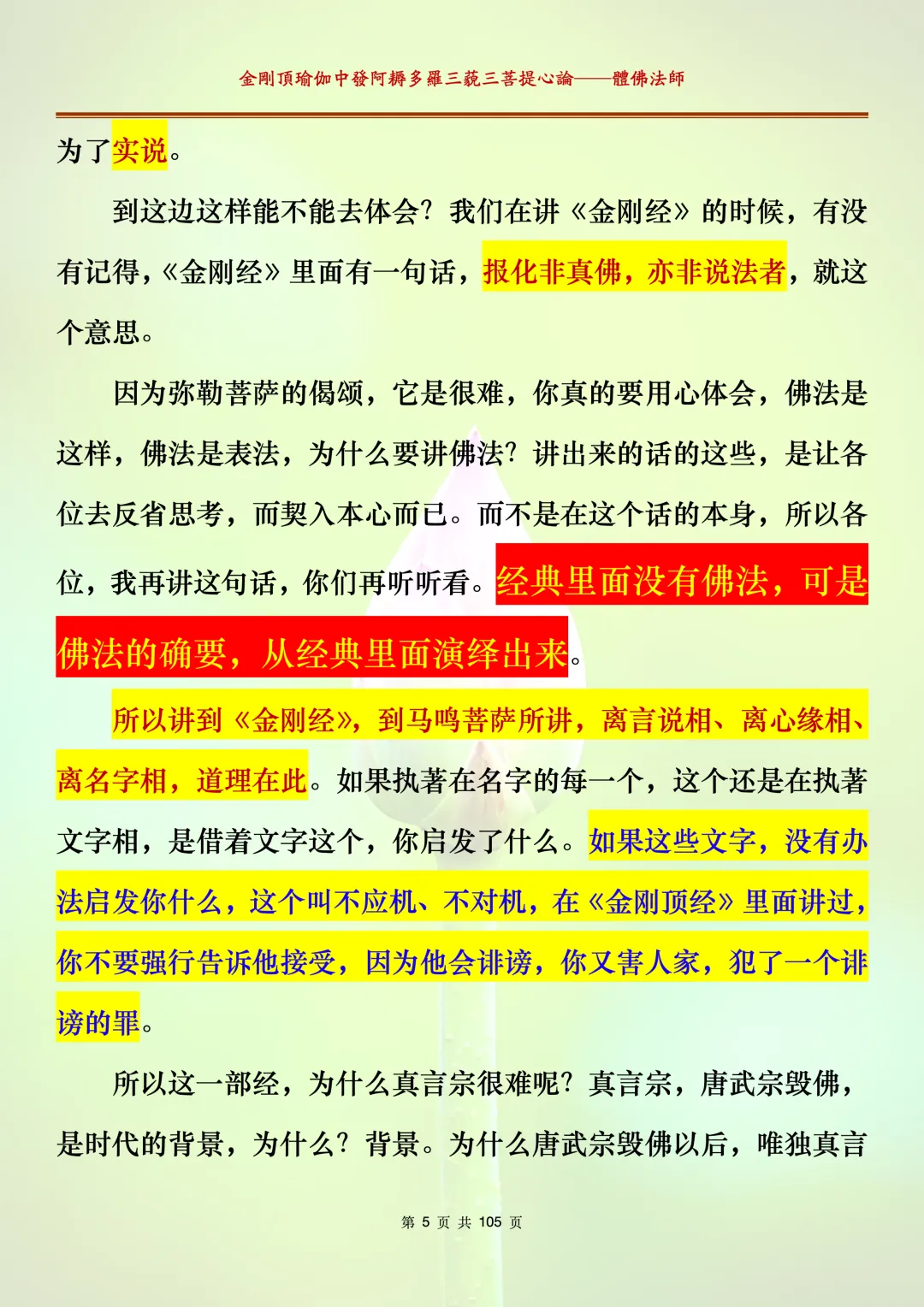 体佛法师讲解的《金刚顶瑜伽中发阿耨多罗三藐三菩提心论》讲义,文字文档分享,是严格按照视频所讲,一句一句校对而整理,不出自禅院、不出自任何团队,也非视频转换软件提取的文字,最大限度的避免错字、错句的出现,所有标注颜色的地方,是个人依据法师的视频讲义学习的个人感悟所标注,不代表就非是重点。因为每个人的根基不同,体悟自然不同。每一节课分成二段或者三段,依次分享。