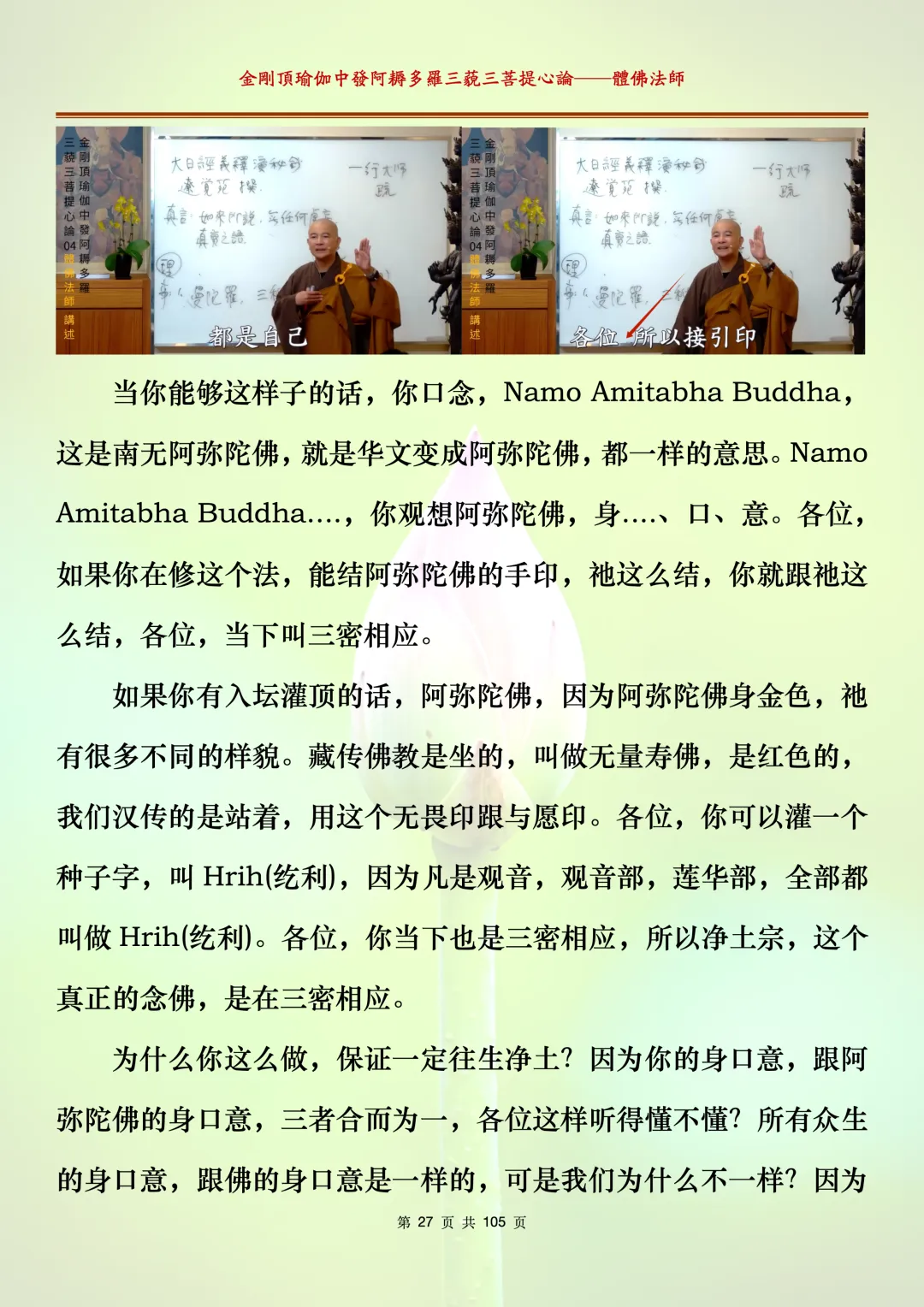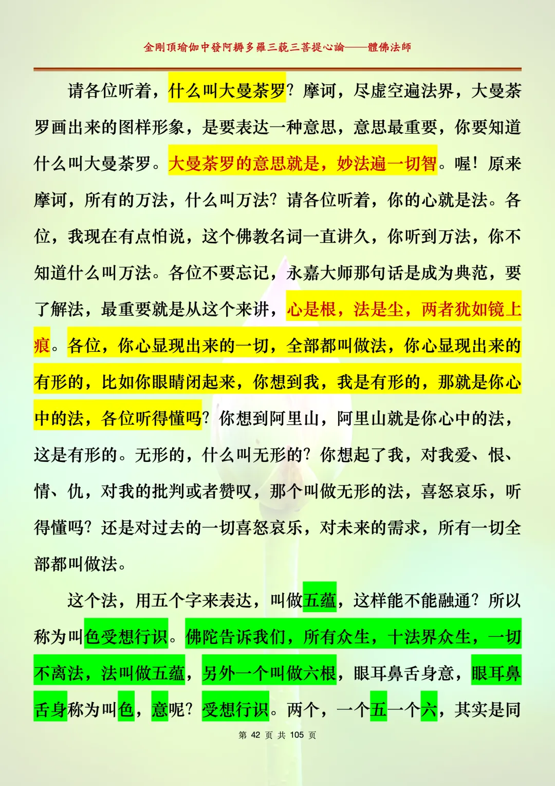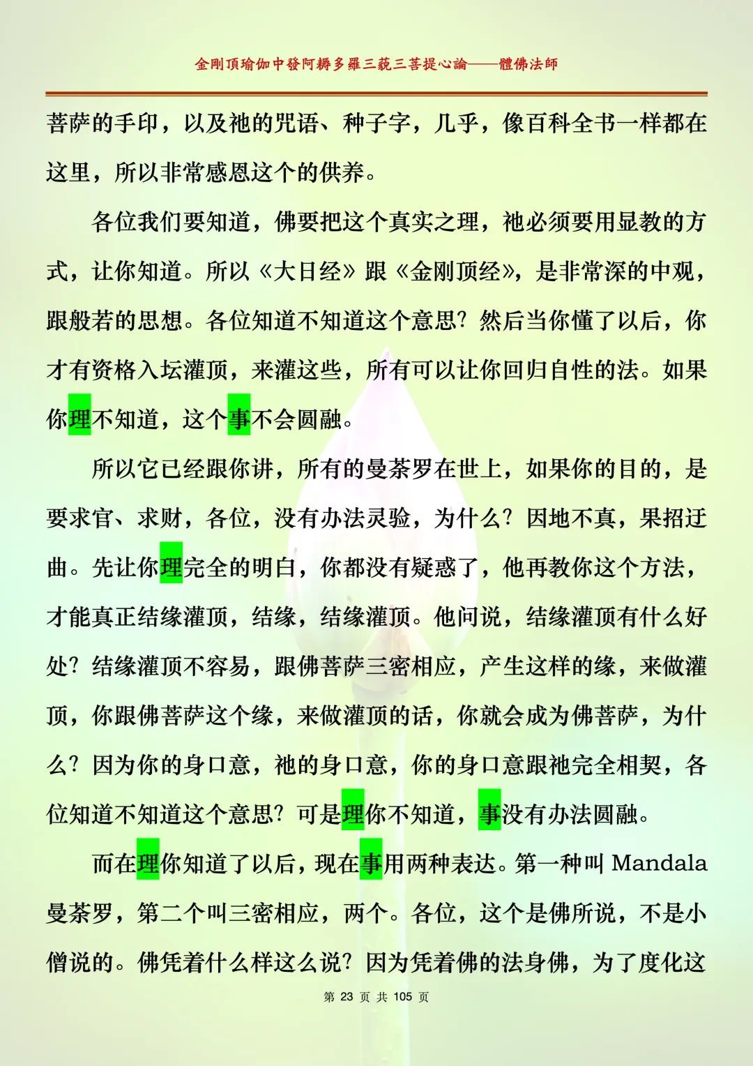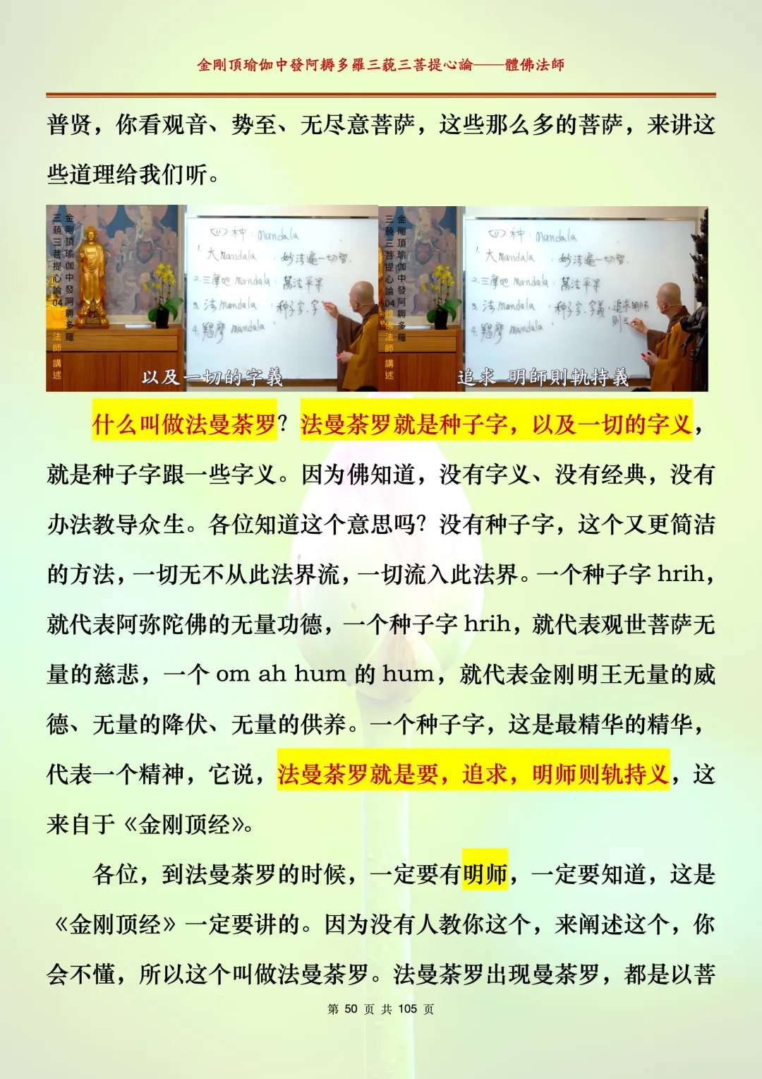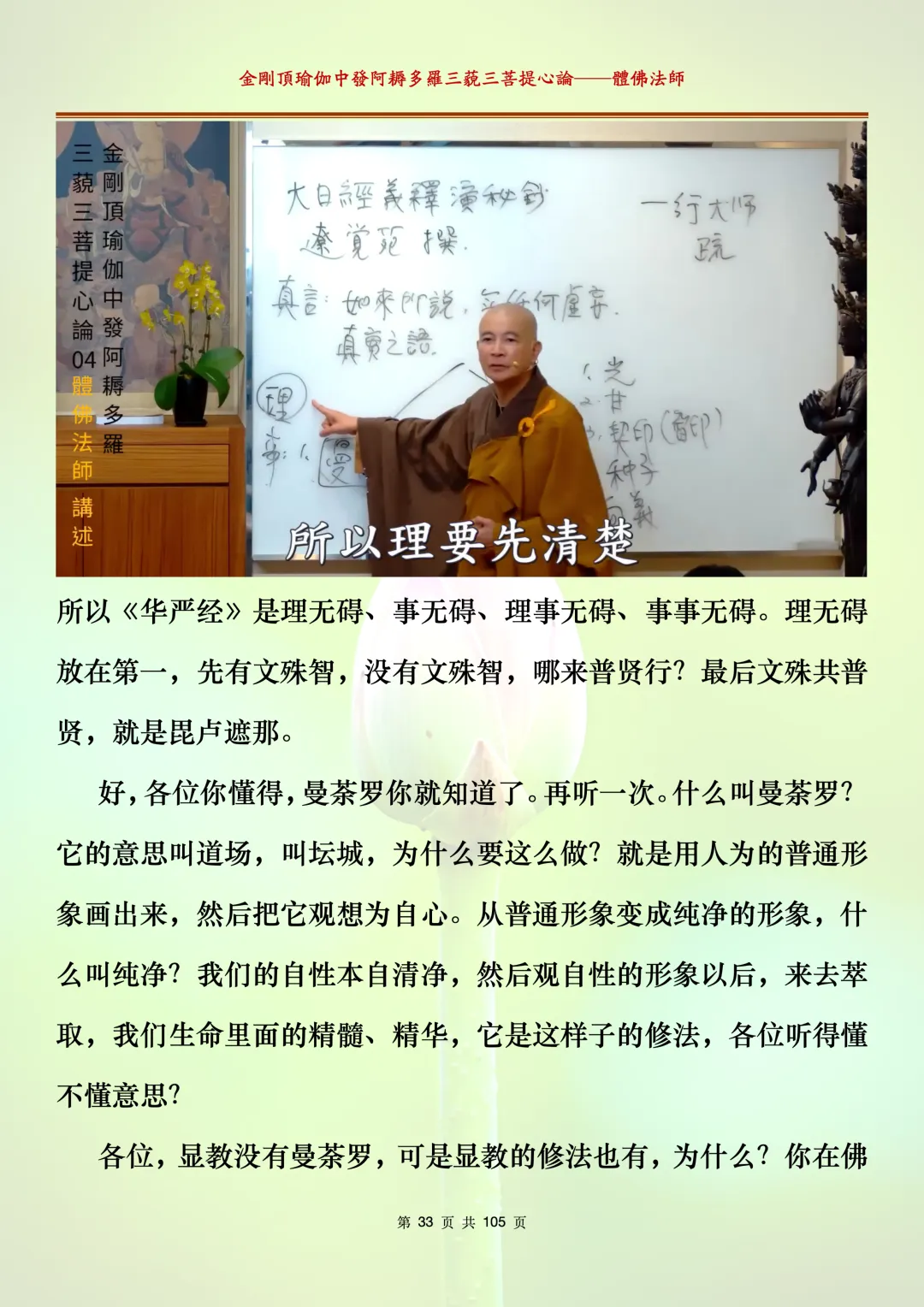 体佛法师讲解的《金刚顶瑜伽中发阿耨多罗三藐三菩提心论》讲义,文字文档分享,是严格按照视频所讲,一句一句校对而整理,不出自禅院、不出自任何团队,也非视频转换软件提取的文字,最大限度的避免错字、错句的出现,所有标注颜色的地方,是个人依据法师的视频讲义学习的个人感悟所标注,不代表就非是重点。因为每个人的根基不同,体悟自然不同。每一节课分成二段或者三段,依次分享。