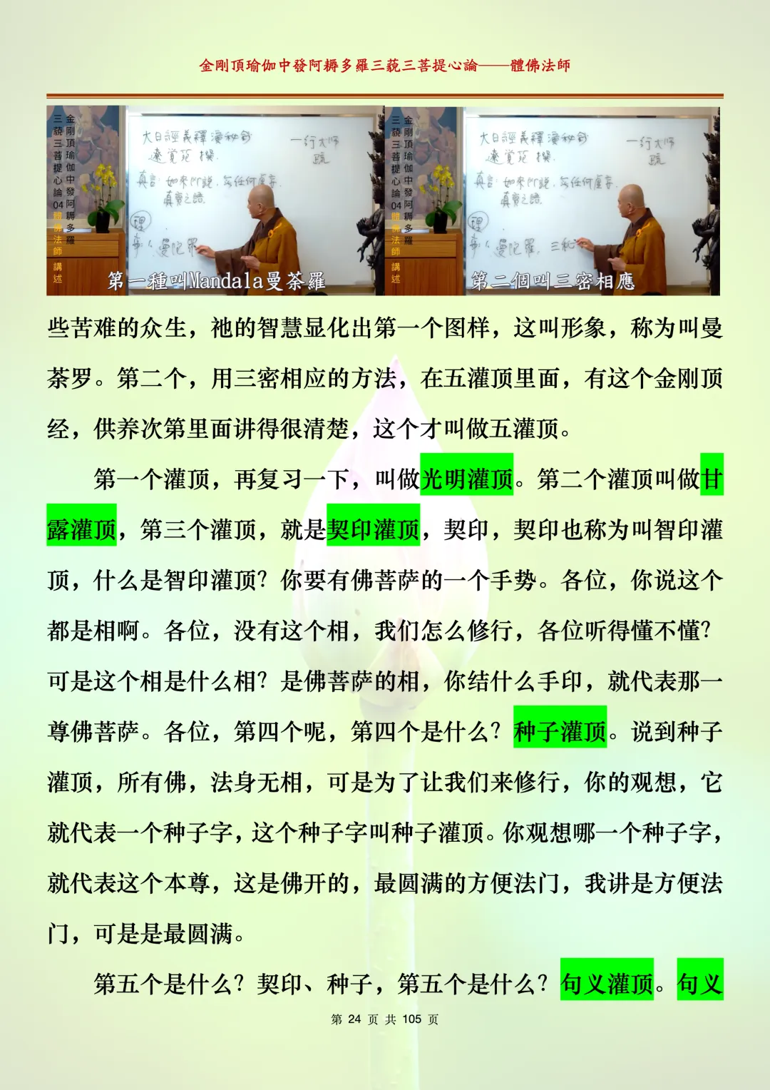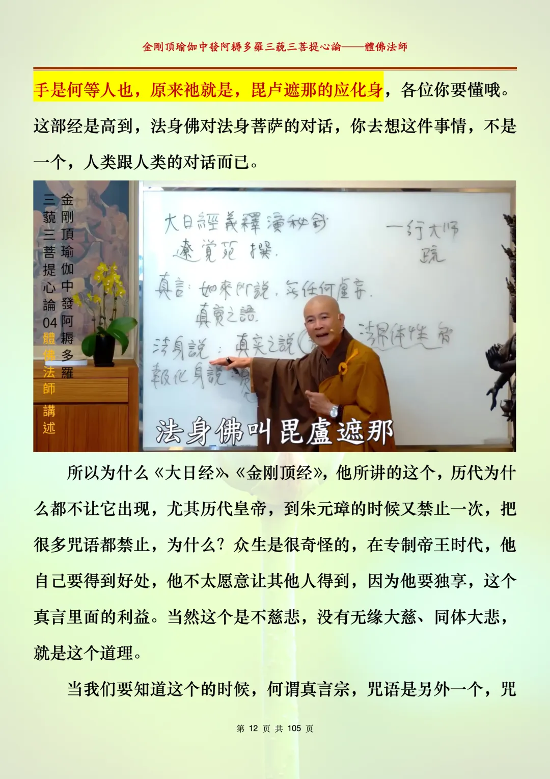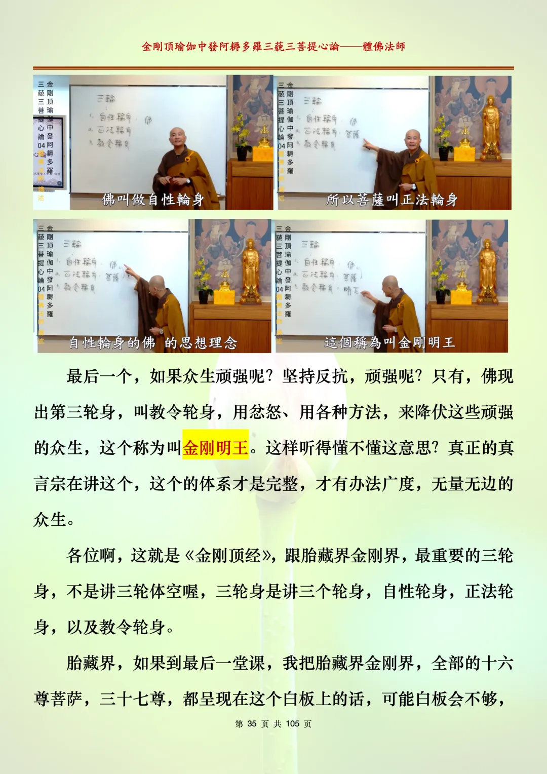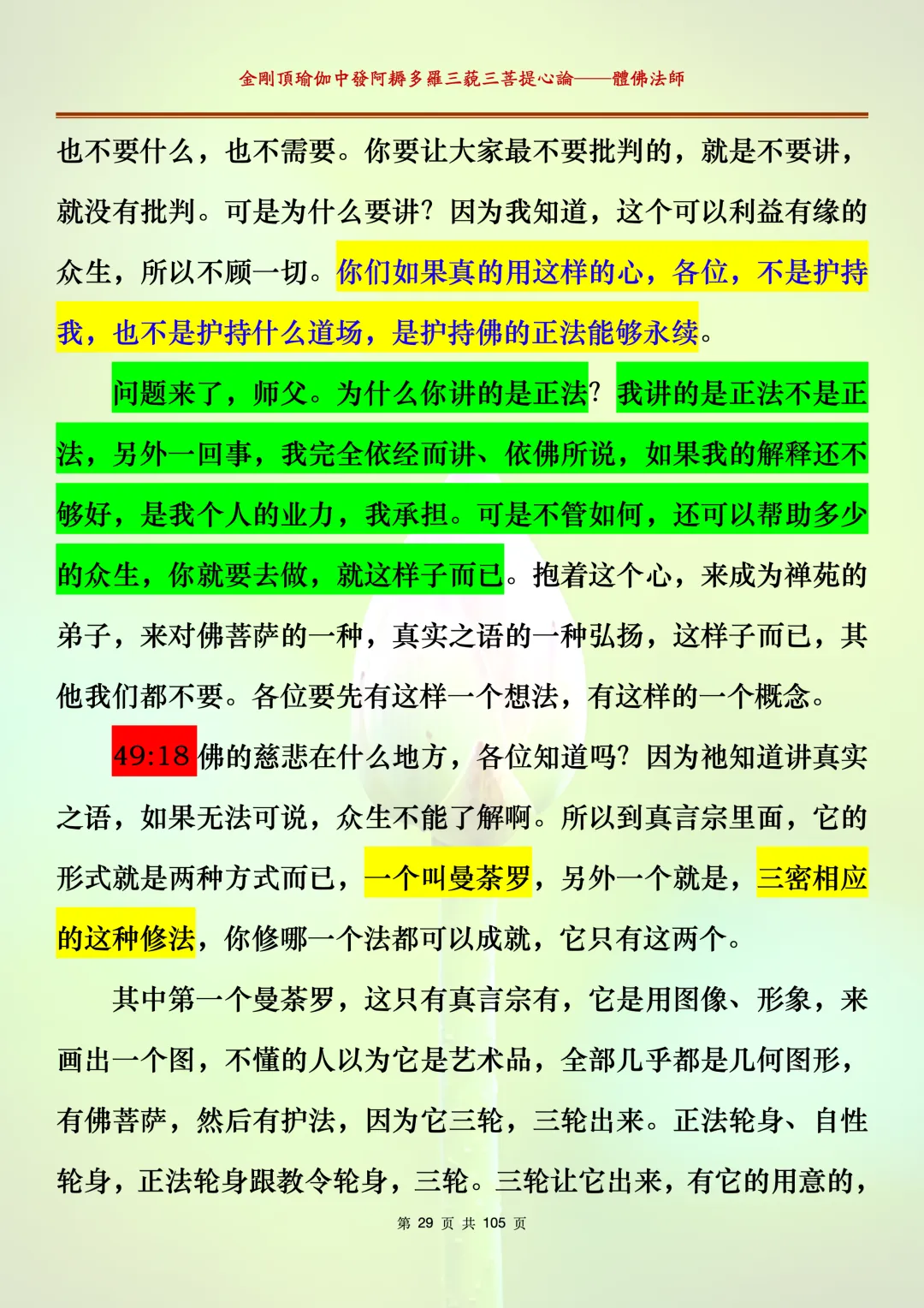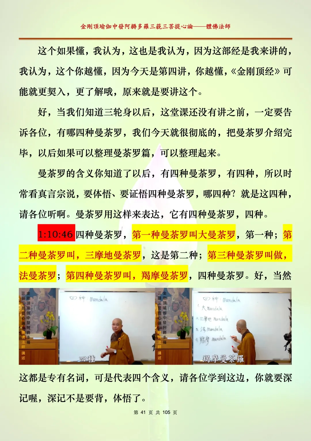 体佛法师讲解的《金刚顶瑜伽中发阿耨多罗三藐三菩提心论》讲义,文字文档分享,是严格按照视频所讲,一句一句校对而整理,不出自禅院、不出自任何团队,也非视频转换软件提取的文字,最大限度的避免错字、错句的出现,所有标注颜色的地方,是个人依据法师的视频讲义学习的个人感悟所标注,不代表就非是重点。因为每个人的根基不同,体悟自然不同。每一节课分成二段或者三段,依次分享。