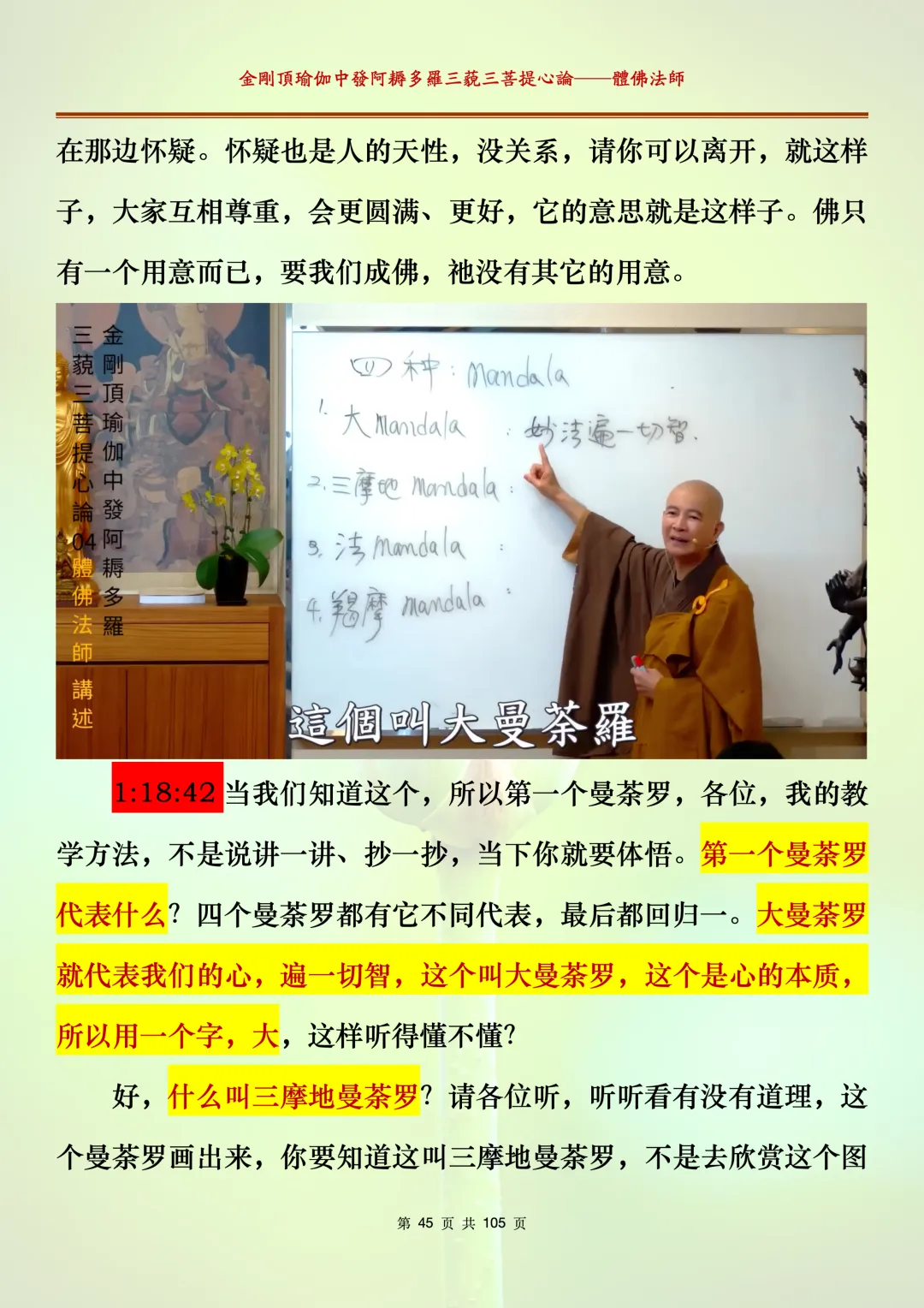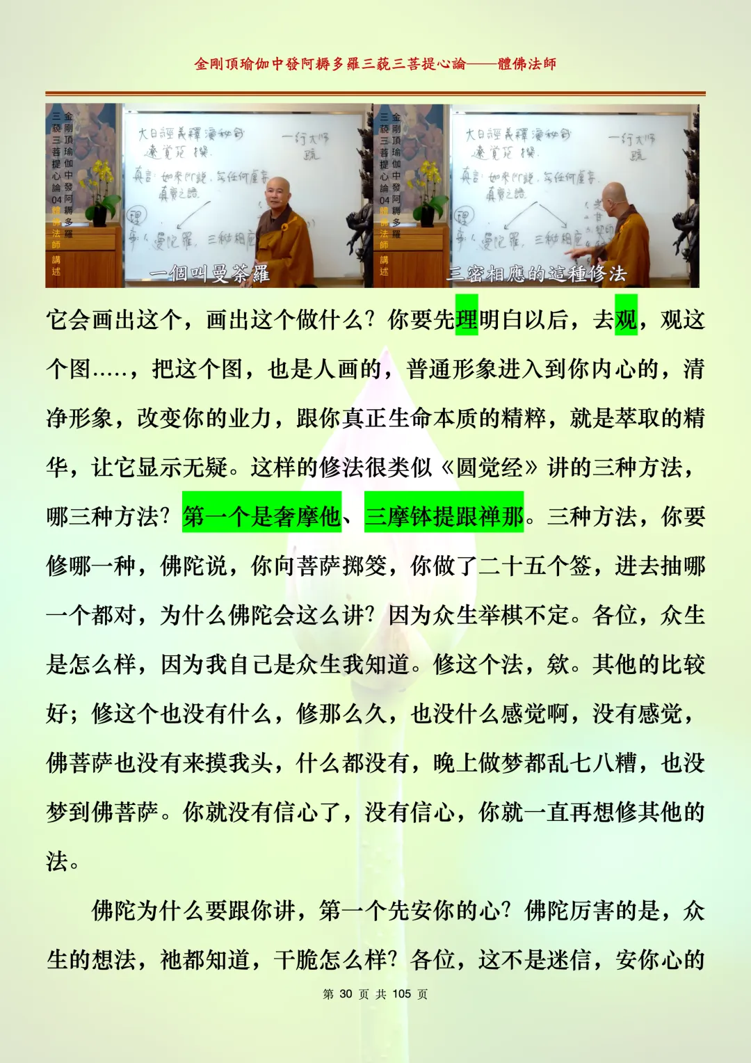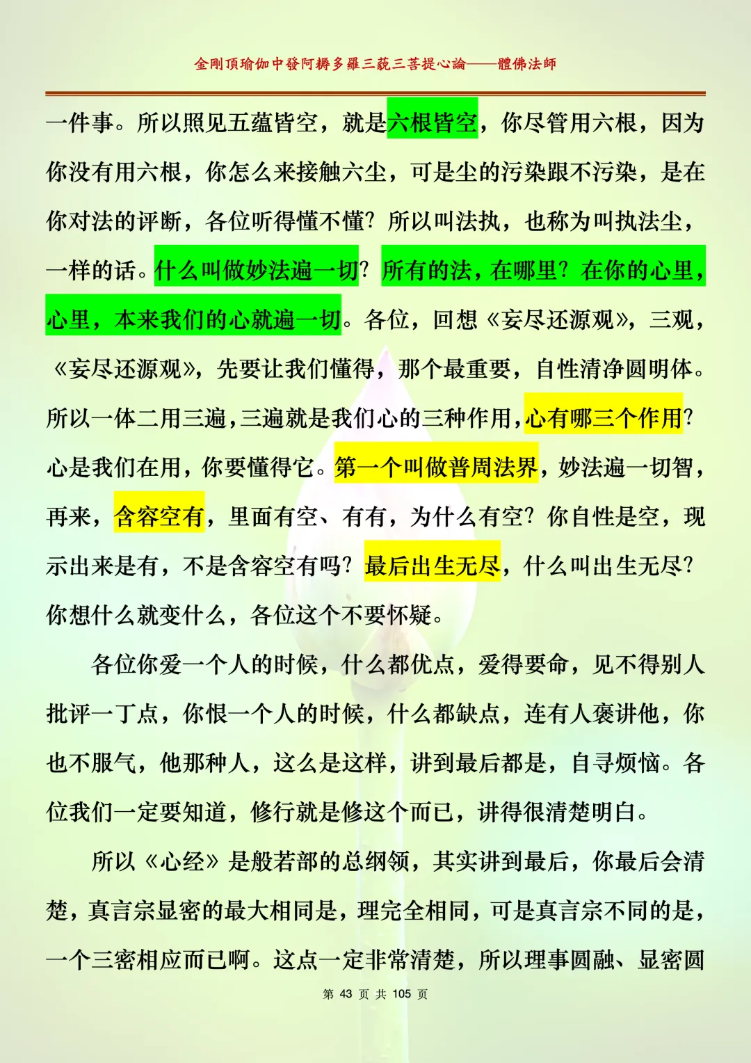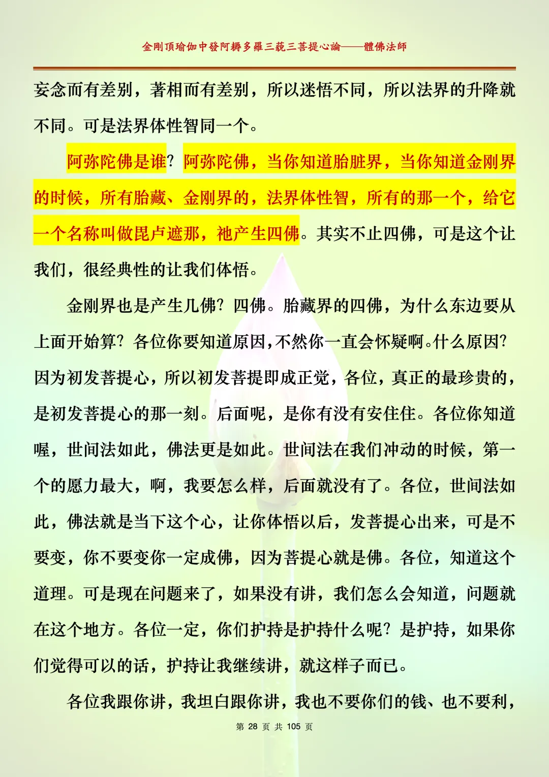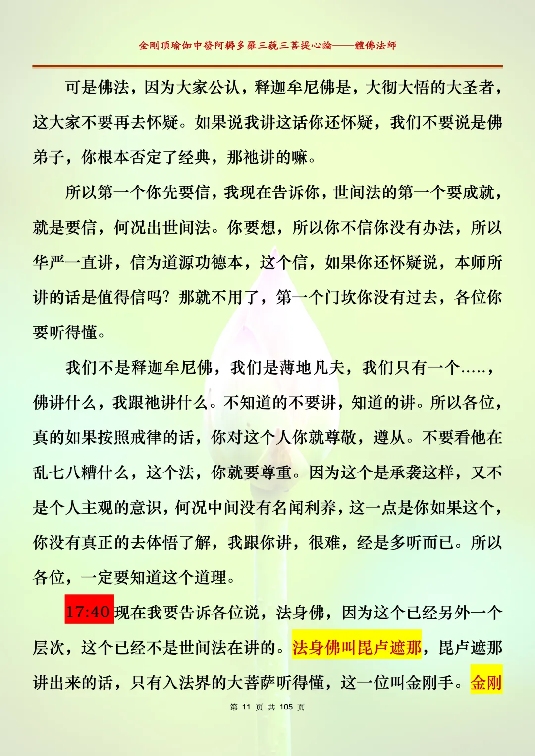 体佛法师讲解的《金刚顶瑜伽中发阿耨多罗三藐三菩提心论》讲义,文字文档分享,是严格按照视频所讲,一句一句校对而整理,不出自禅院、不出自任何团队,也非视频转换软件提取的文字,最大限度的避免错字、错句的出现,所有标注颜色的地方,是个人依据法师的视频讲义学习的个人感悟所标注,不代表就非是重点。因为每个人的根基不同,体悟自然不同。每一节课分成二段或者三段,依次分享。