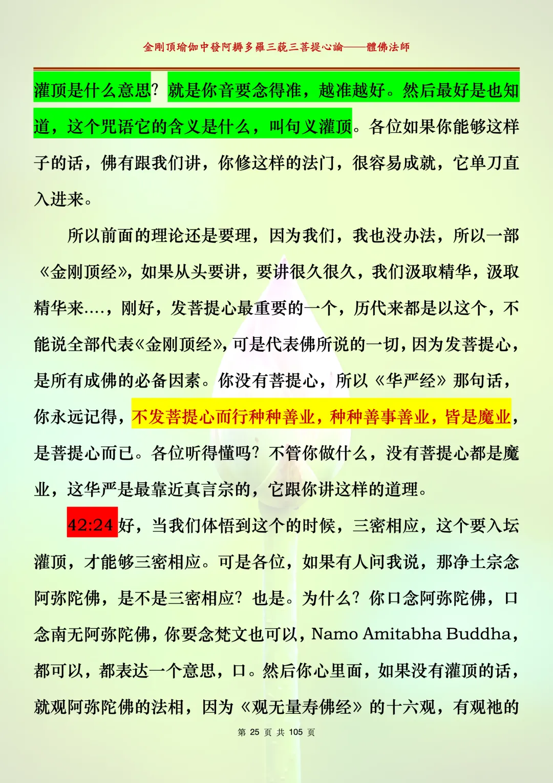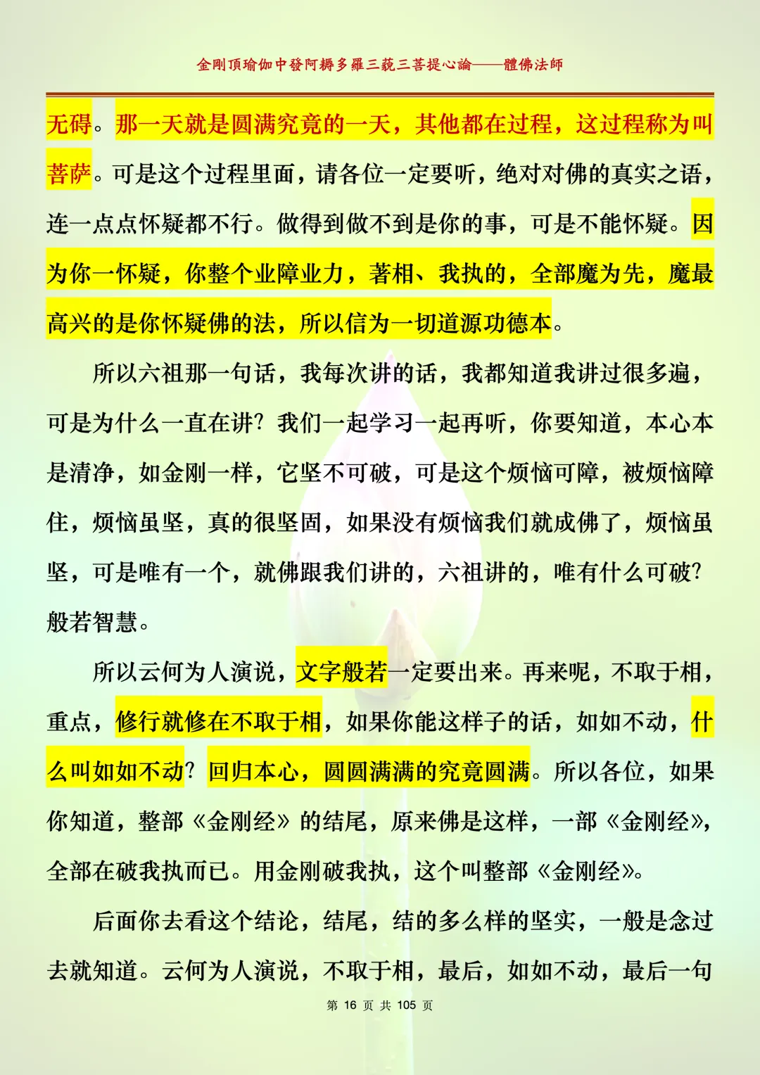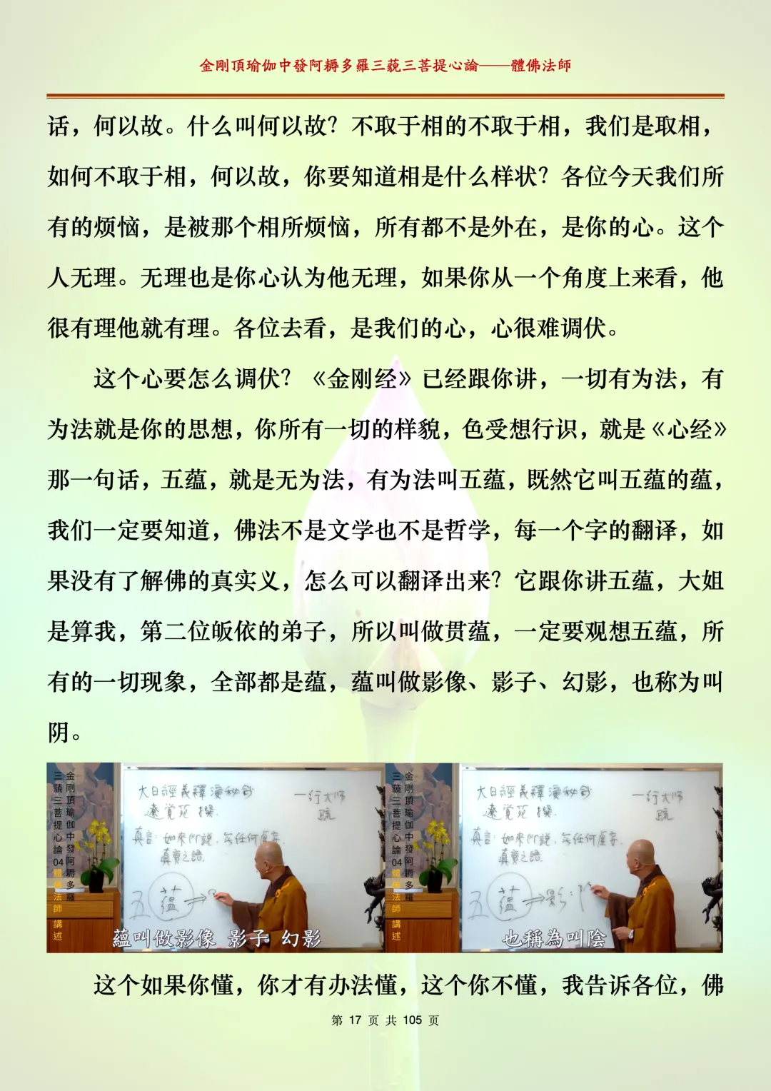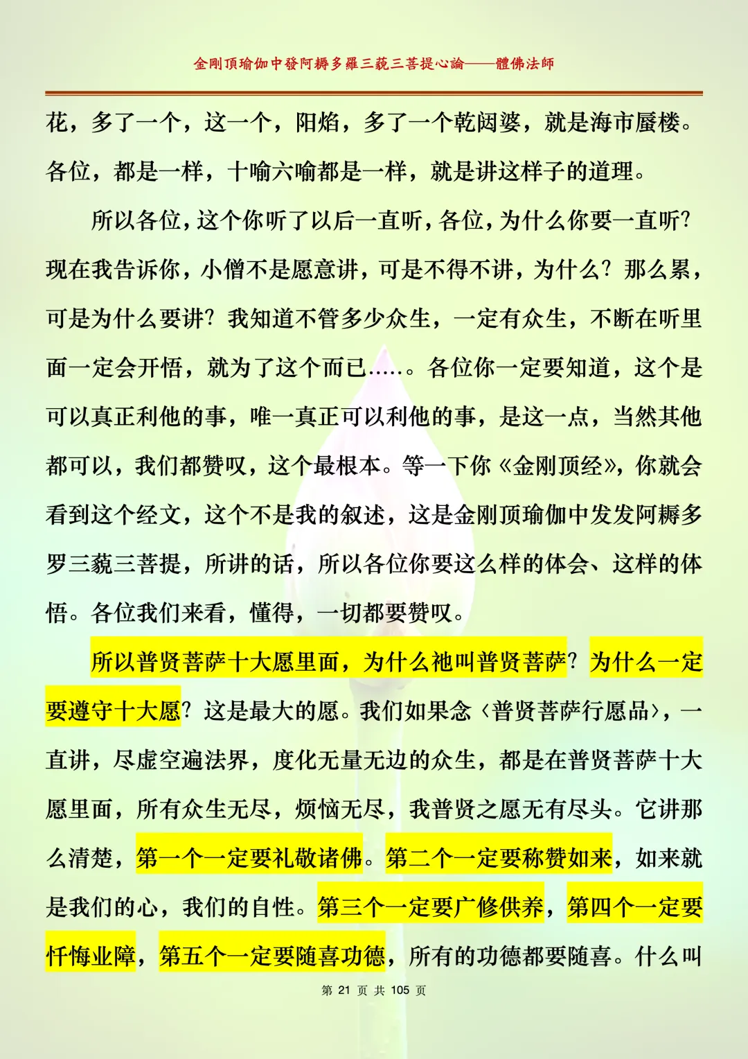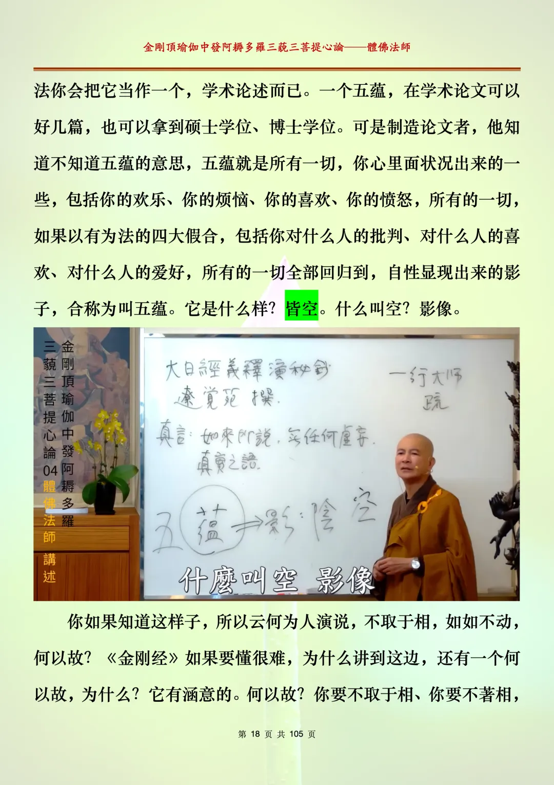 体佛法师讲解的《金刚顶瑜伽中发阿耨多罗三藐三菩提心论》讲义,文字文档分享,是严格按照视频所讲,一句一句校对而整理,不出自禅院、不出自任何团队,也非视频转换软件提取的文字,最大限度的避免错字、错句的出现,所有标注颜色的地方,是个人依据法师的视频讲义学习的个人感悟所标注,不代表就非是重点。因为每个人的根基不同,体悟自然不同。每一节课分成二段或者三段,依次分享。