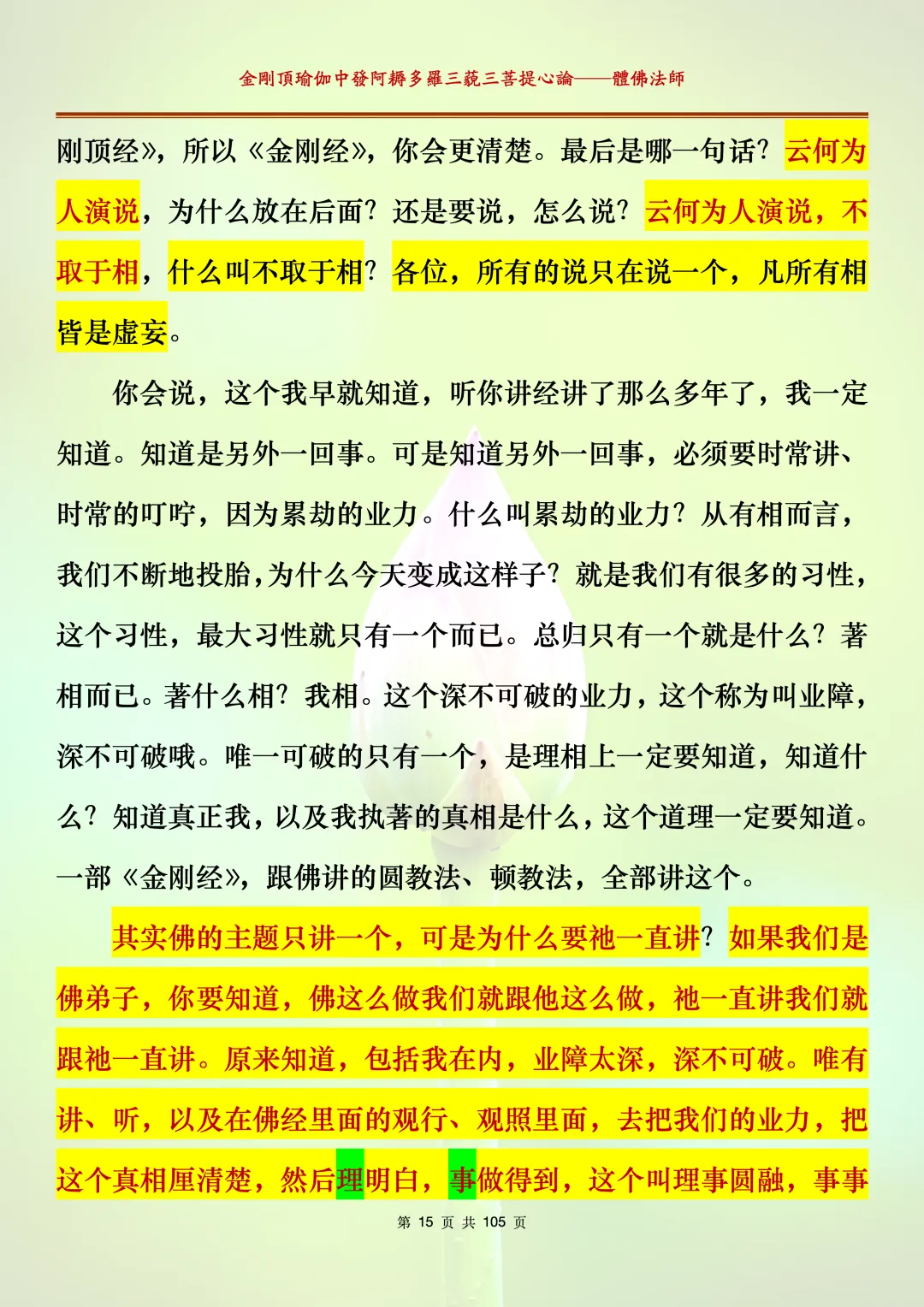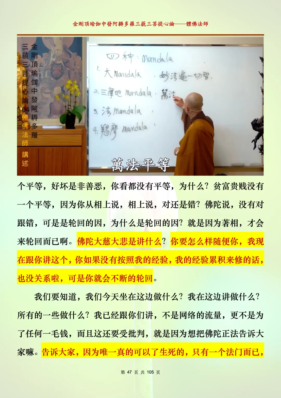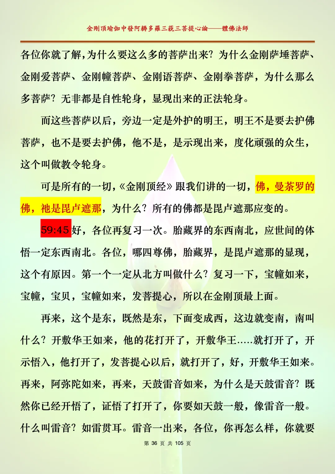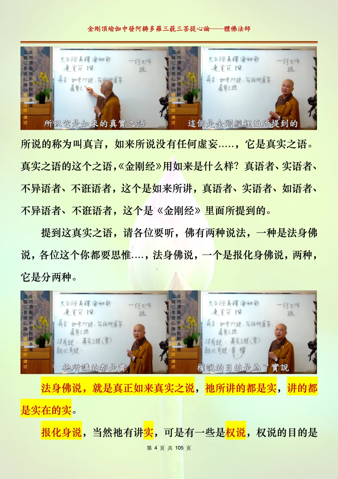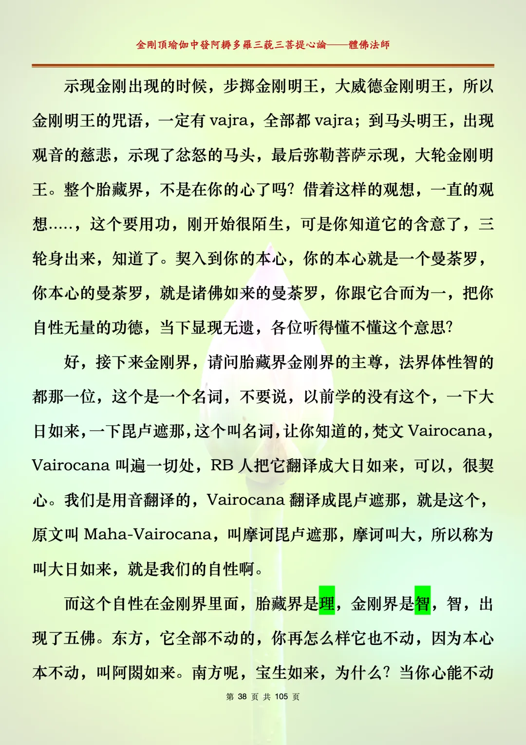 体佛法师讲解的《金刚顶瑜伽中发阿耨多罗三藐三菩提心论》讲义,文字文档分享,是严格按照视频所讲,一句一句校对而整理,不出自禅院、不出自任何团队,也非视频转换软件提取的文字,最大限度的避免错字、错句的出现,所有标注颜色的地方,是个人依据法师的视频讲义学习的个人感悟所标注,不代表就非是重点。因为每个人的根基不同,体悟自然不同。每一节课分成二段或者三段,依次分享。