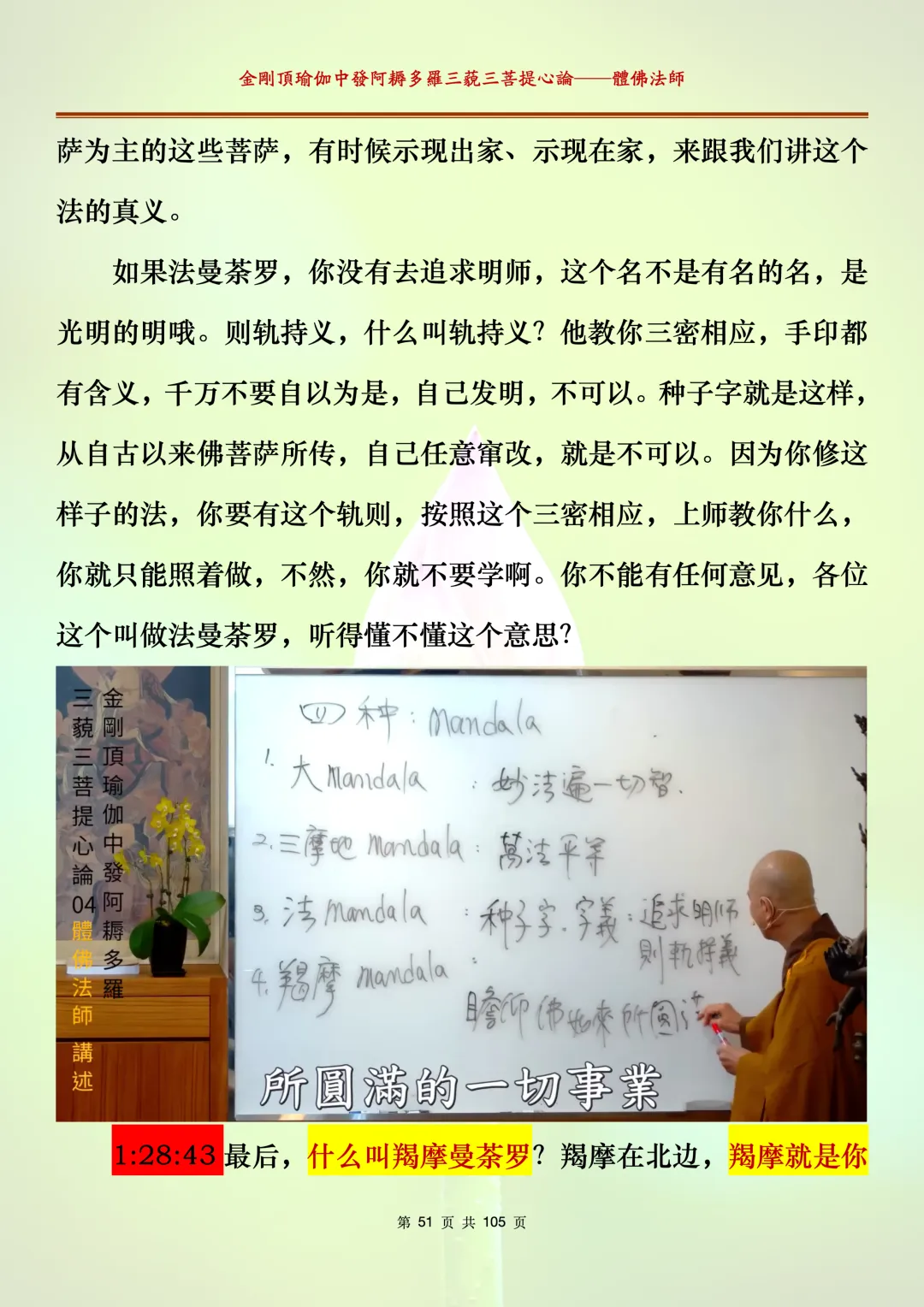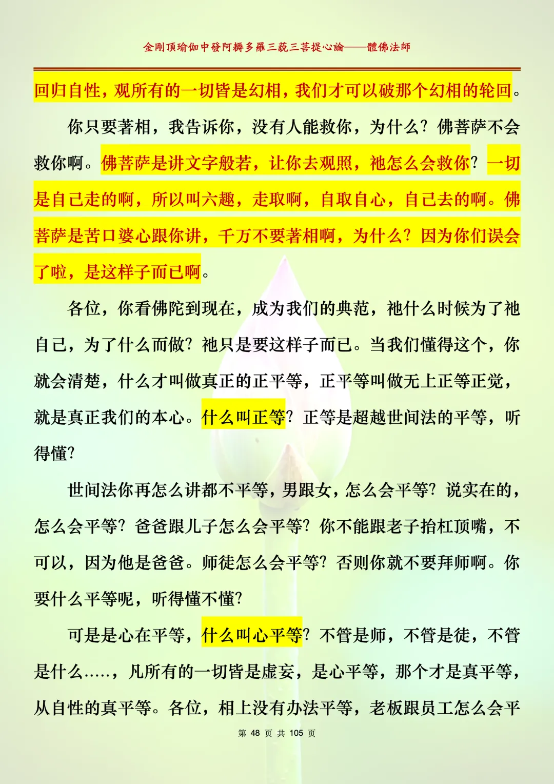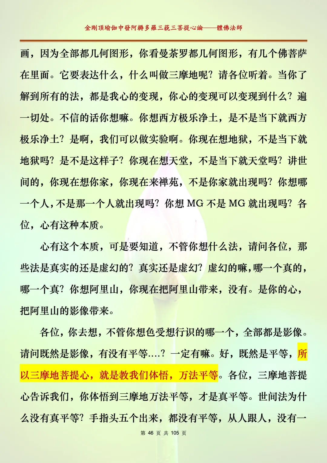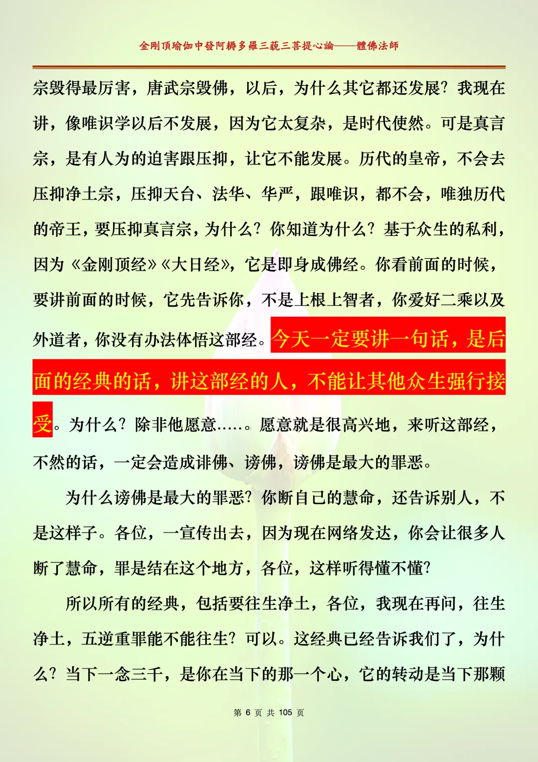 体佛法师讲解的《金刚顶瑜伽中发阿耨多罗三藐三菩提心论》讲义,文字文档分享,是严格按照视频所讲,一句一句校对而整理,不出自禅院、不出自任何团队,也非视频转换软件提取的文字,最大限度的避免错字、错句的出现,所有标注颜色的地方,是个人依据法师的视频讲义学习的个人感悟所标注,不代表就非是重点。因为每个人的根基不同,体悟自然不同。每一节课分成二段或者三段,依次分享。