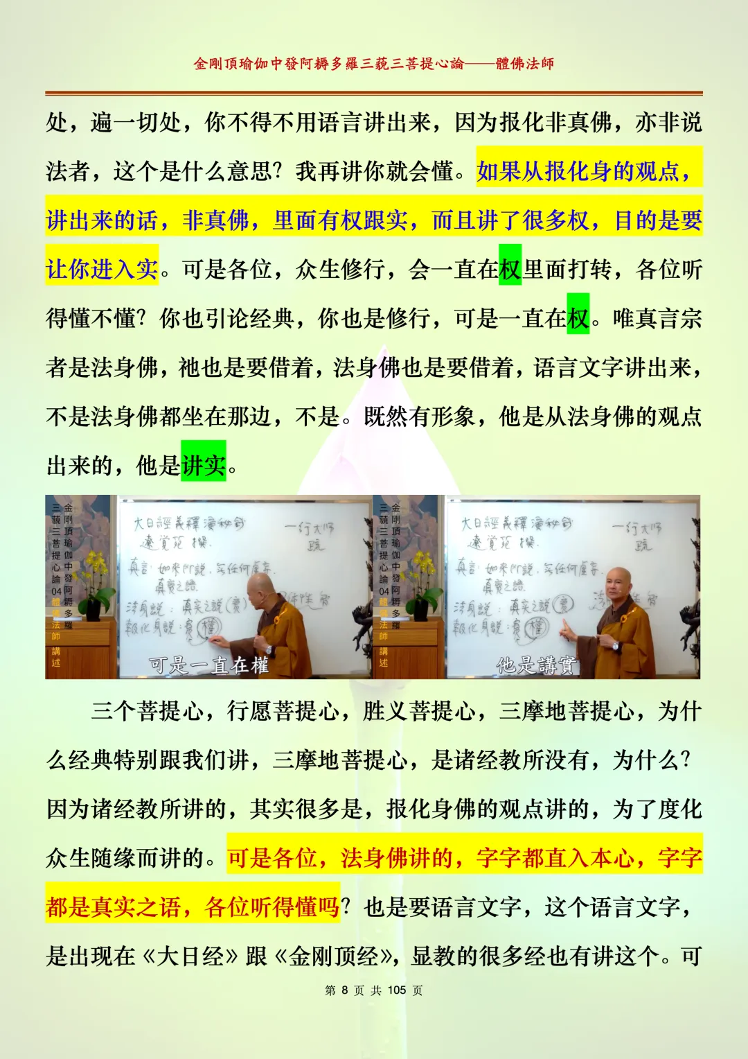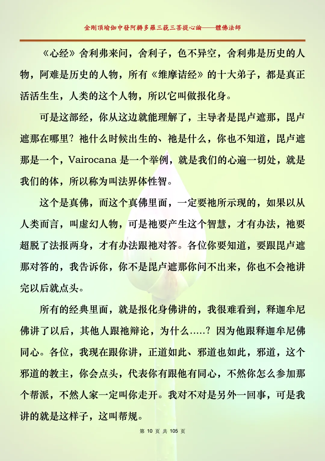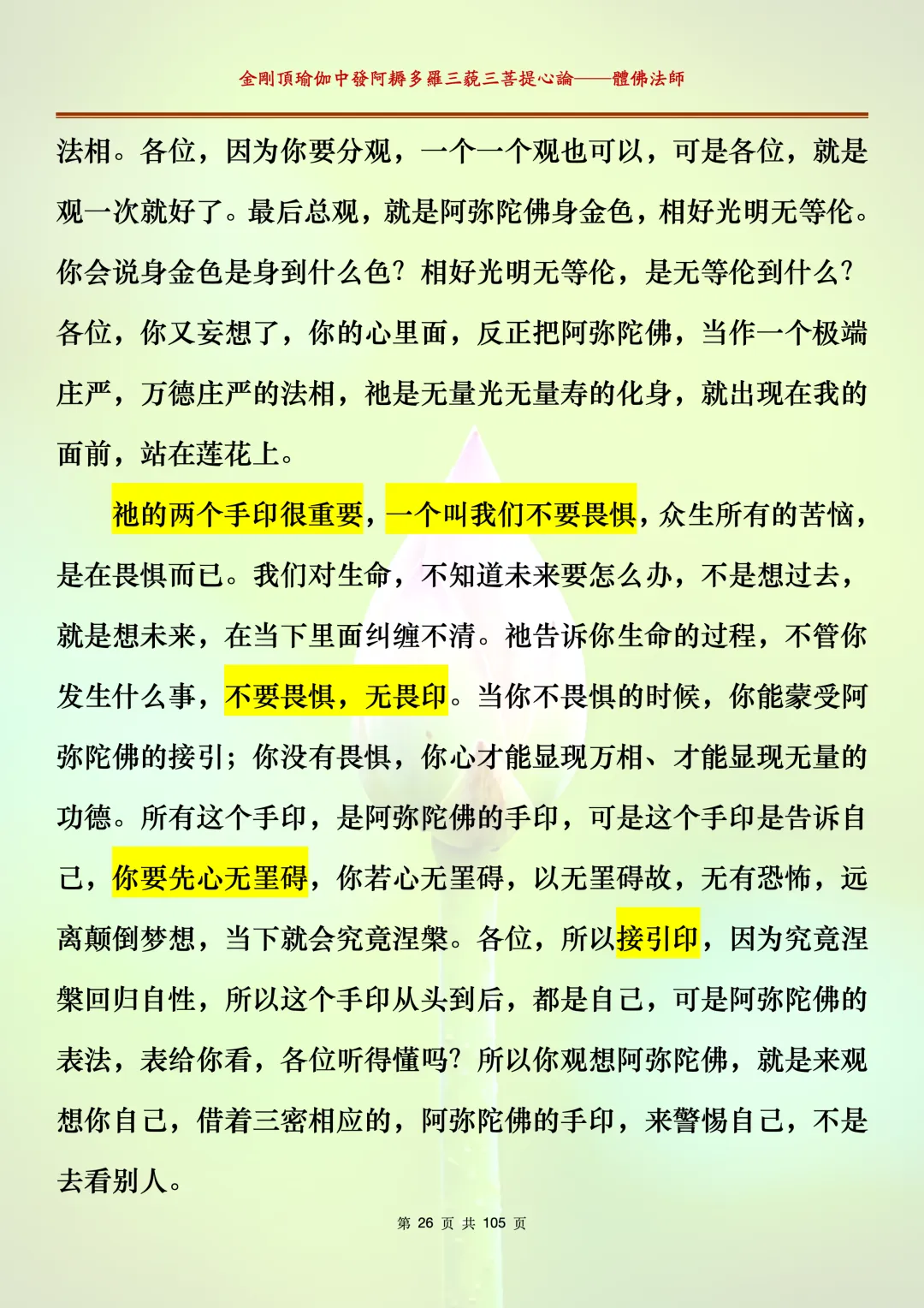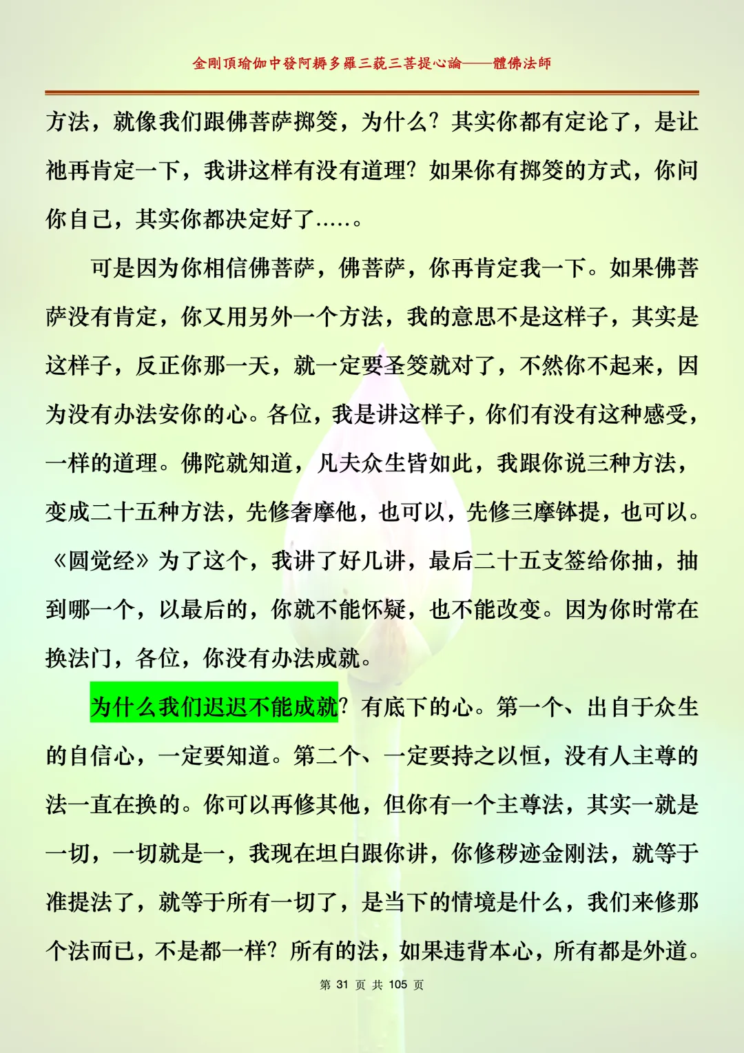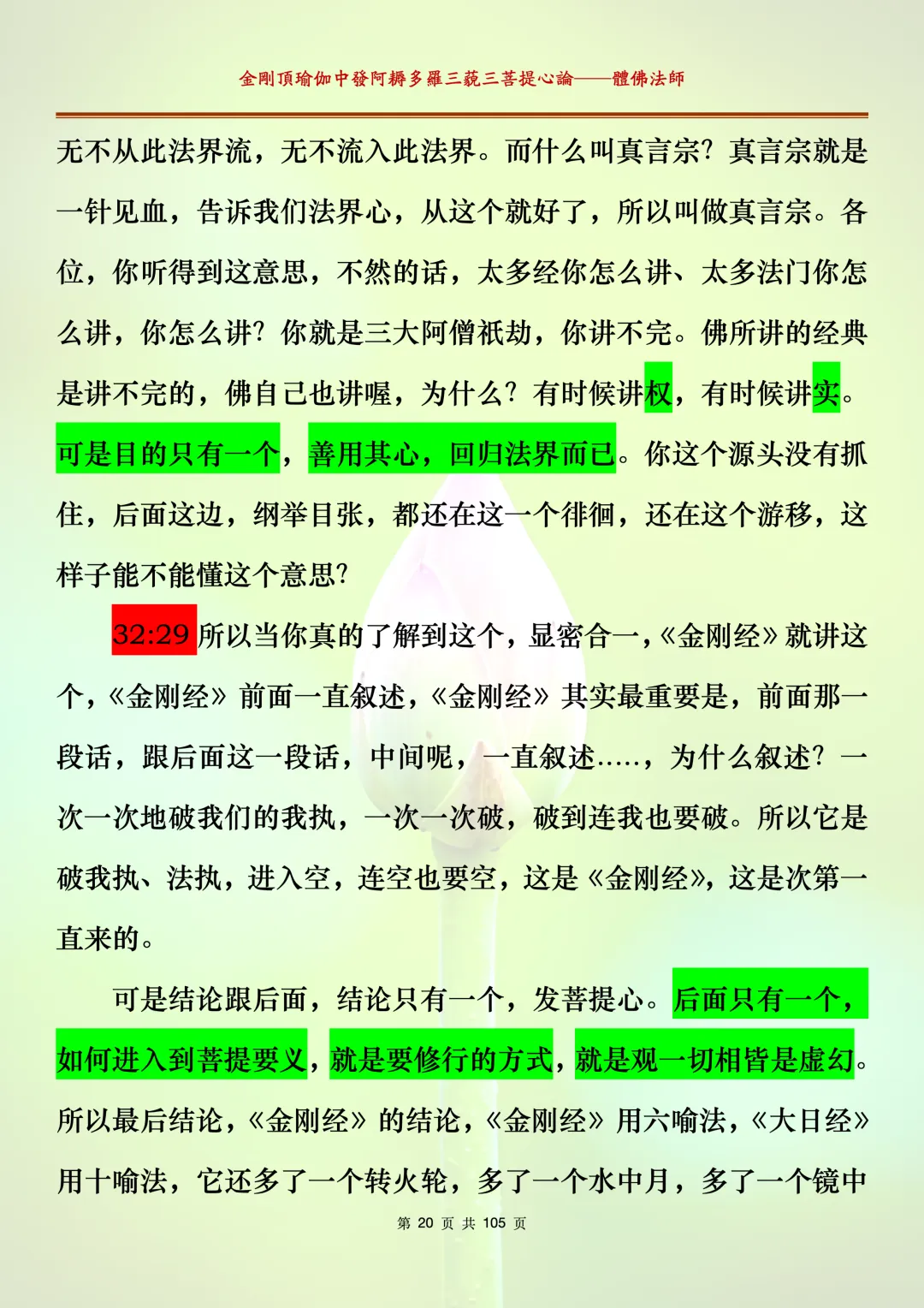 体佛法师讲解的《金刚顶瑜伽中发阿耨多罗三藐三菩提心论》讲义,文字文档分享,是严格按照视频所讲,一句一句校对而整理,不出自禅院、不出自任何团队,也非视频转换软件提取的文字,最大限度的避免错字、错句的出现,所有标注颜色的地方,是个人依据法师的视频讲义学习的个人感悟所标注,不代表就非是重点。因为每个人的根基不同,体悟自然不同。每一节课分成二段或者三段,依次分享。