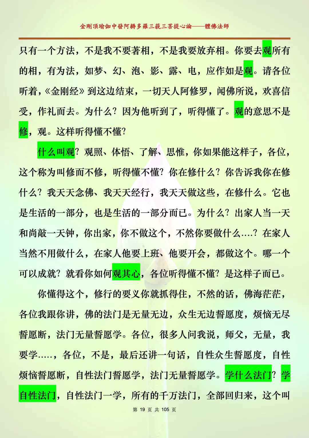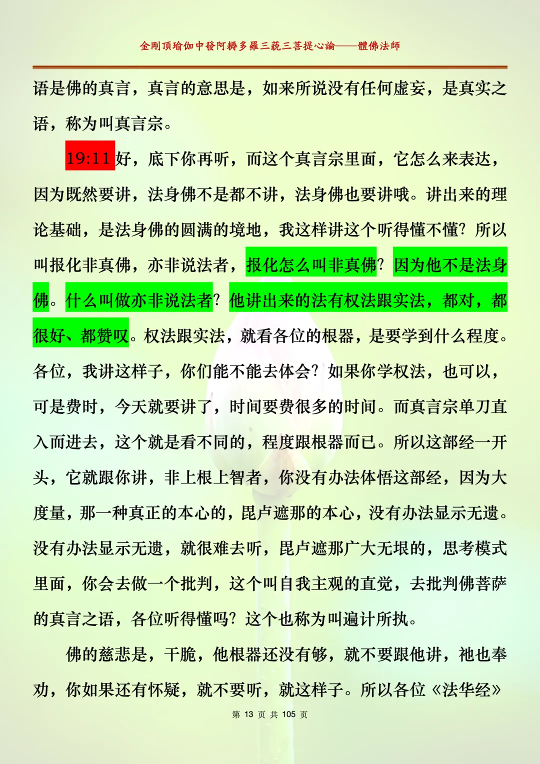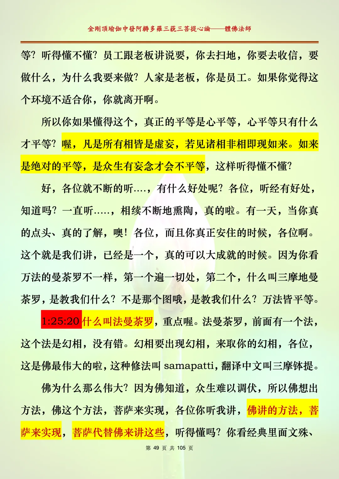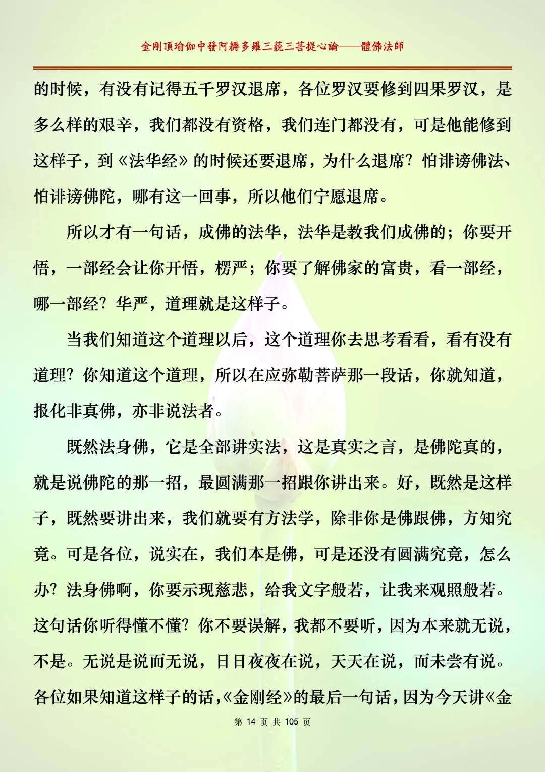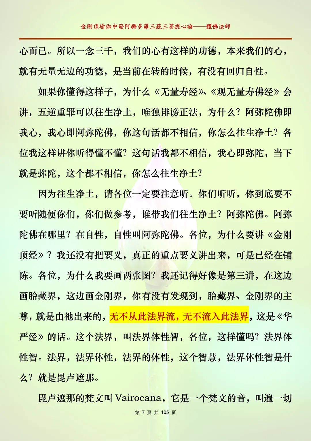 体佛法师讲解的《金刚顶瑜伽中发阿耨多罗三藐三菩提心论》讲义,文字文档分享,是严格按照视频所讲,一句一句校对而整理,不出自禅院、不出自任何团队,也非视频转换软件提取的文字,最大限度的避免错字、错句的出现,所有标注颜色的地方,是个人依据法师的视频讲义学习的个人感悟所标注,不代表就非是重点。因为每个人的根基不同,体悟自然不同。每一节课分成二段或者三段,依次分享。