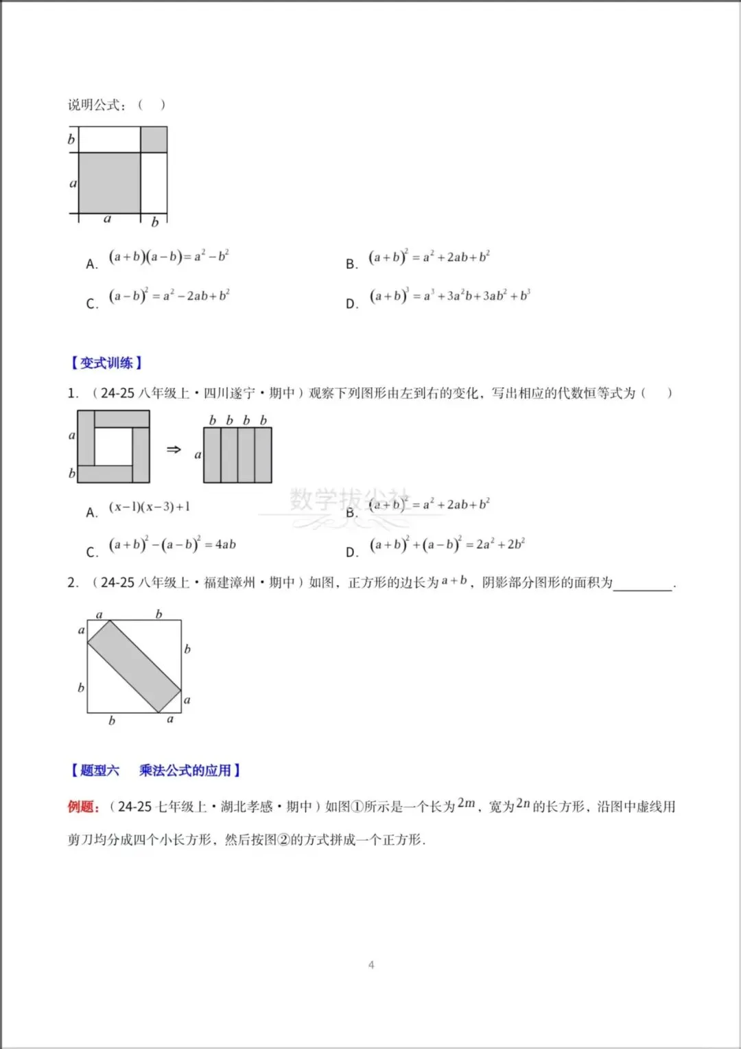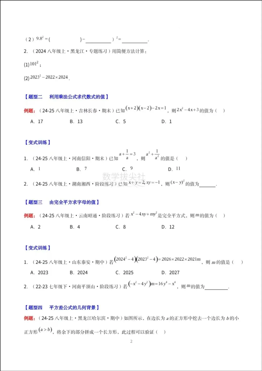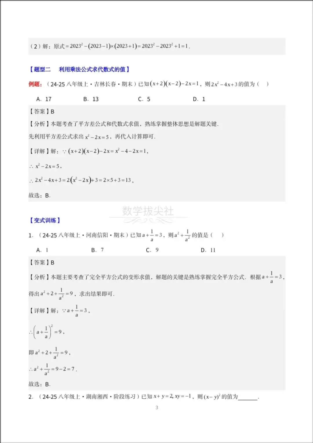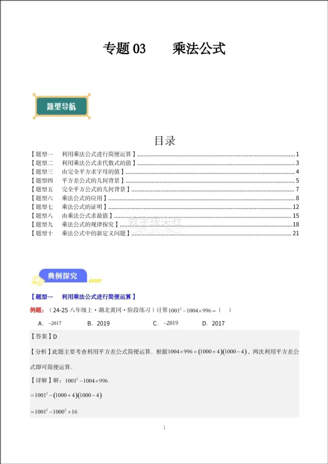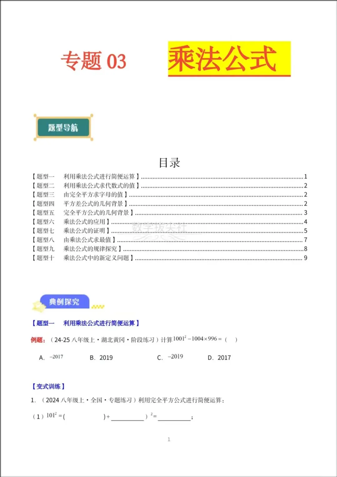 2026春新版教材【北师版】七年级下册〈数学〉专题《乘法公式》实验班培优过关训练(10种题型),有解析,可下载打印!