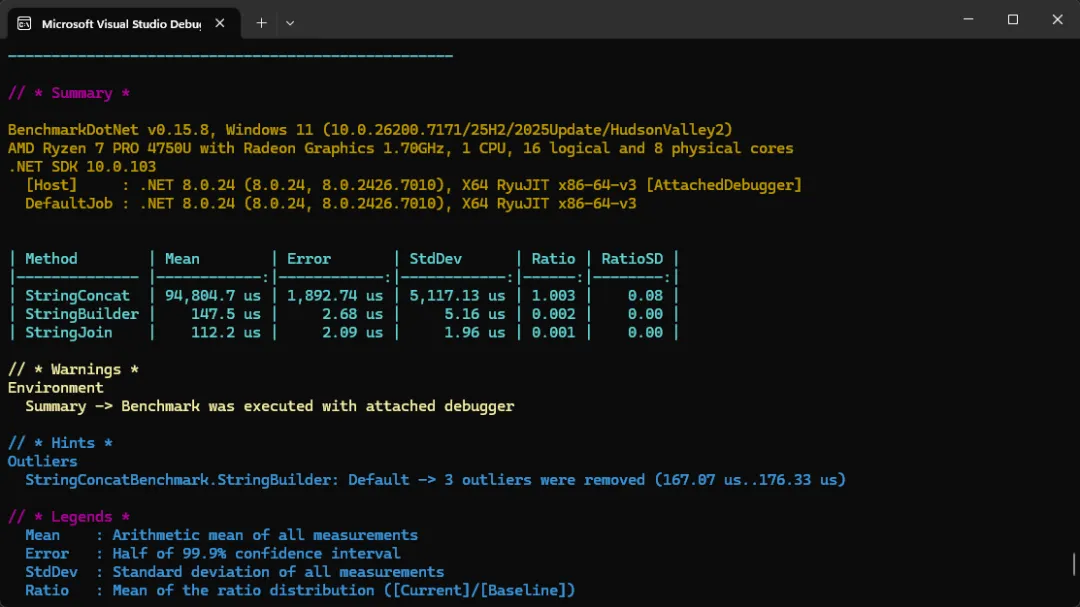 • 比StringConcat快约643倍(Ratio = 0.002) -
