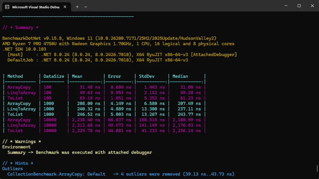 ⚠️ 确保项目运行在Release模式,否则BenchmarkDotNet会警告并拒绝运行