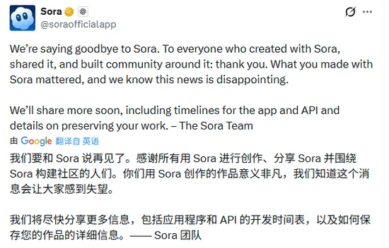 北京时间3月25日凌晨,OpenAI在社交媒体上发了一条帖子:“我们要和Sora说再见了。”