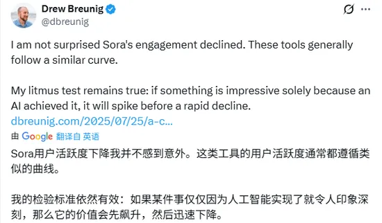 另一位X平台用户也精辟总结道,当一项事物仅仅因为“由AI实现”而令人称奇时,它的市场价值往往会经历一场过山车,在初见的惊叹中飙升,又因缺乏实际应用场景而迅速贬值。