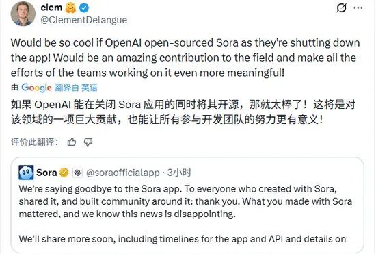 HuggingFace首席执行官克莱门特·德朗格(Clement Delangue)当天在社交媒体上表示,如果OpenAI能在关闭Sora的同时将其开源,那就太棒了,这将是对该领域的一项巨大贡献。