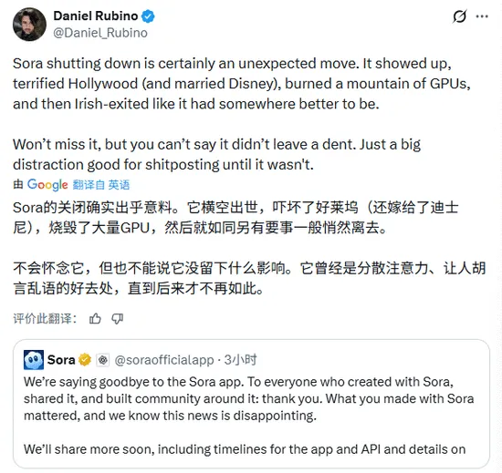 Windows Central主编丹尼尔·鲁比诺(Daniel Rubino)的评论则更加直接:“Sora的关闭确实出乎意料。它横空出世,吓坏了好莱坞,还嫁给了迪士尼,烧毁了大量GPU,然后就如同另有要事一般悄然离去。不会怀念它,但也不能说它没留下什么影响。”
