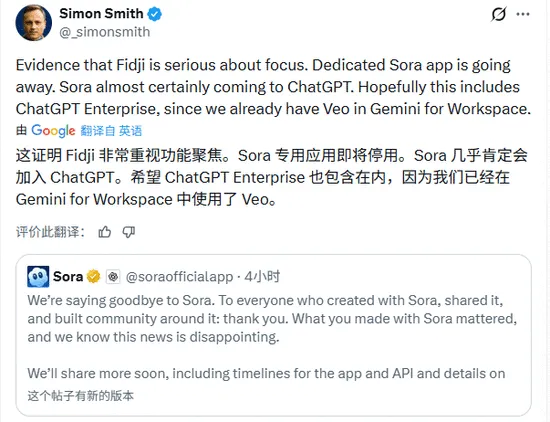 专注健康领域的AI公司Klick Health执行副总裁西蒙·史密斯(Simon Smith)在社交媒体上评论说,这证明菲吉·西莫非常重视功能聚焦。Sora专用应用即将停用,但几乎肯定会作为底层能力加入ChatGPT,希望ChatGPT Enterprise也包含在内,因为他们的团队已经在Gemini for Workspace中使用了Veo。