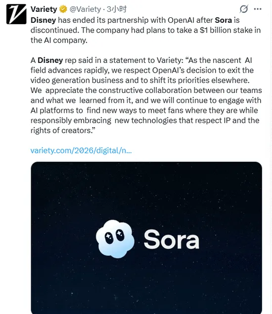 但知情人士后来透露,这笔交易从未真正落地。随着OpenAI开始调整战略方向,迪士尼的10亿美元一直没有到账。一位内部人士称,迪士尼仍在“讨论和探索AI技术”,但Sora这边的合作已经实质性停摆。