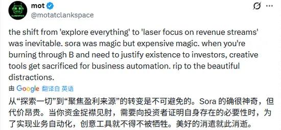 一位X平台用户说得更直白,Sora的收缩揭示了AI行业一个残酷的生存逻辑,从“无尽探索”向“聚焦盈利”的转向是商业化的必然。尽管视觉奇观令人惊叹,但在高昂的算力成本与捉襟见肘的现金流面前,大模型公司必须向投资者证明其生存价值。