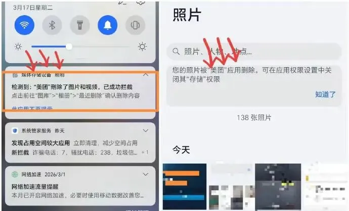 外卖APP竟能删除用户照片?你的手机相册可能正被美团 “清空” !赶紧去关闭手机里面美团访问相册的权限,否则珍藏多年的照片很有可能就要被美团一次性全部清空了。