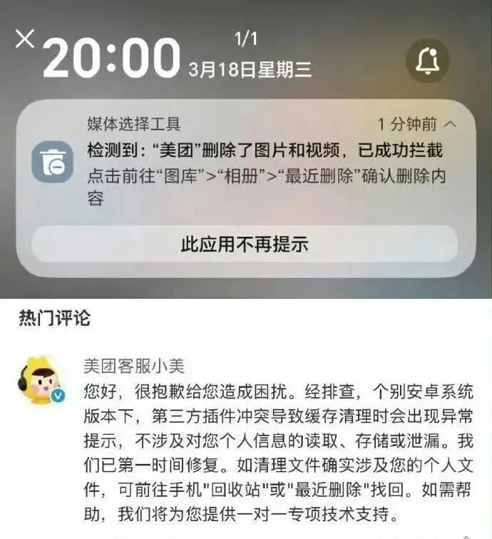 美团删除照片这个话题突然上了热搜,才发现过去几天的时间包括了华为、荣耀、小米、OPPO、vivo 在内所有的手机厂商都遇到了类似的情况。